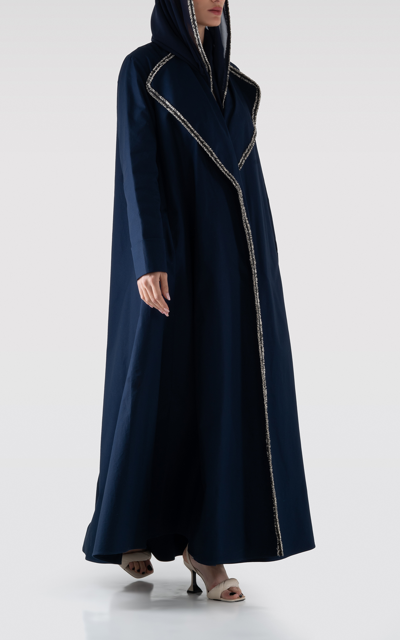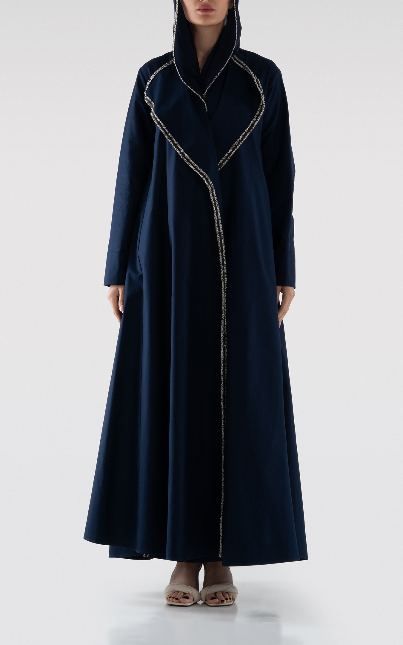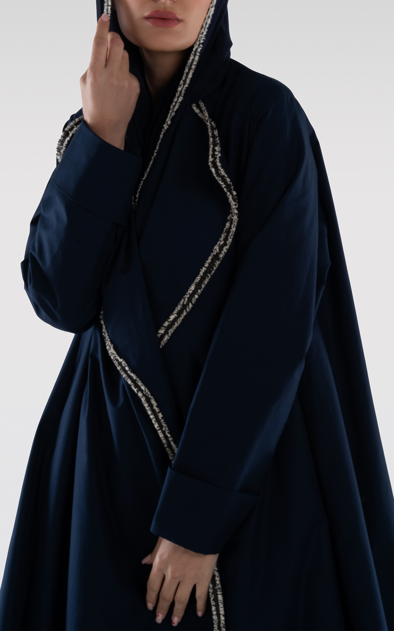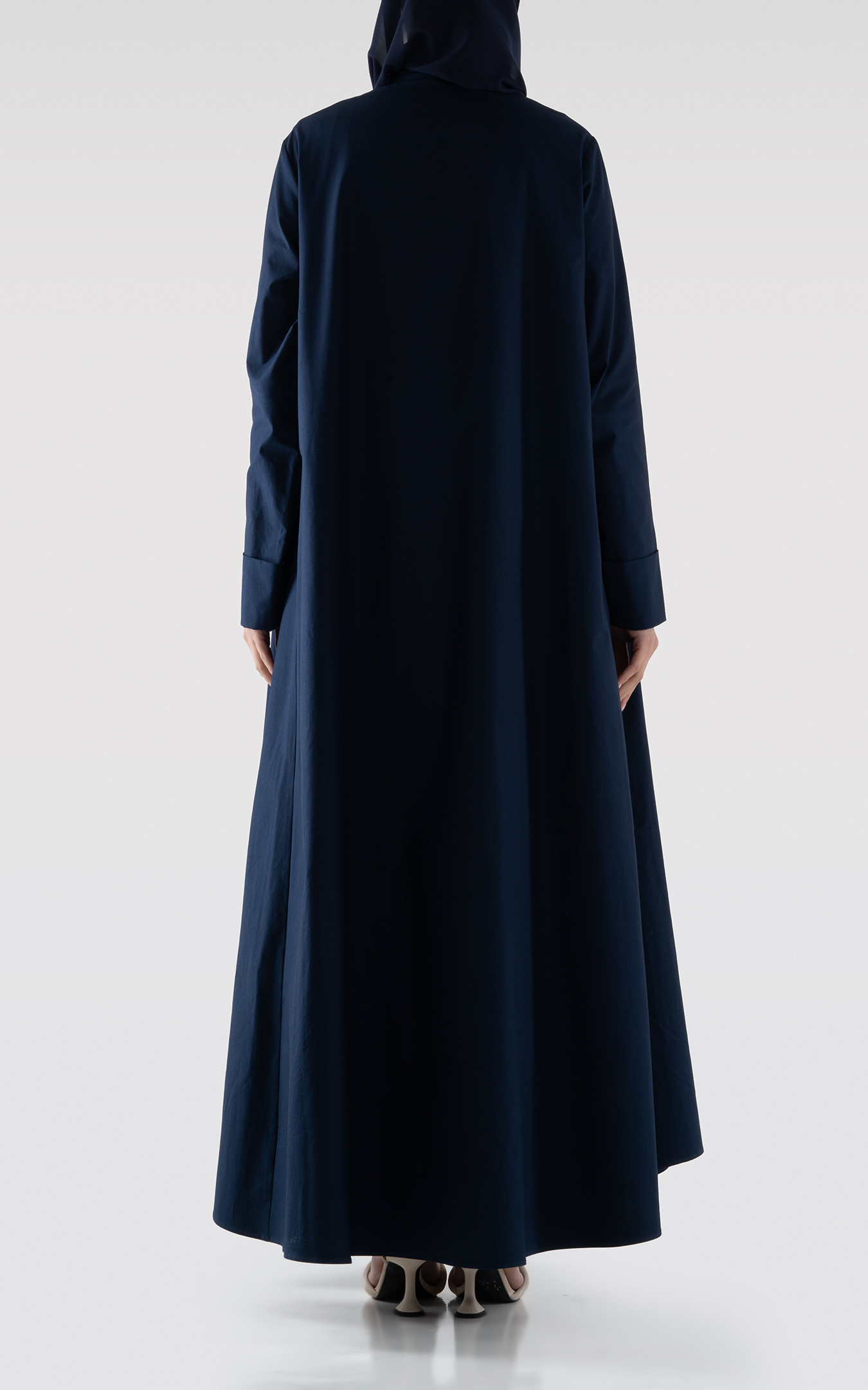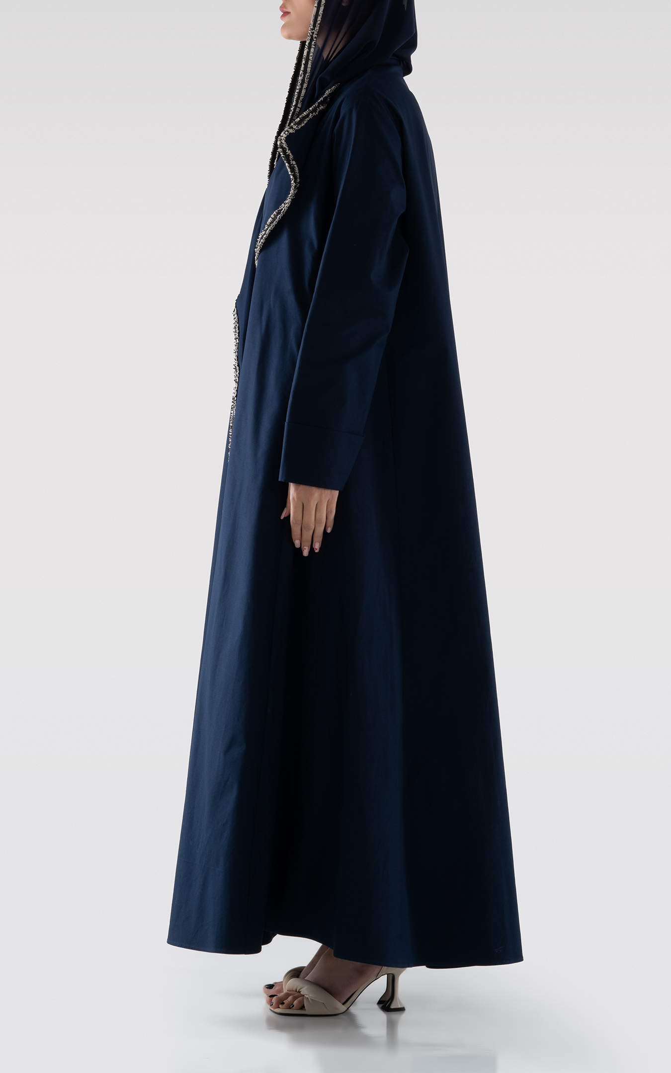 عباية من القطن بقصة واسعة باللون الكحلي. ياقة عريضة بتفاصيل على الحواف. جيوب جانبية. تأتي مع طرحة.