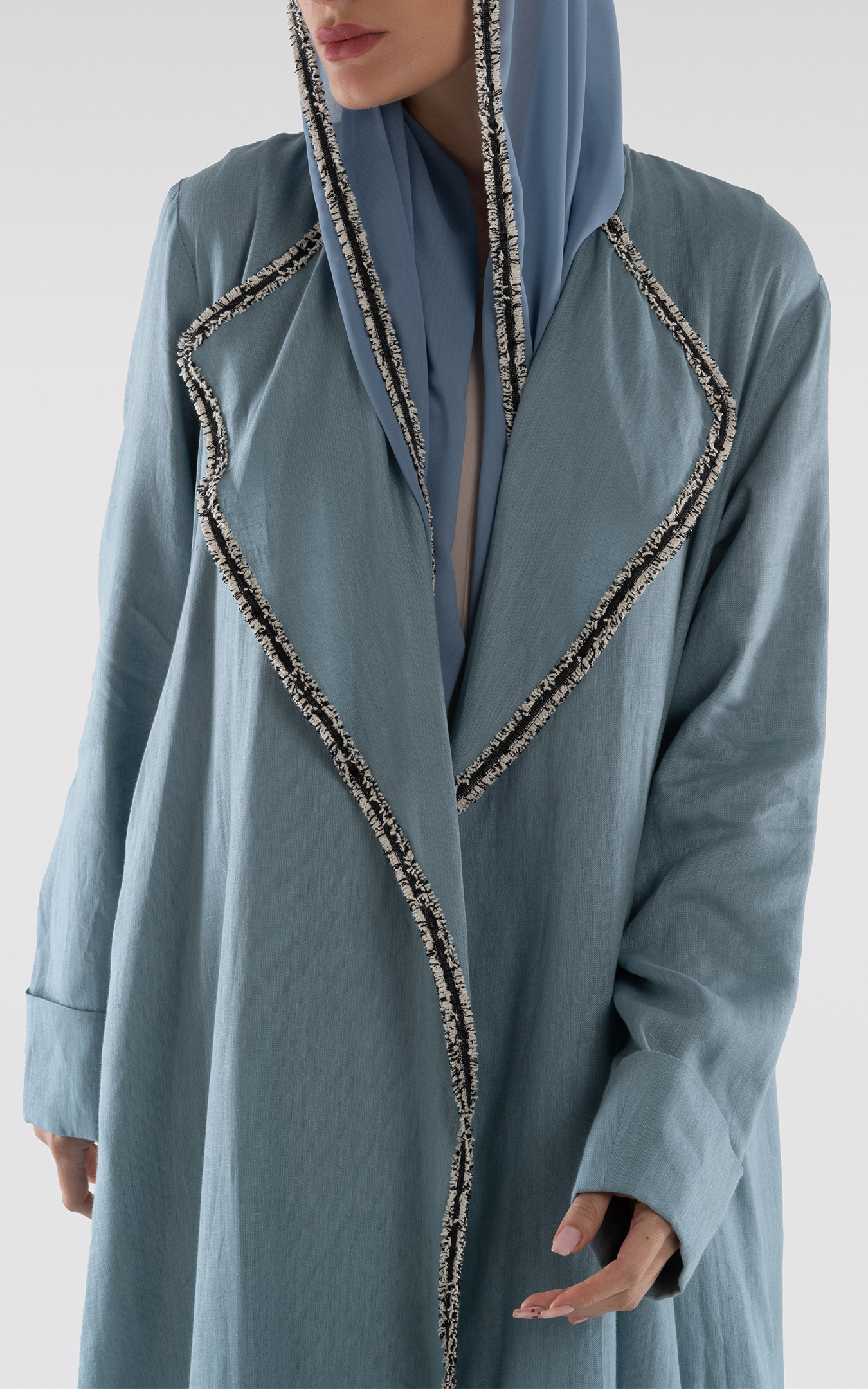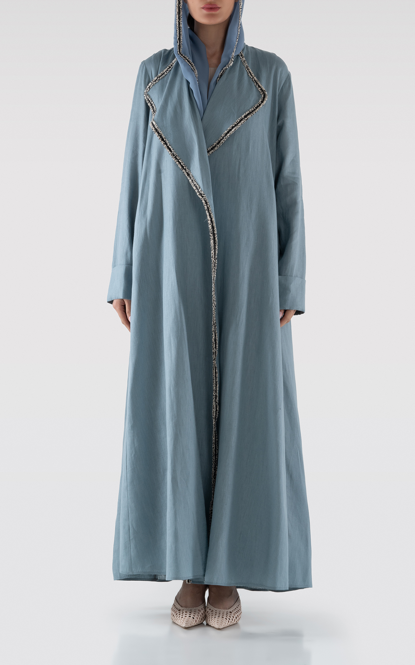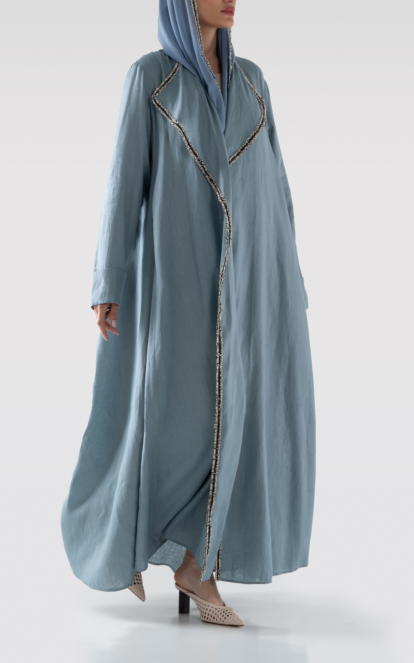 عباية من الكتان الخفيف بقصة واسعة باللون الأزرق السماوي. ياقة عريضة بتفاصيل على الحواف. جيوب جانبية. تأتي مع طرحة.