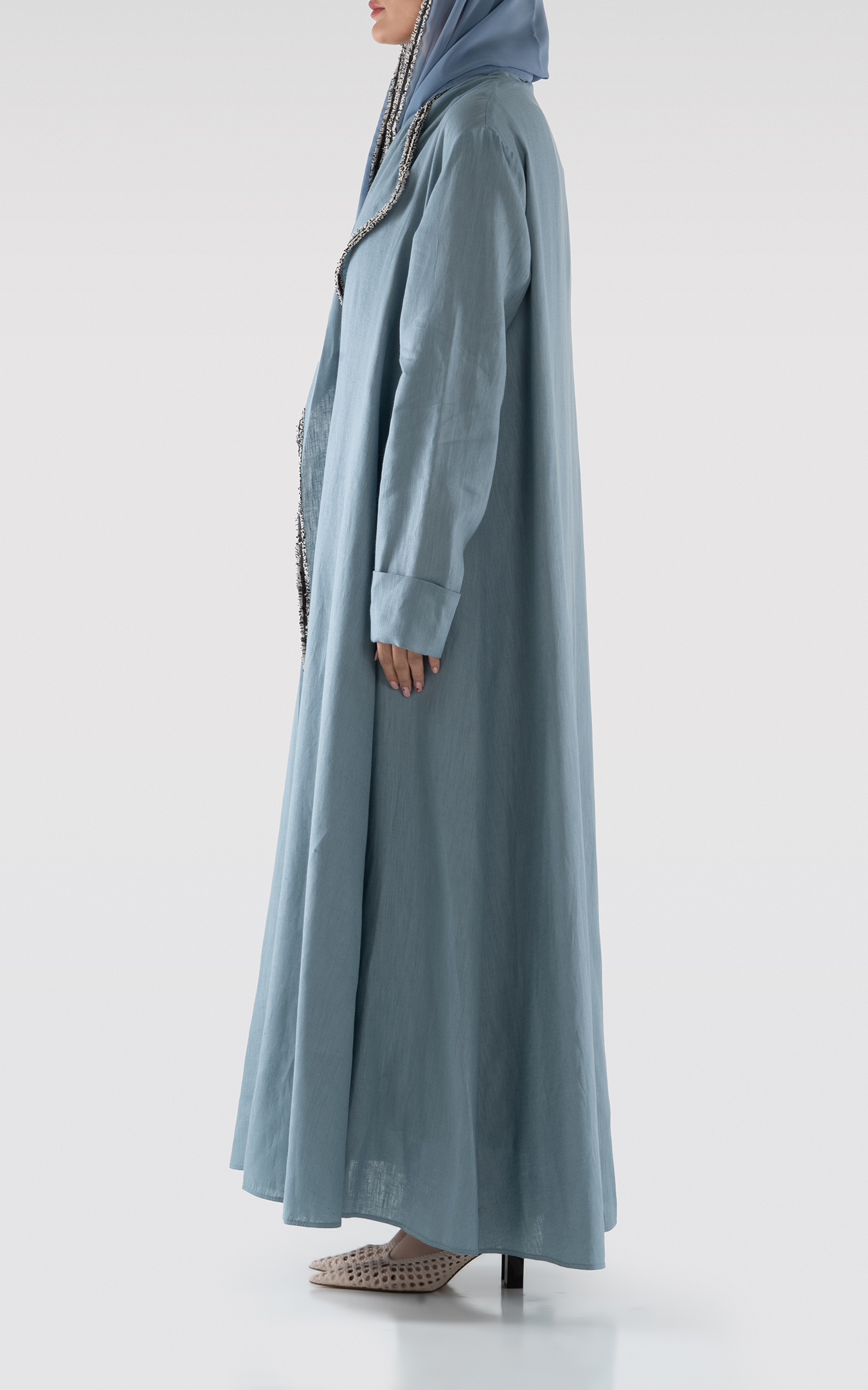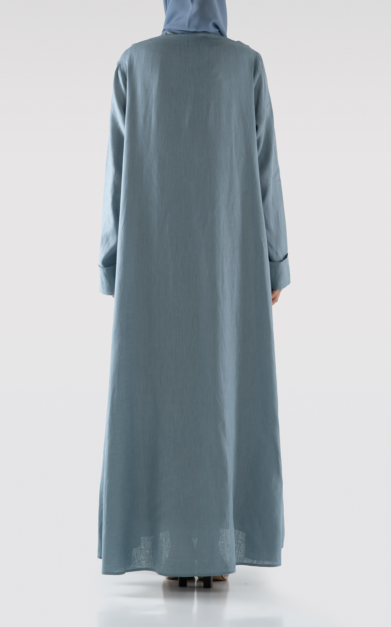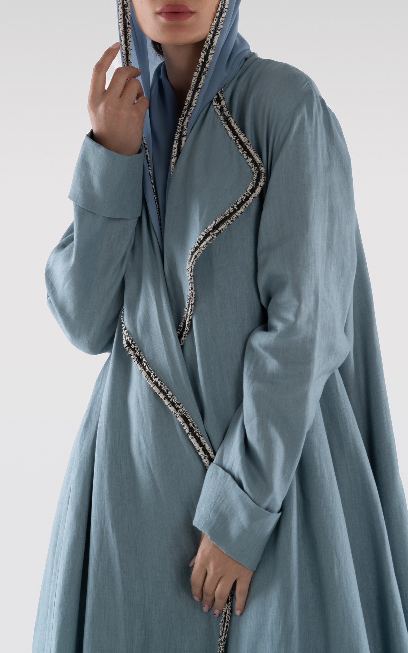 عباية من الكتان الخفيف بقصة واسعة باللون الأزرق السماوي. ياقة عريضة بتفاصيل على الحواف. جيوب جانبية. تأتي مع طرحة.