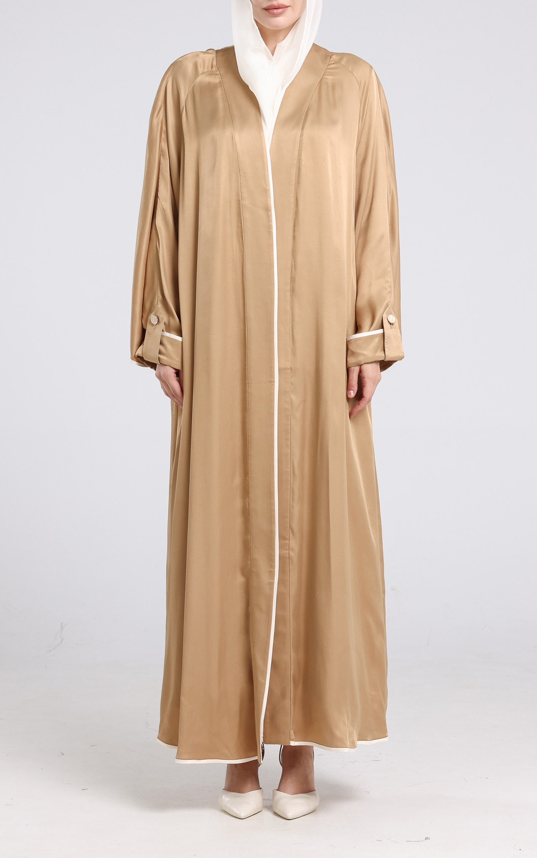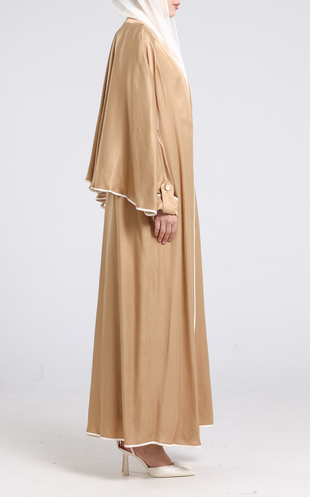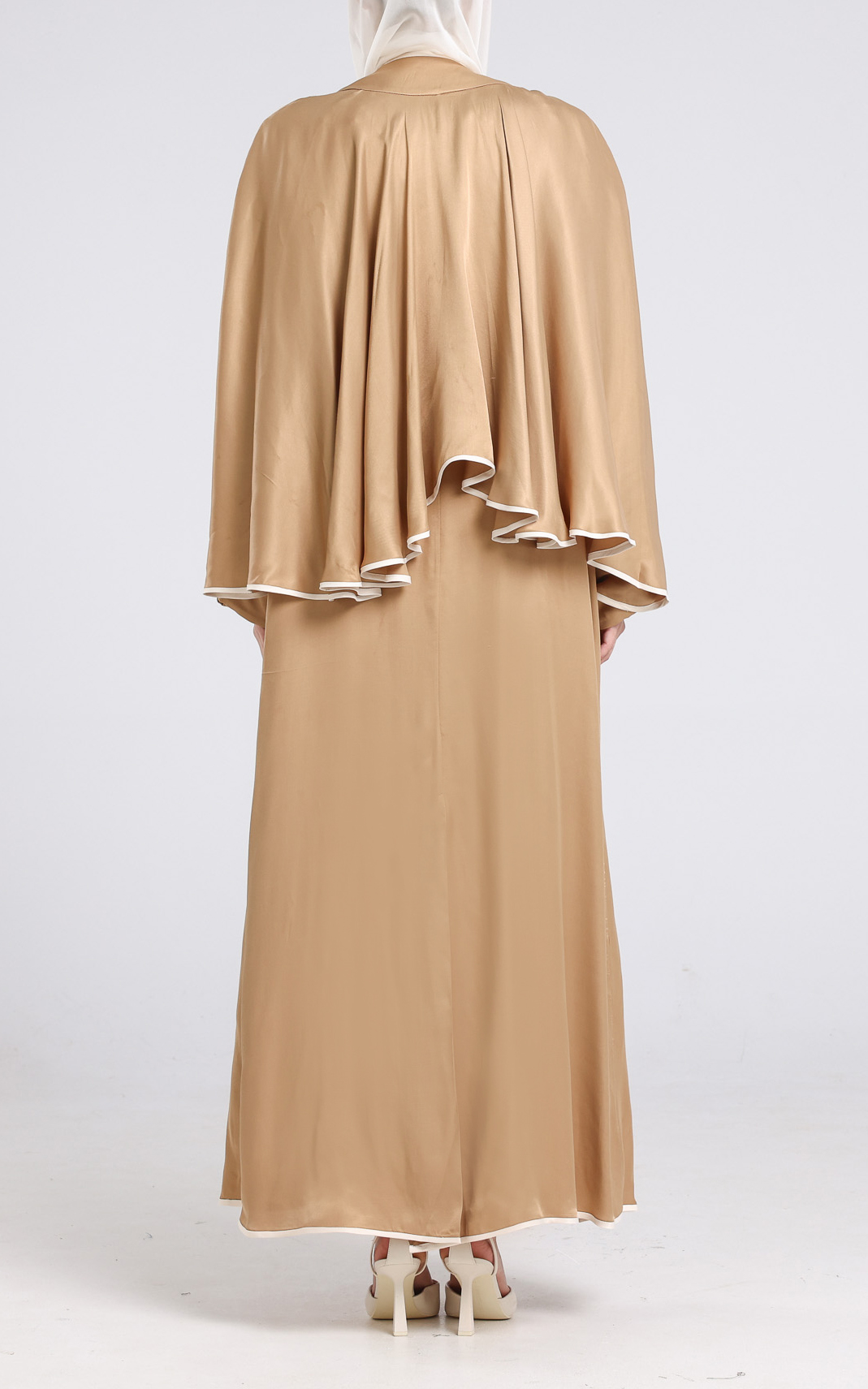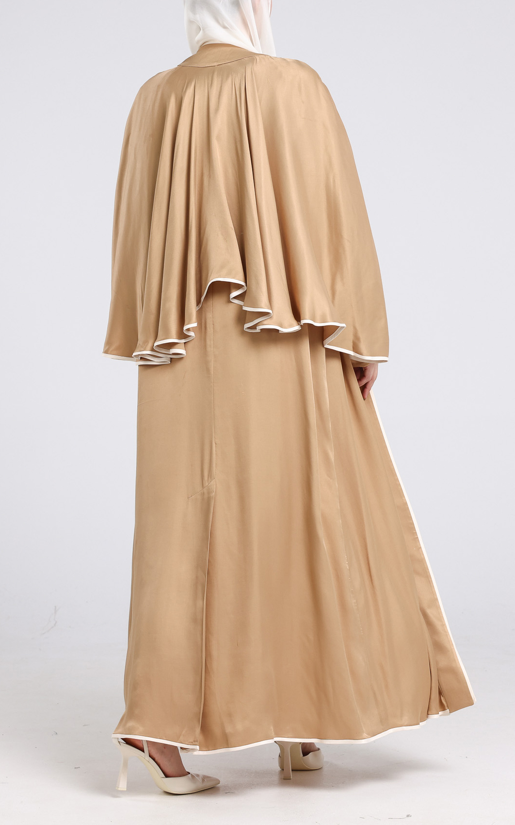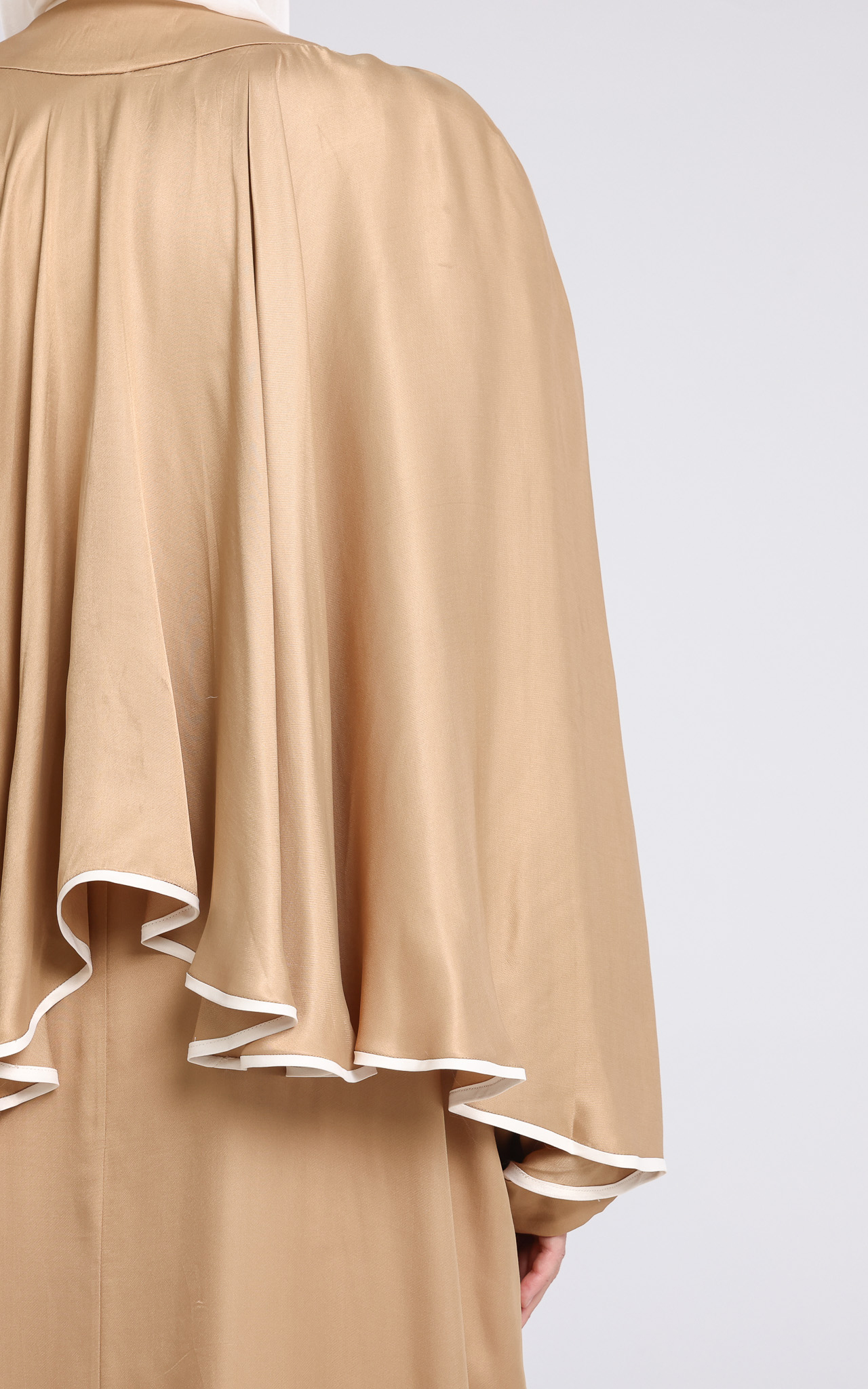 عباية بيج بحواف كريمية، بتفاصيل فريدة علي الأكتاف الظهر. أزرار على الأكمام. تأتي مع وشاح.