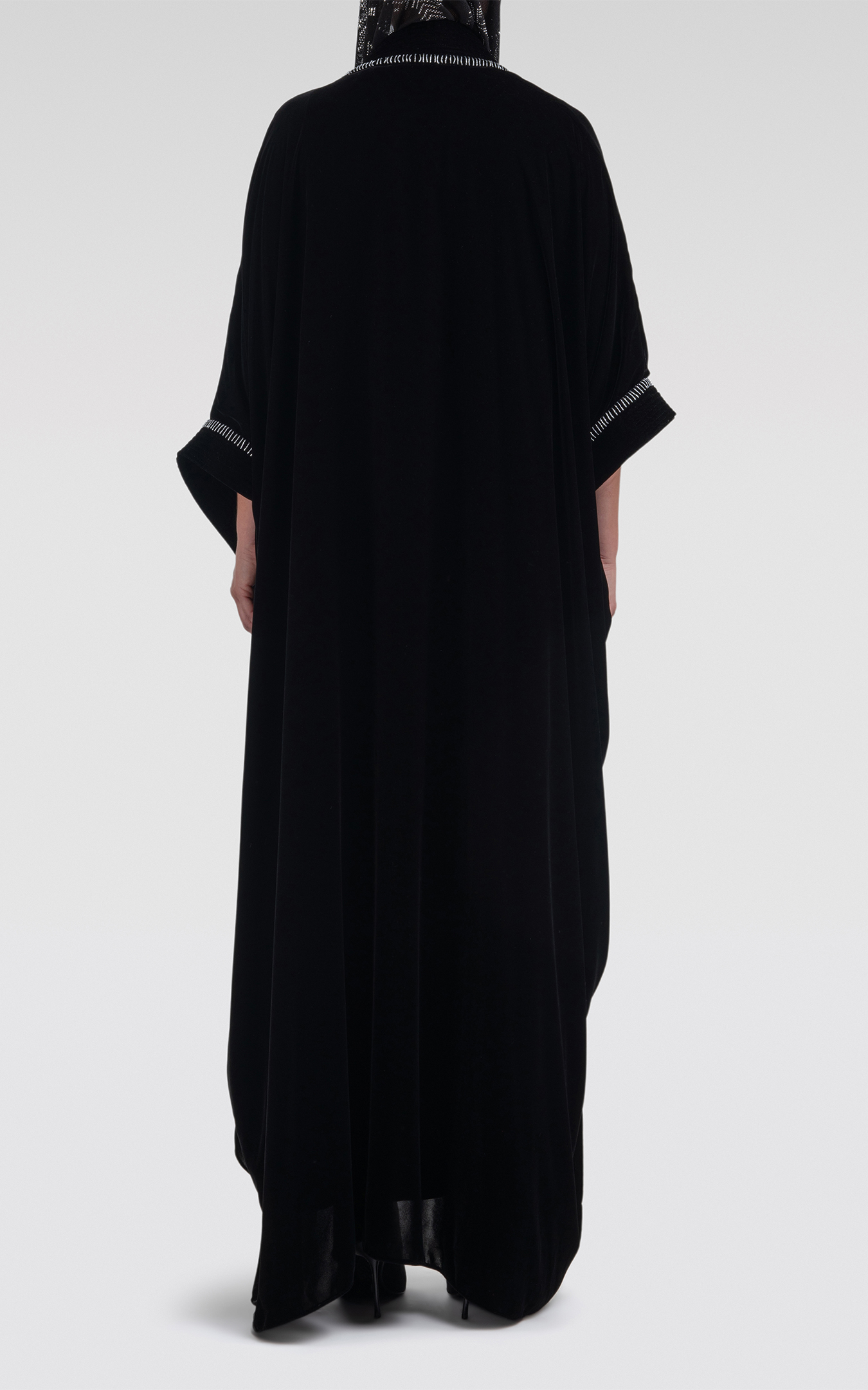 عباية بقصّة بشت باللون الأسود، مصنوعة من أجود أنواع القماش المخملي، تطريز باللون الفضي على الأكمام. يأتي مع وشاح أسود مميز مطرز يدوياً باللون الفضي مع هدب على كل جانب من الوشاح.