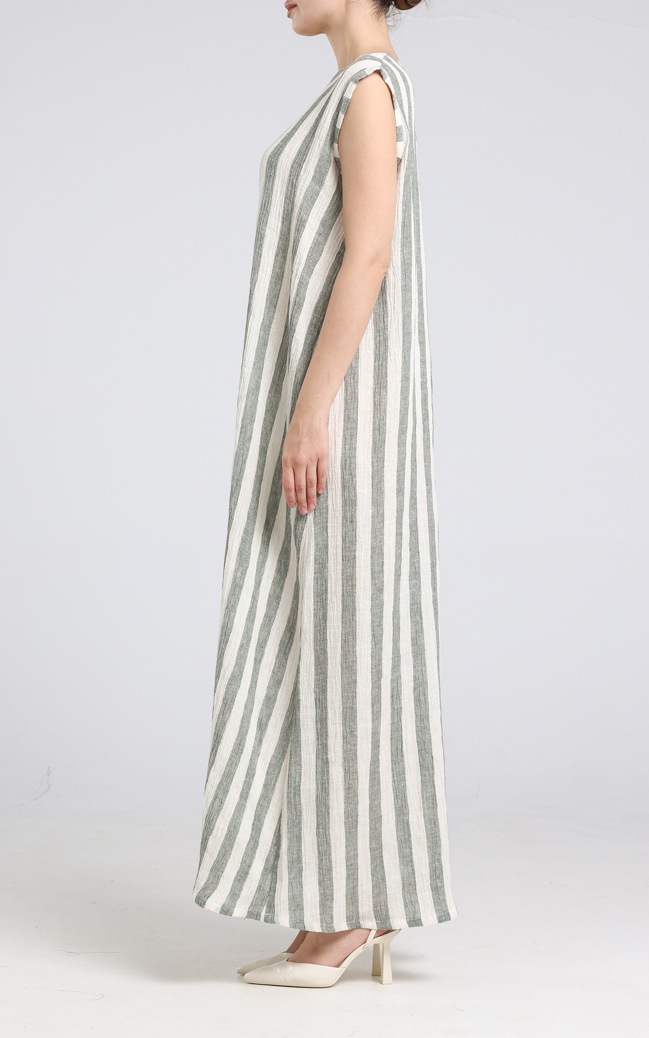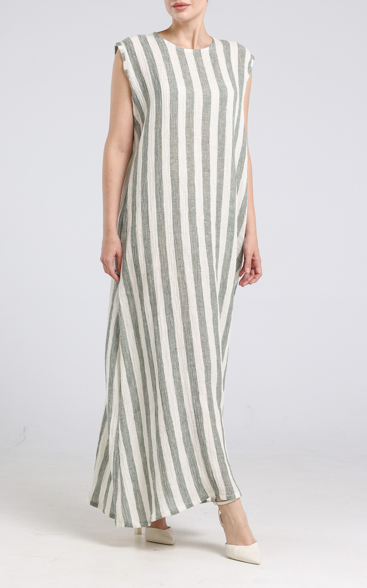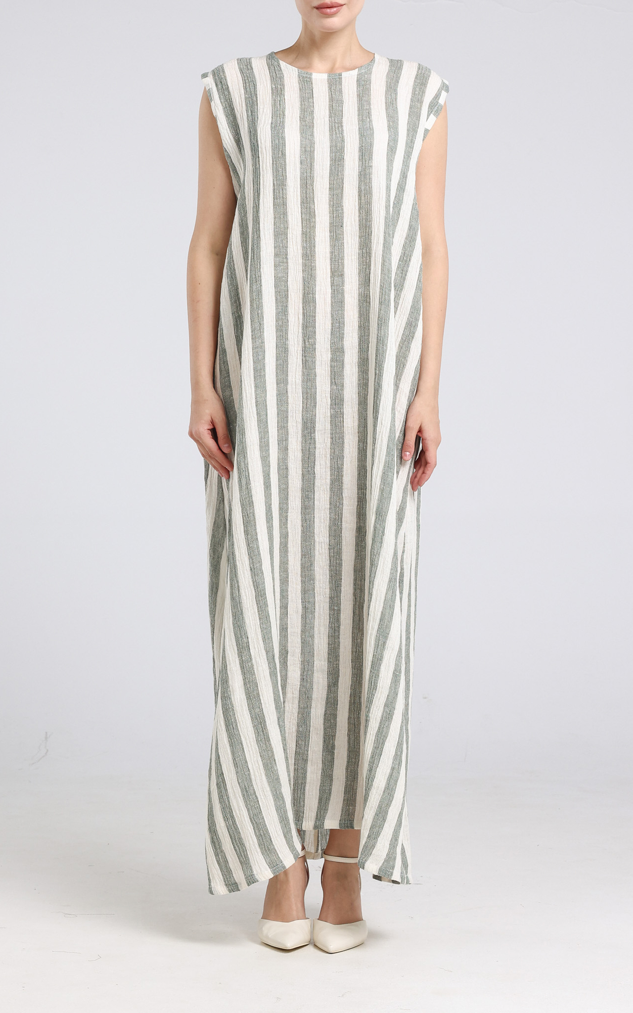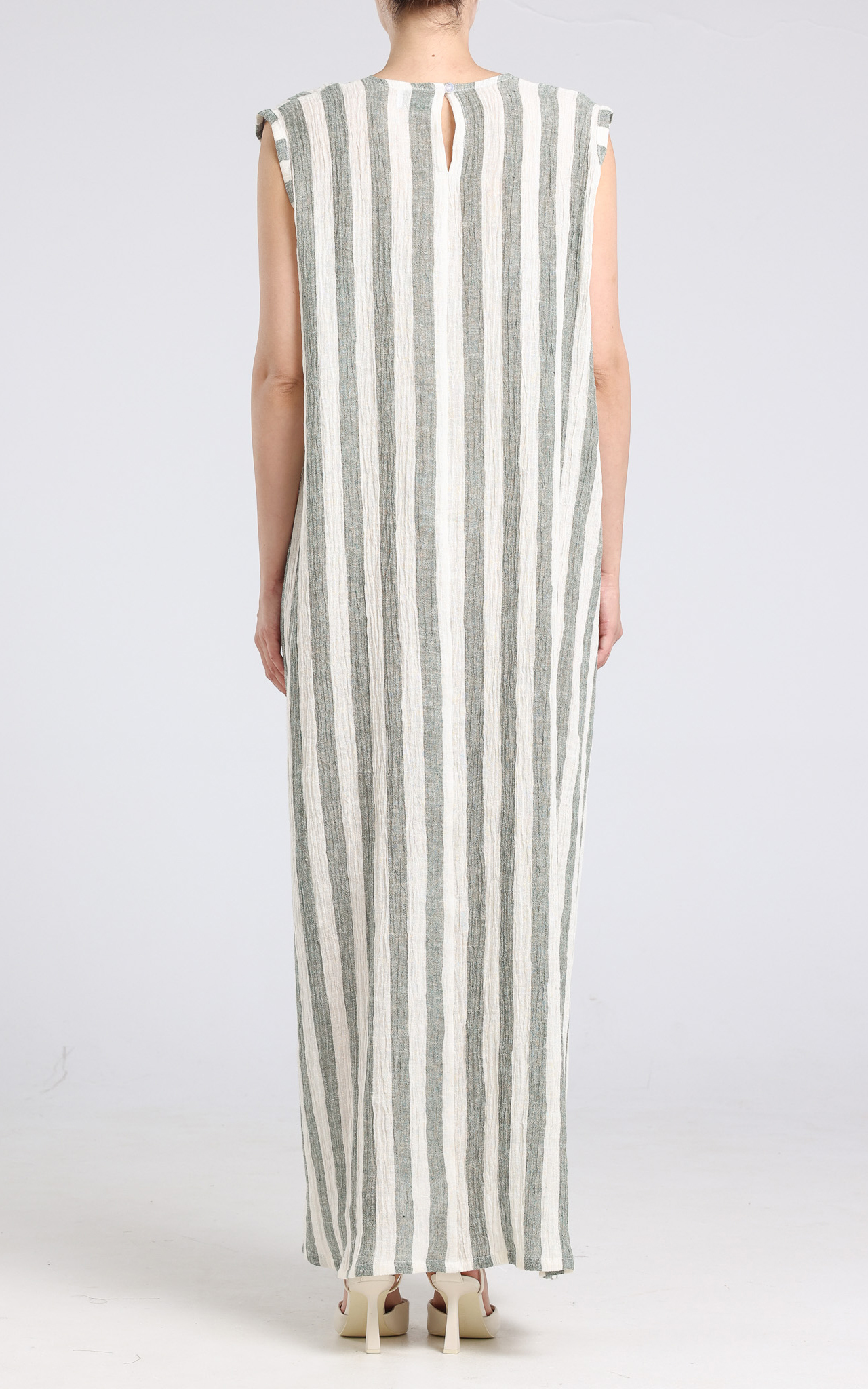 Crinkled Stripped Linen Dress - Green