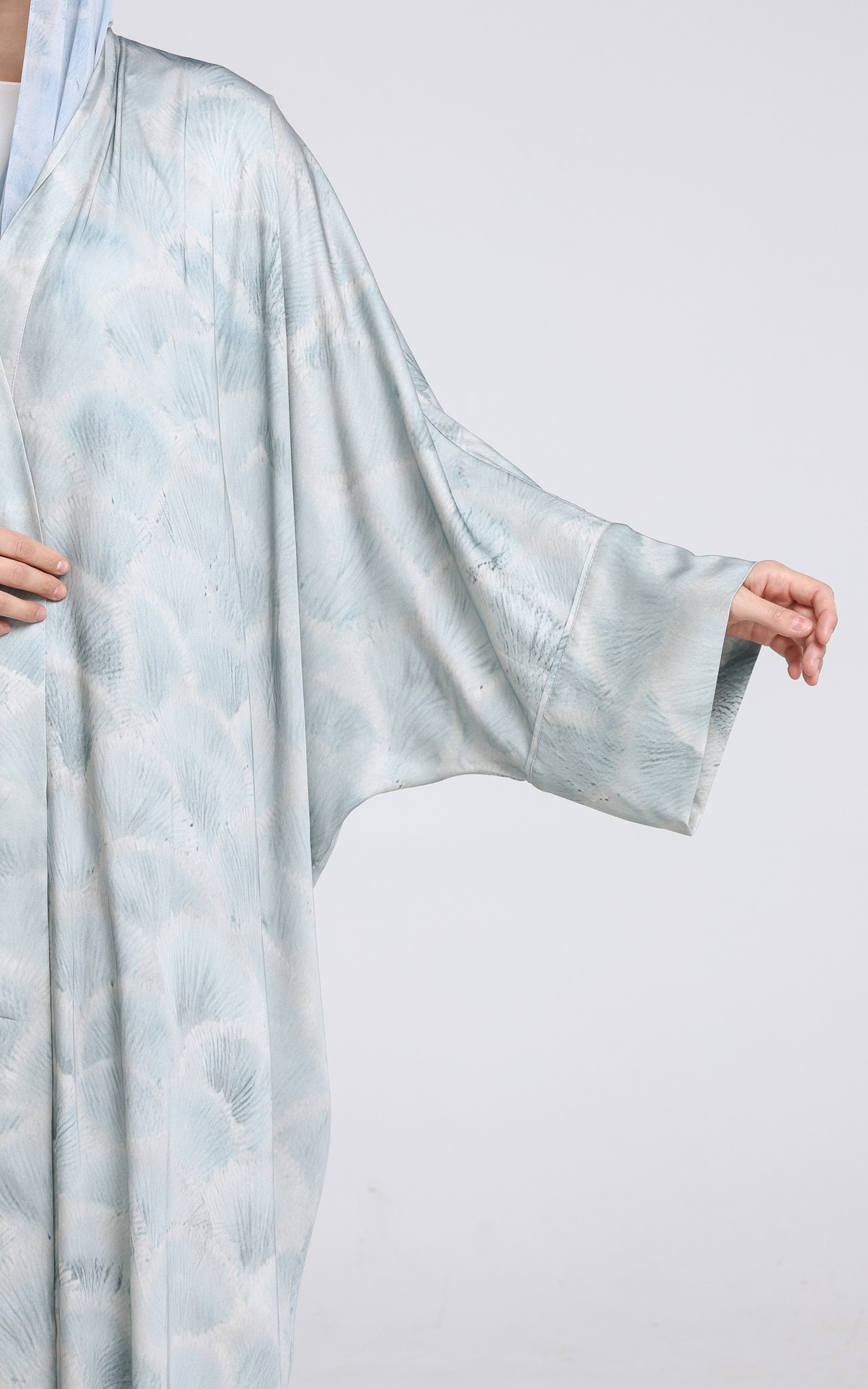 Lightweight cotton fabric in a half Bisht cut. Slits on the sides. Comes with scarf.
