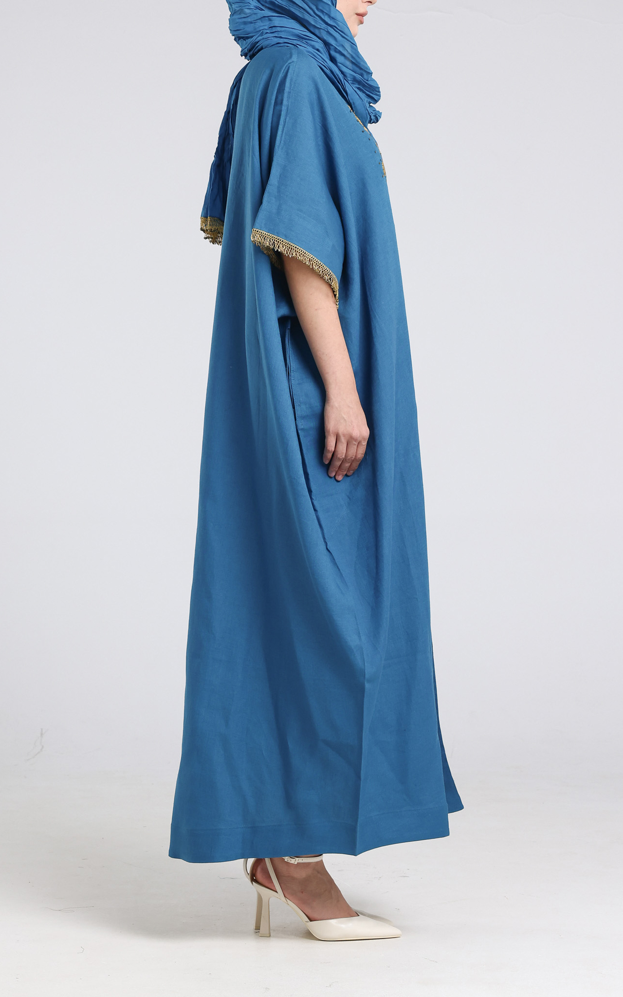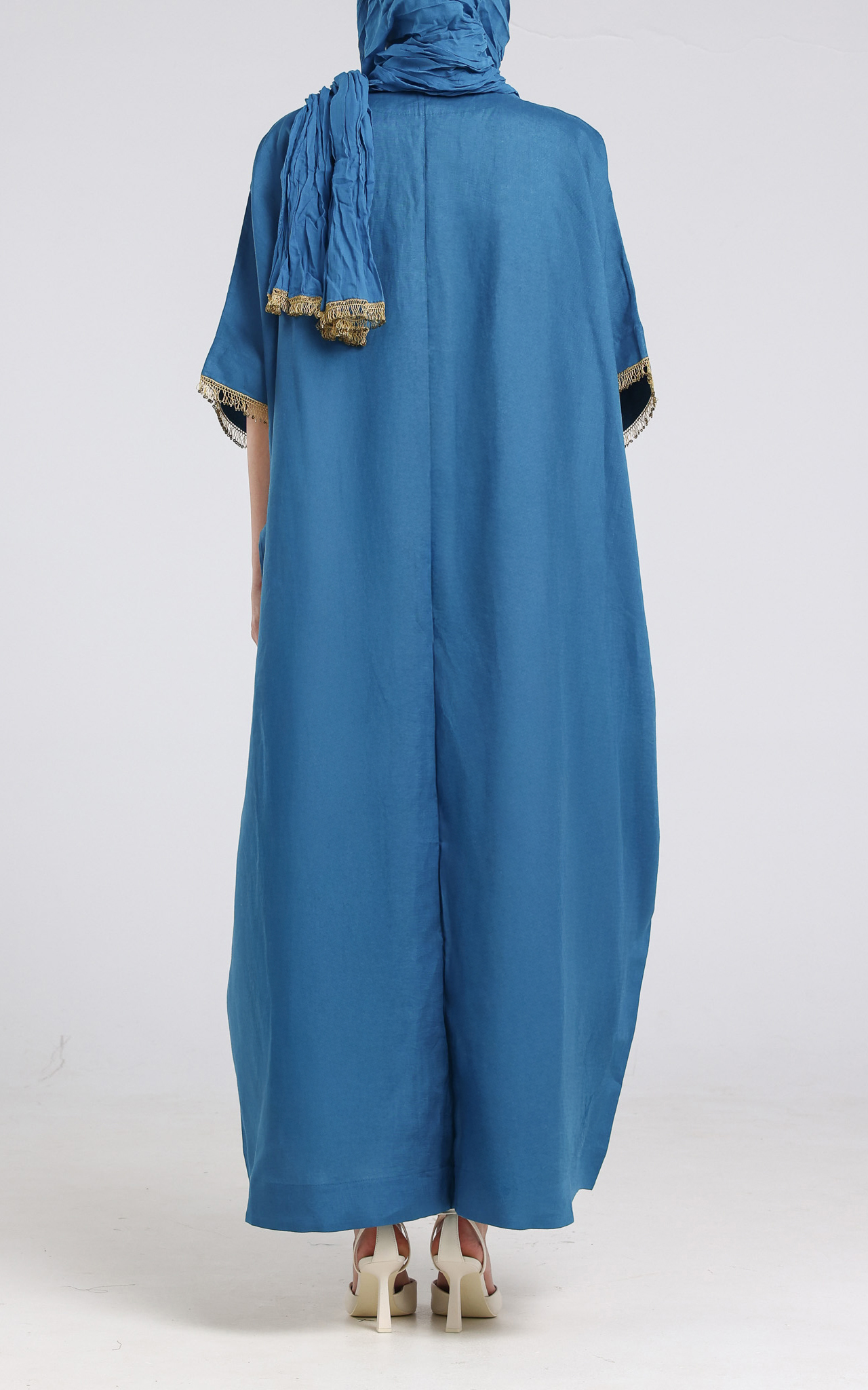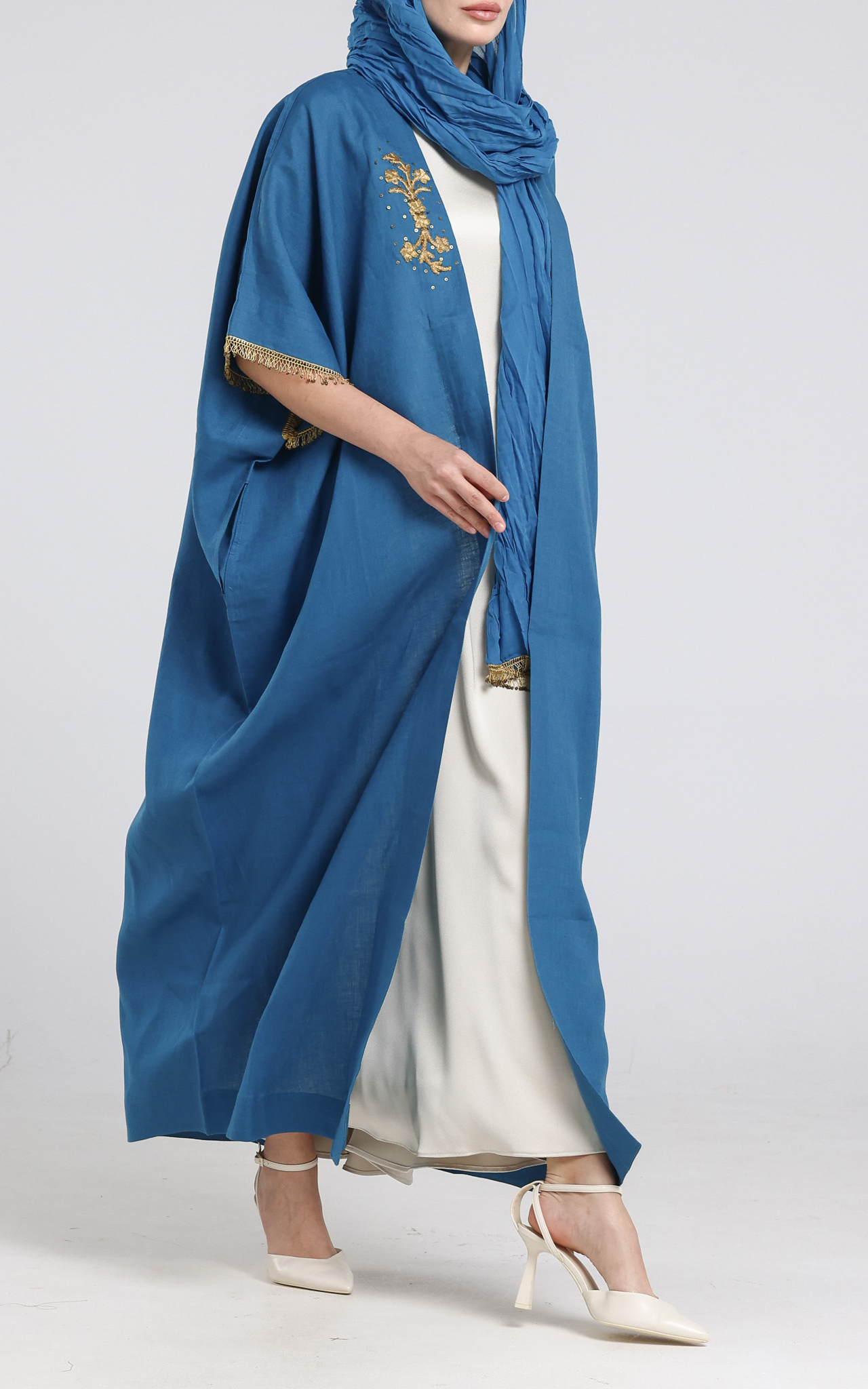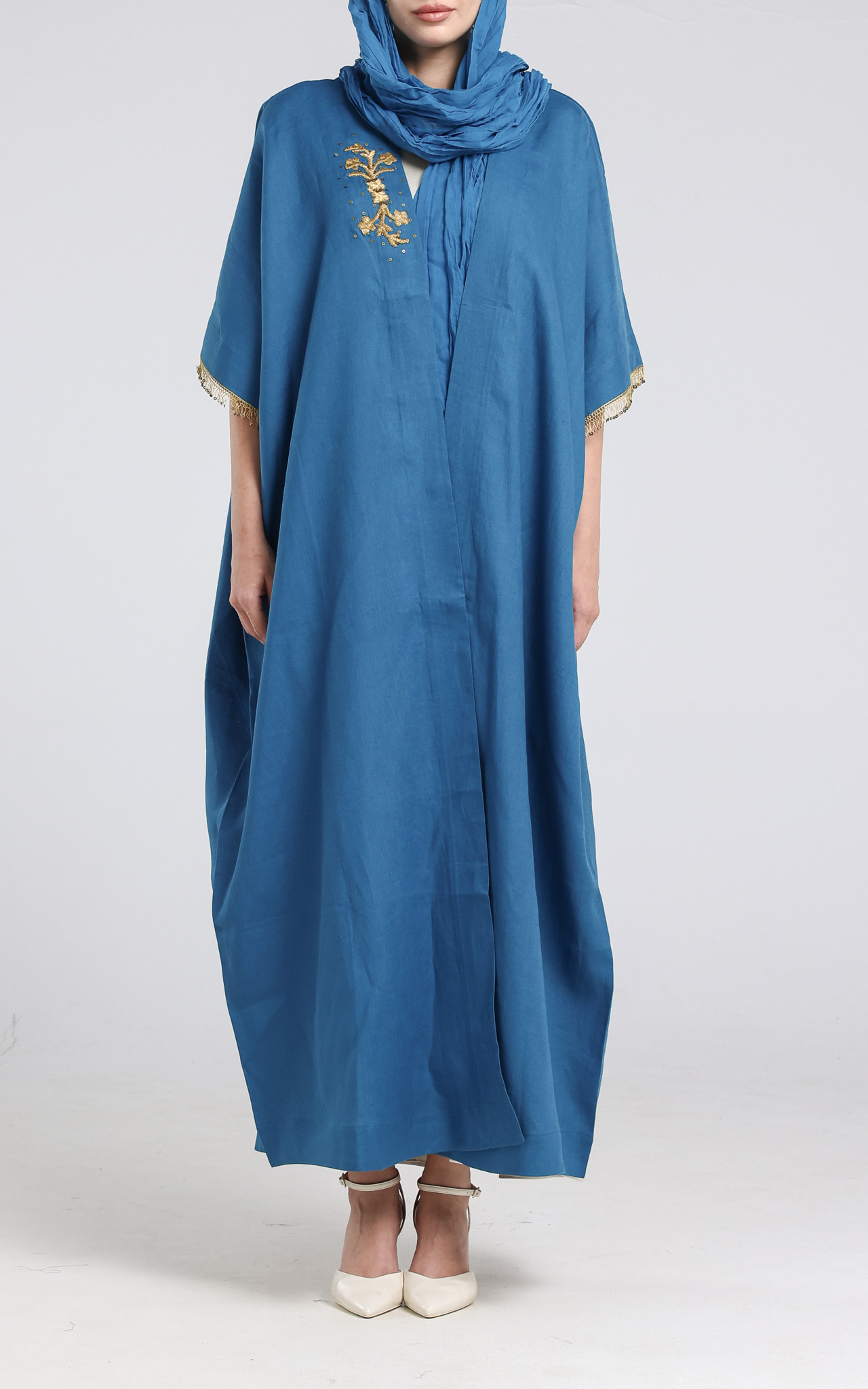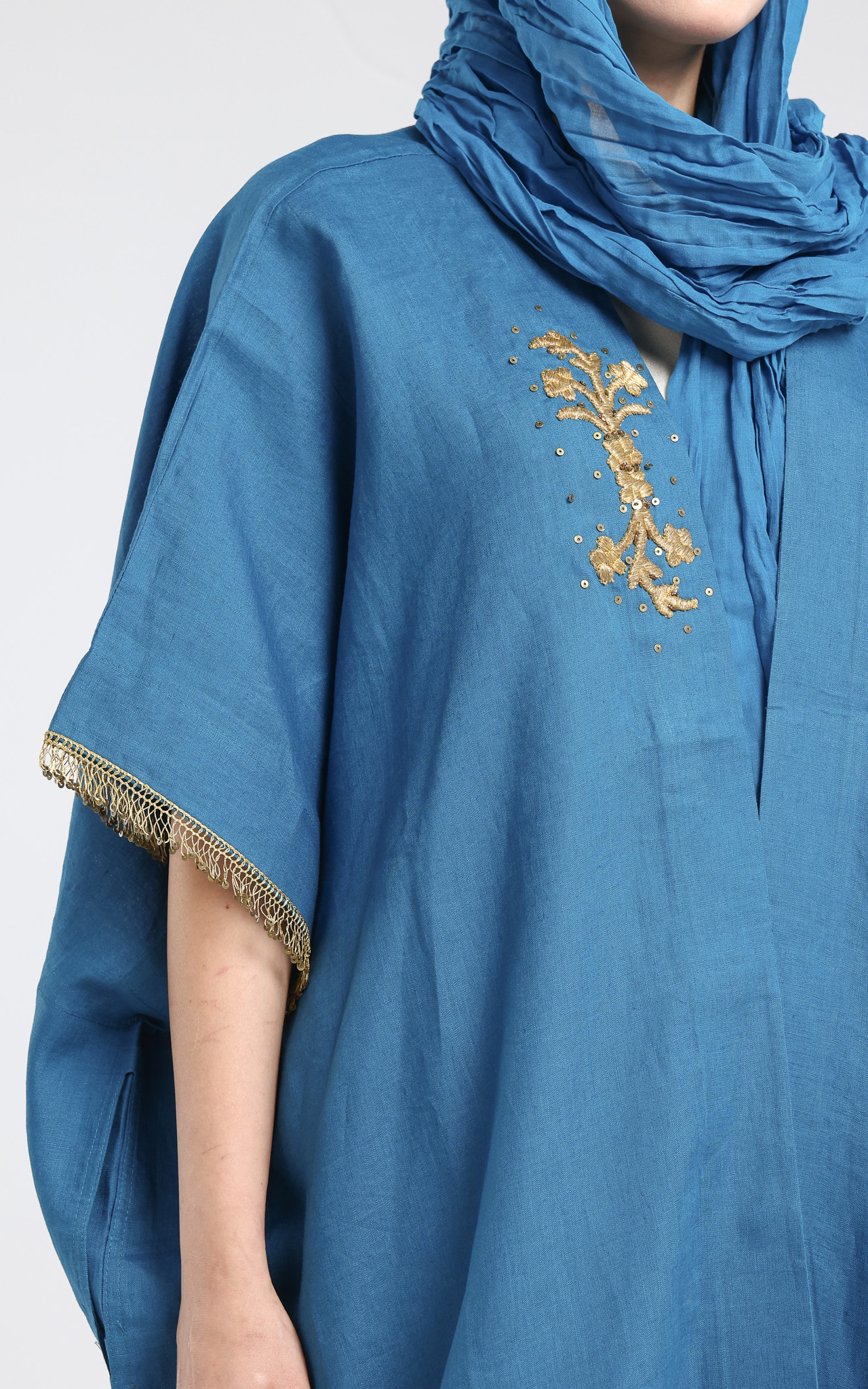 • Bisht cut Abaya made from Linen. The bisht has gold embroidery on the front right of the bisht and gold sequence on the edge of the sleeves. Comes with a creased scarf with sequins on two of the edges.