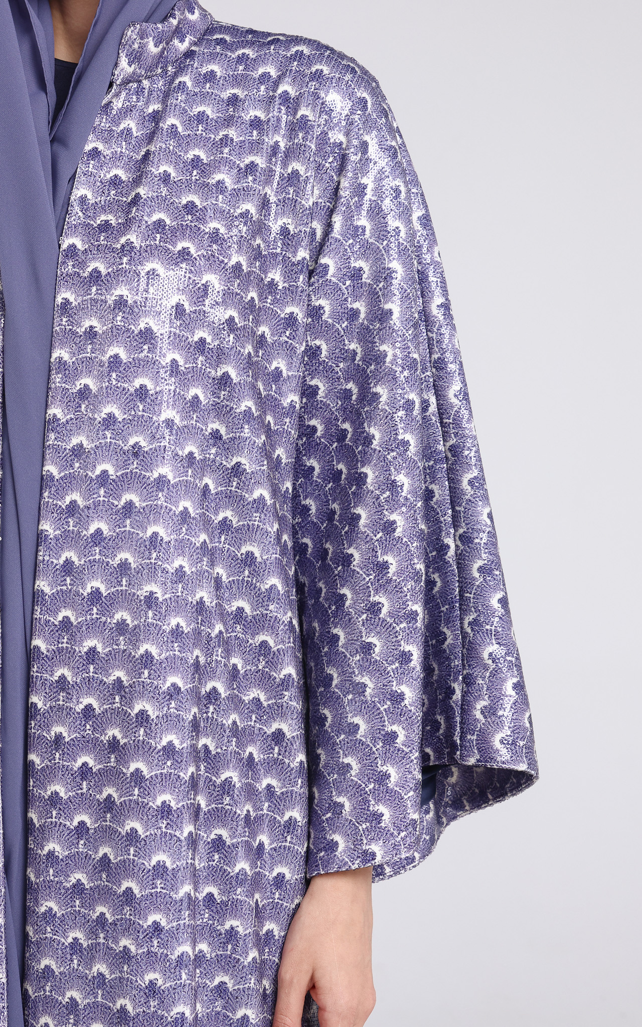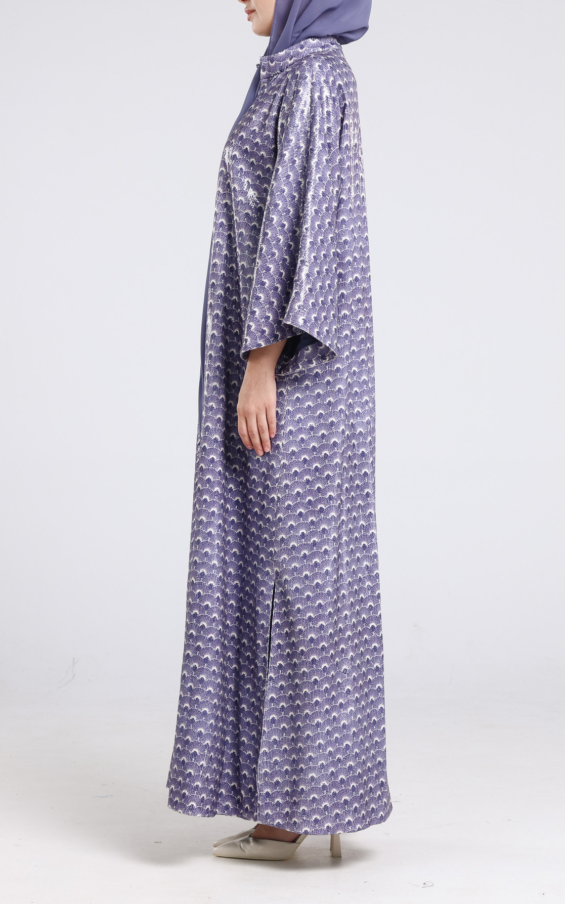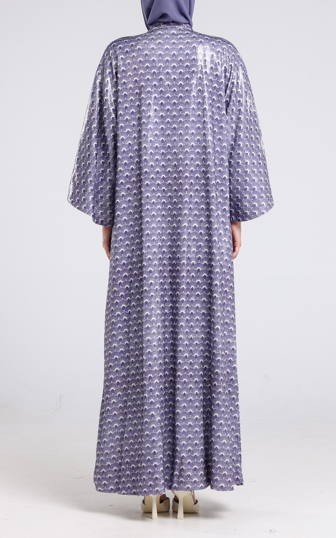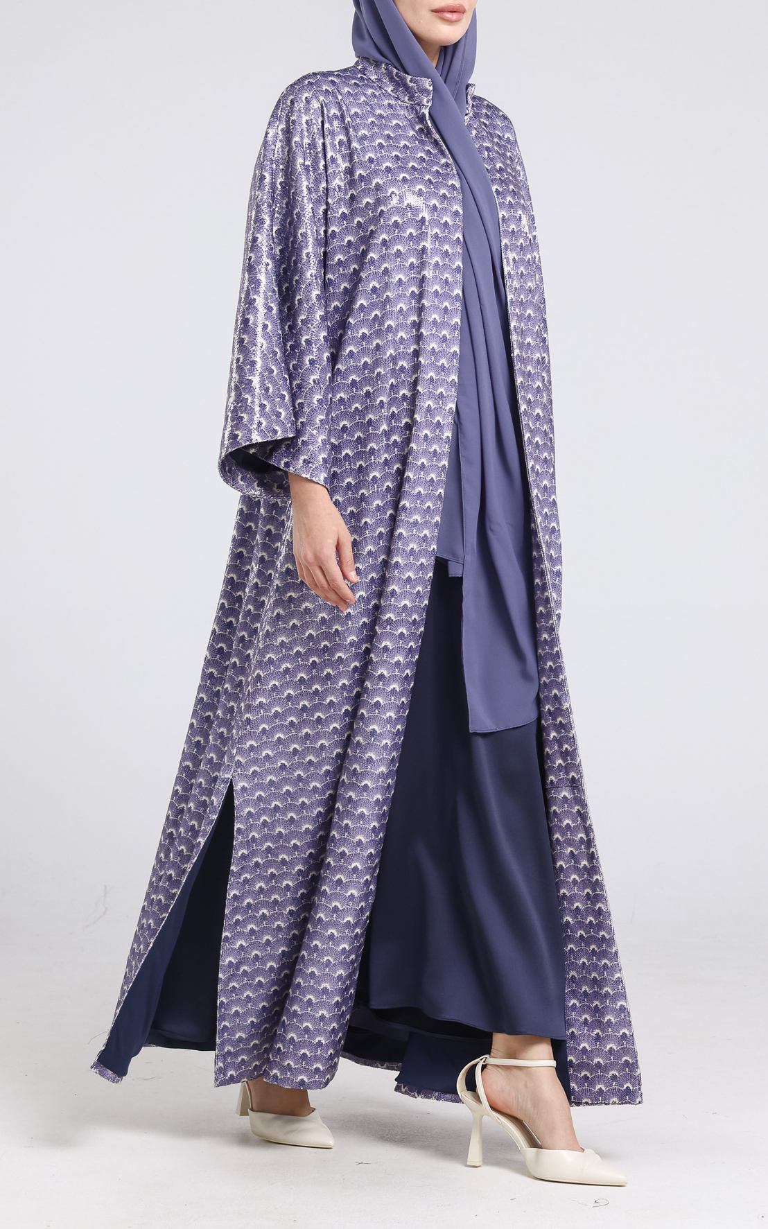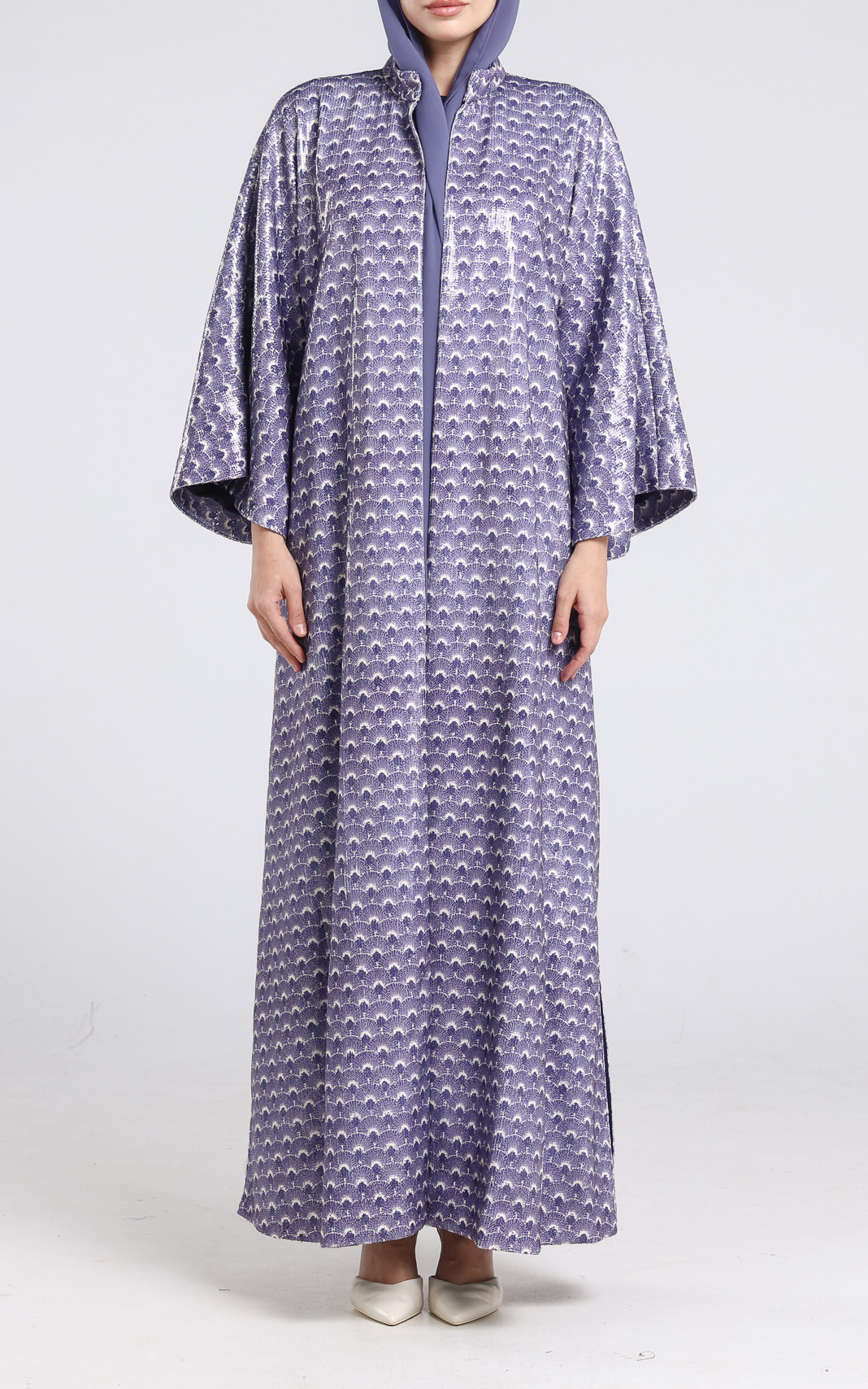 This unique abaya has a vibrant sequin design, The abaya is lined for a perfect finish. Japanese collar, slightly flared sleeves and slits on the side of abaya. Comes with scarf.