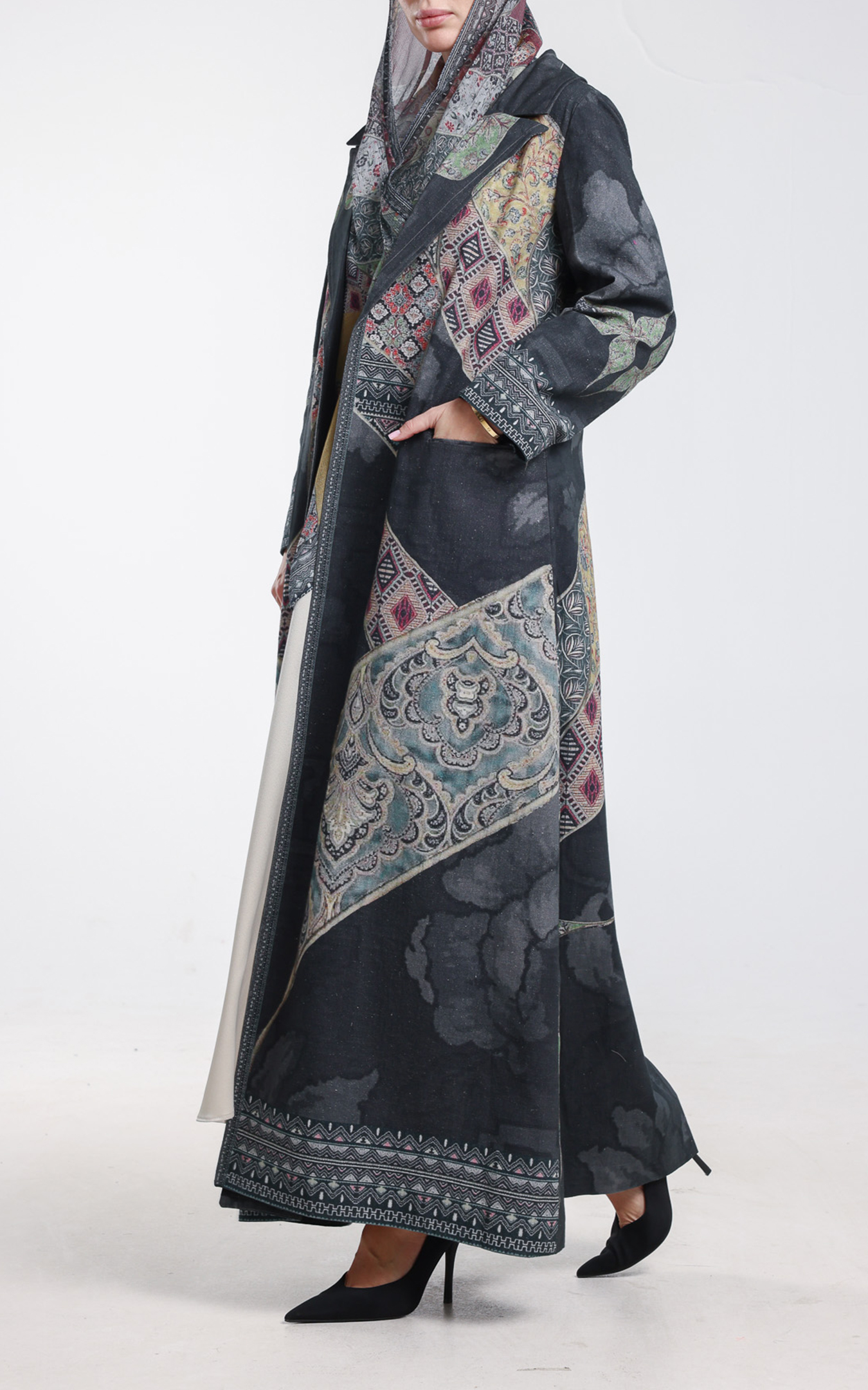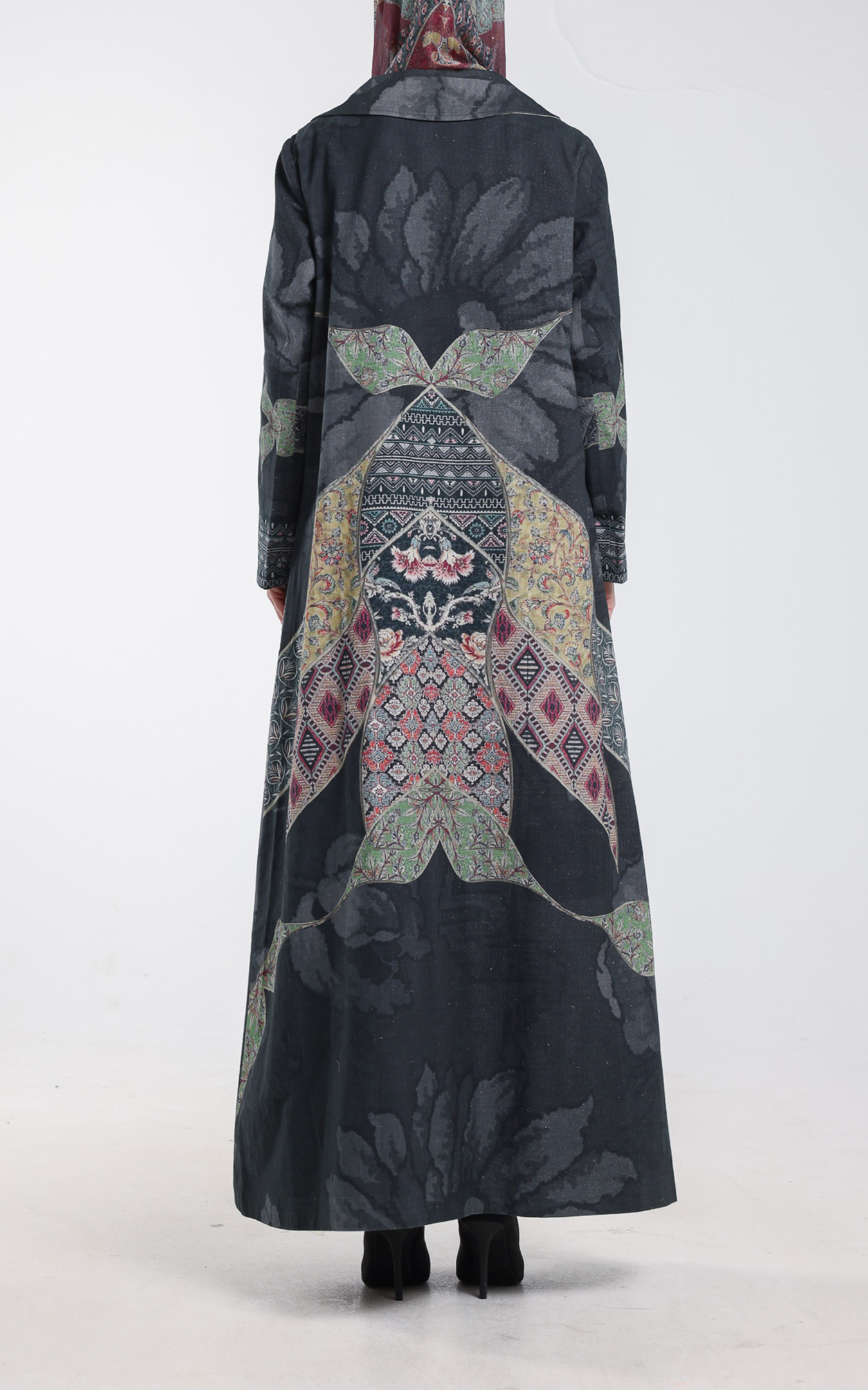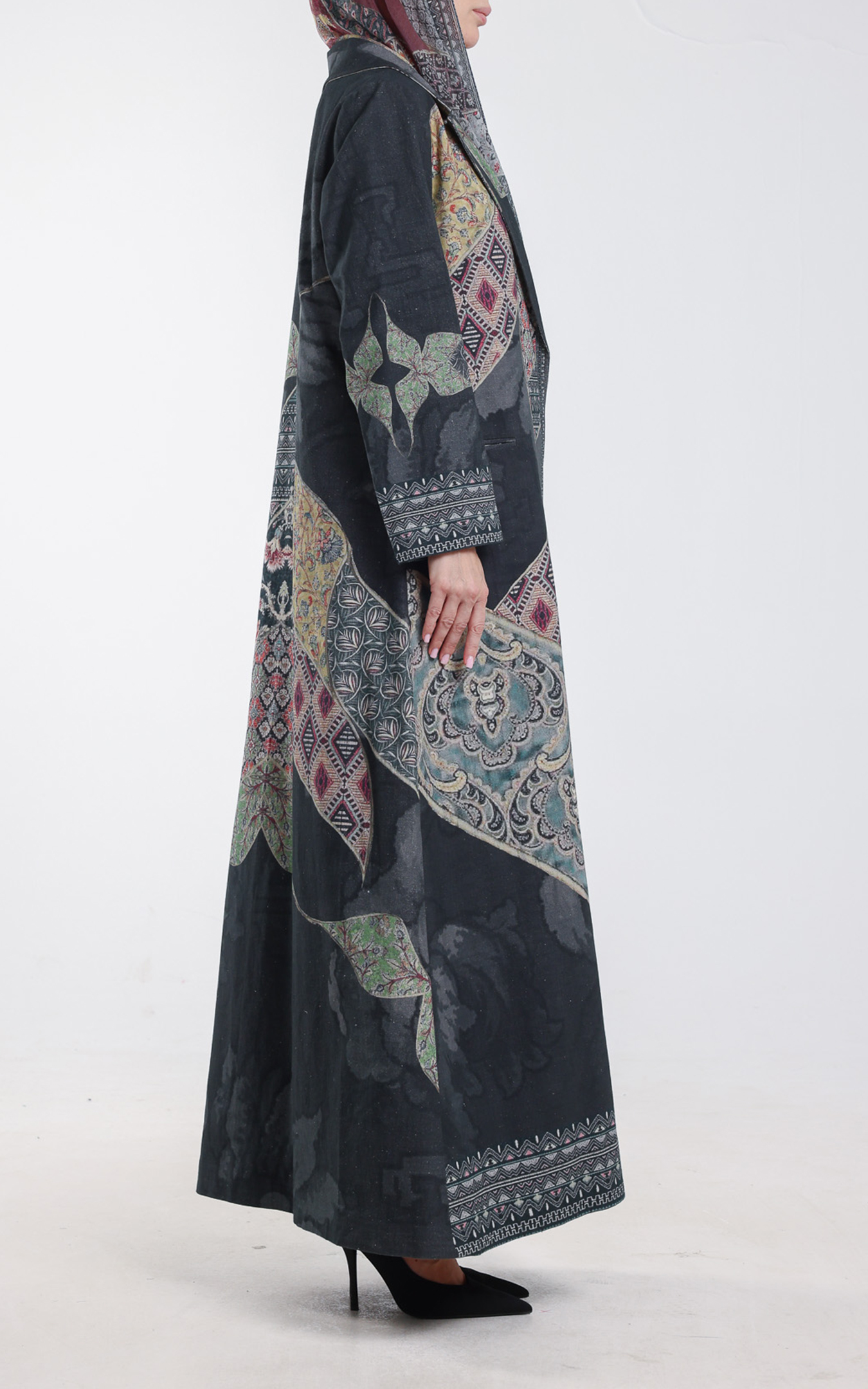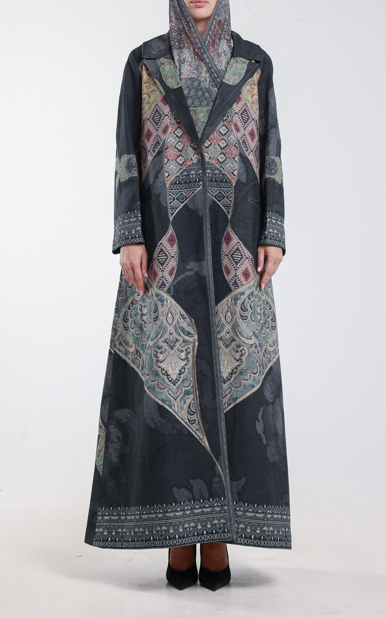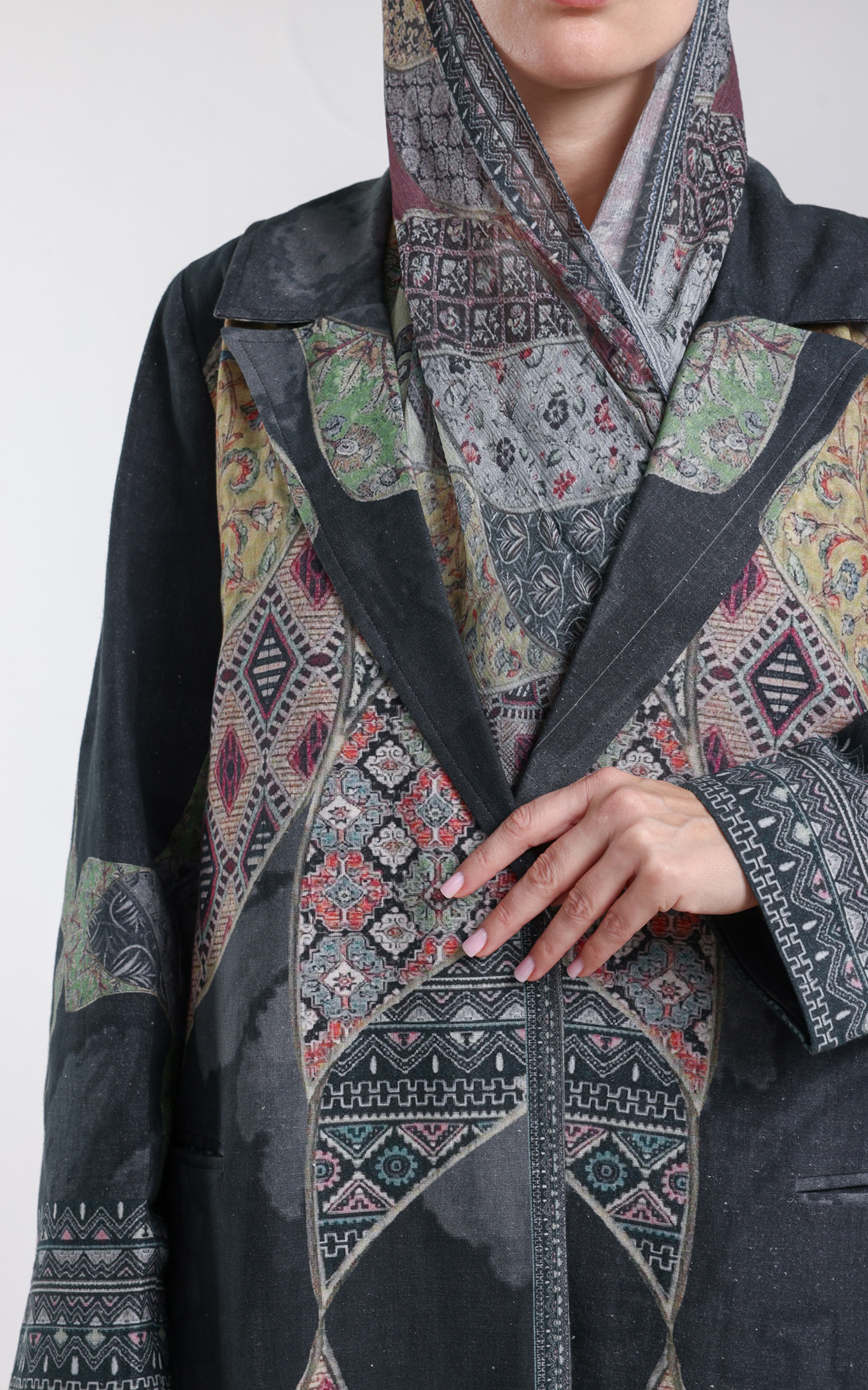 Elevate your wardrobe with this luxuriously crafted statement abaya, made of organic linen and designed with an artistic blend of cultural motifs and modern elegance. The piece features a rich black base enhanced with intricate patterned panels in shades of burgundy, sage, teal, and soft neutrals. The detailed geometric and paisley-inspired prints create a visually stunning contrast that draws the eye from top to bottom. The abaya is tailored with a structured collar and long, relaxed sleeves, offering both comfort and refined sophistication. The front showcases elongated symmetrical designs that elongate the silhouette, while the lower panels introduce soft, flowing patterns that add movement and depth. Has front pockets and comes with a matching scarf, featuring the same artistic motif for a cohesive, elevated look.