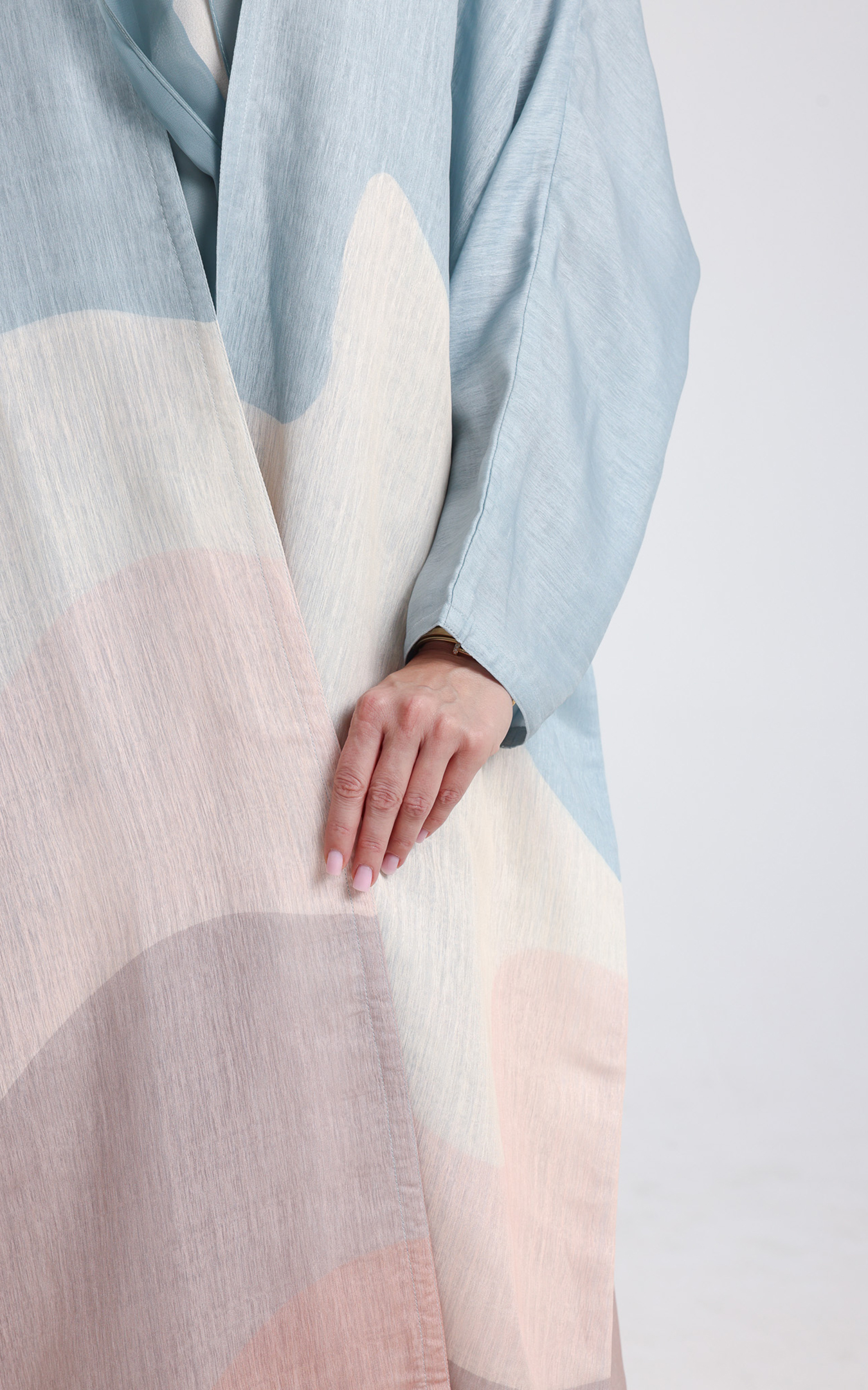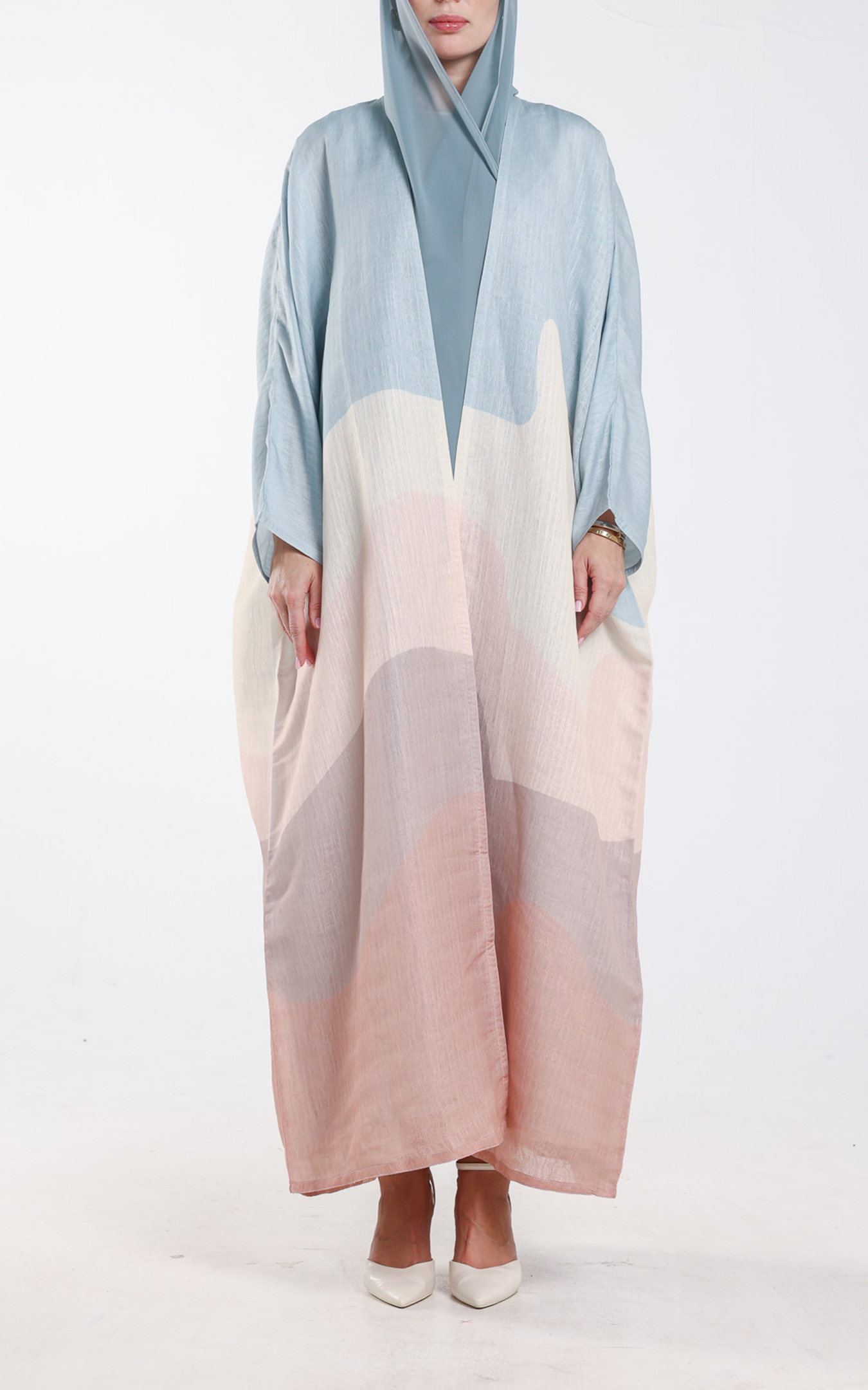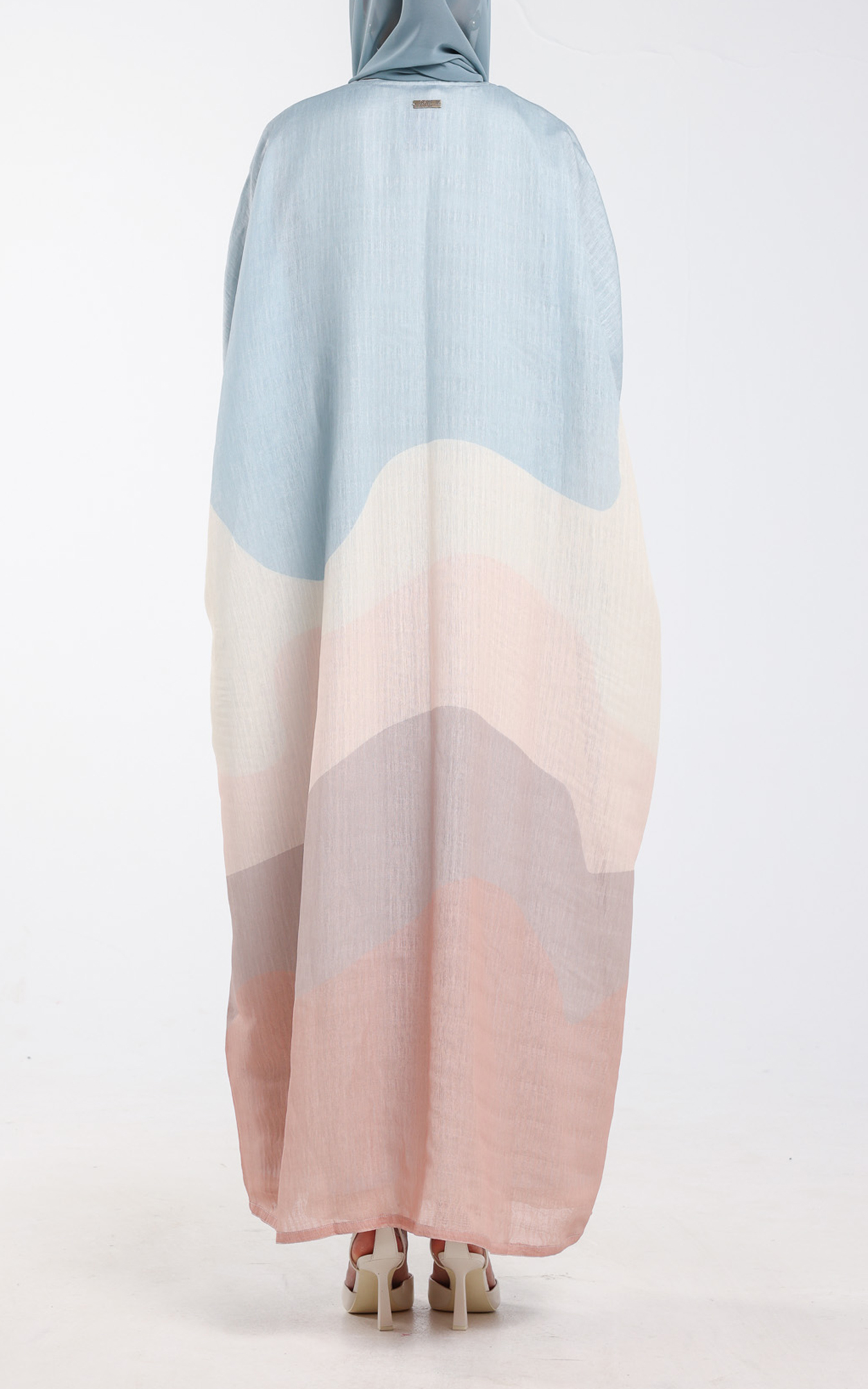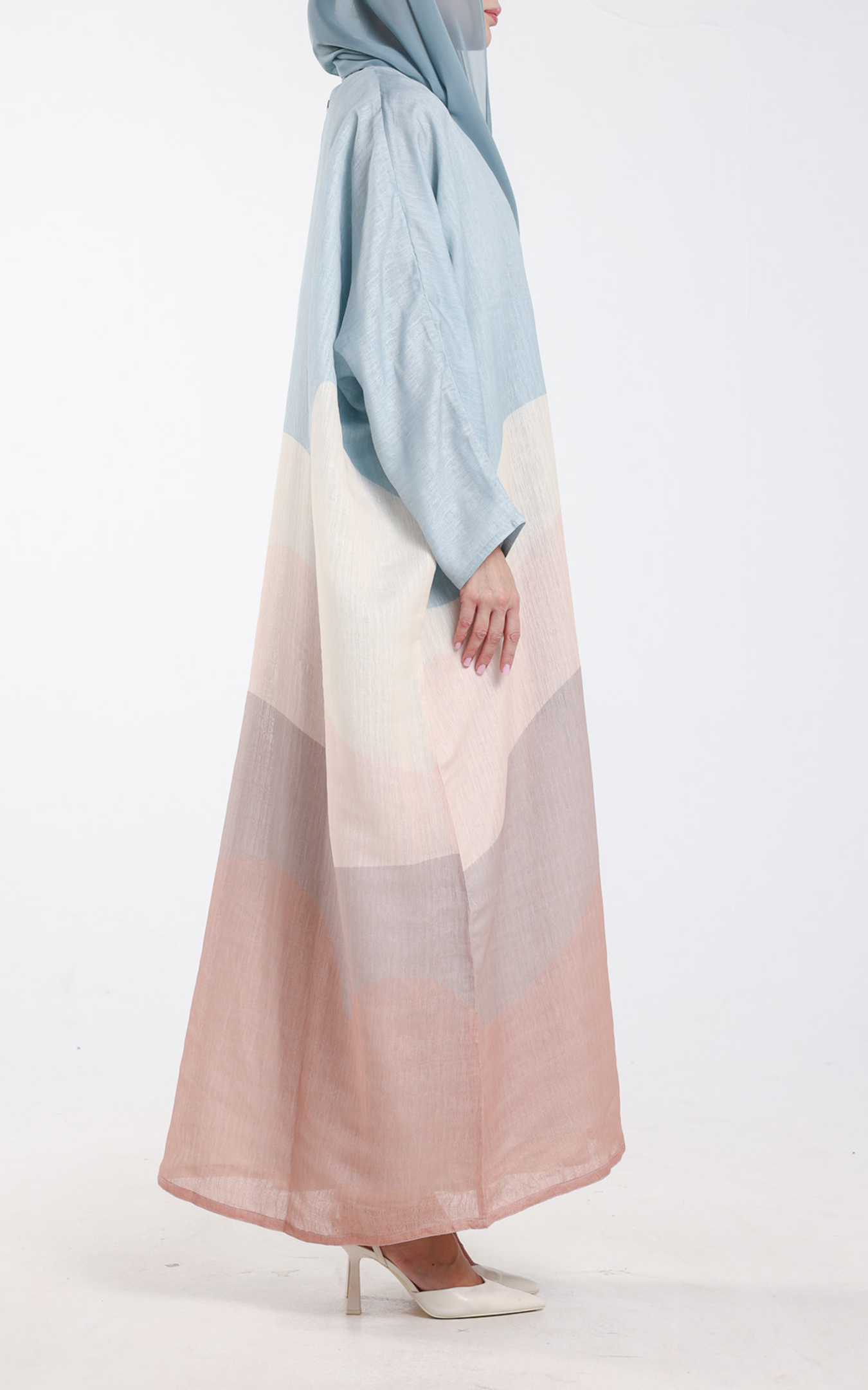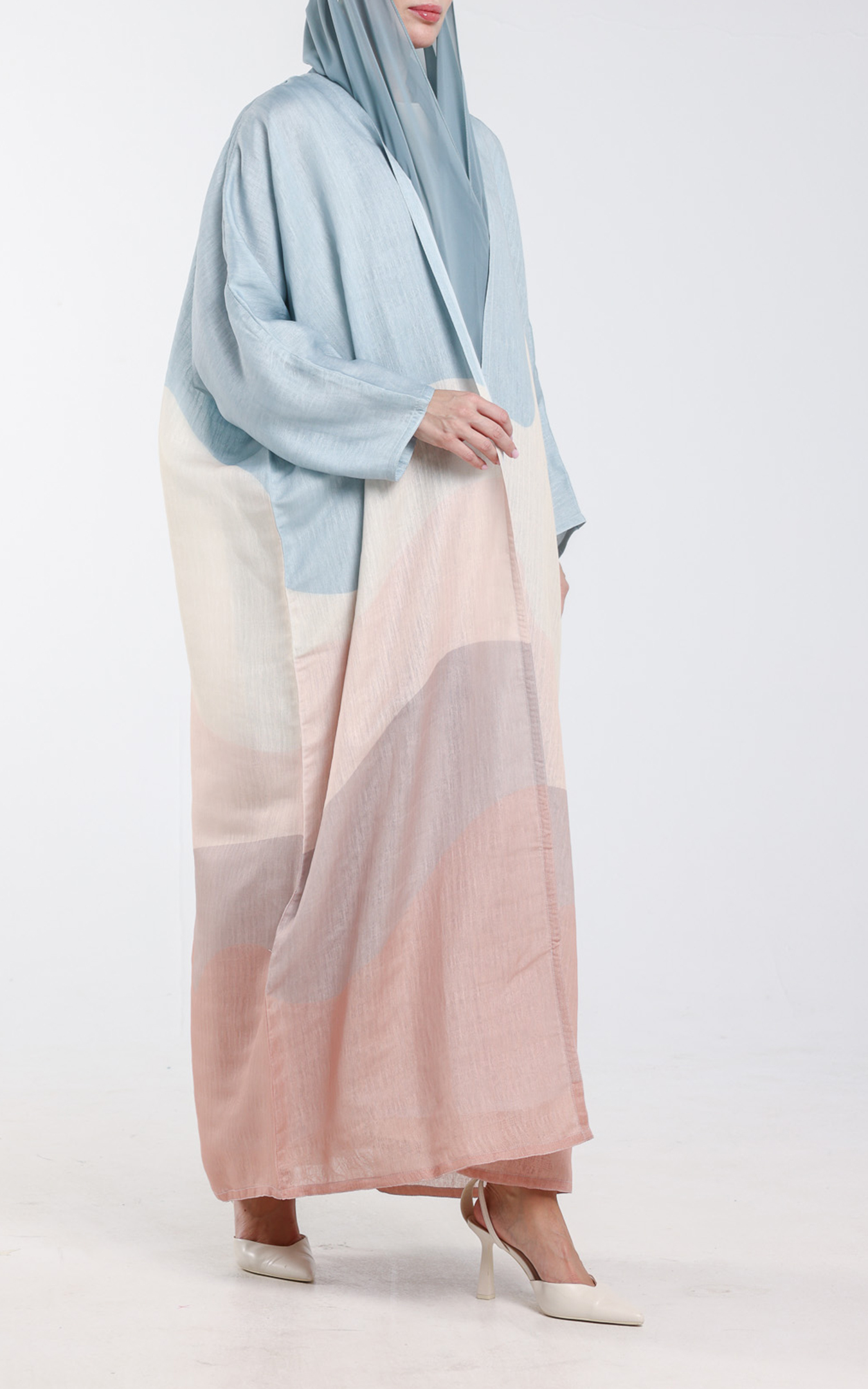 Embrace modern minimalism with this soft, flowy abaya, designed in soothing pastel tones that blend seamlessly into an elegant, contemporary look. The piece features an artistic color-block gradient of light blue, cream, blush, and taupe, creating a serene and effortless aesthetic. Crafted from lightweight, breathable fabric, the abaya drapes beautifully over the body, offering both comfort and refined style. The relaxed, wide-fit silhouette ensures ease of movement and all-day wearability. Comes with a matching scarf. Perfect for casual elegance, travel, or daytime outings, this abaya brings together comfort, simplicity, and understated luxury, making it a versatile addition to any wardrobe.