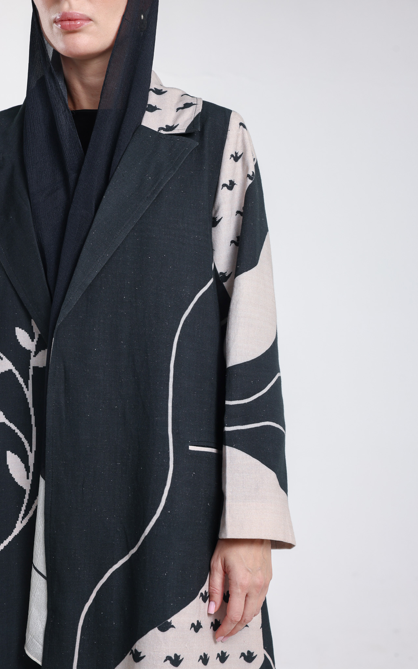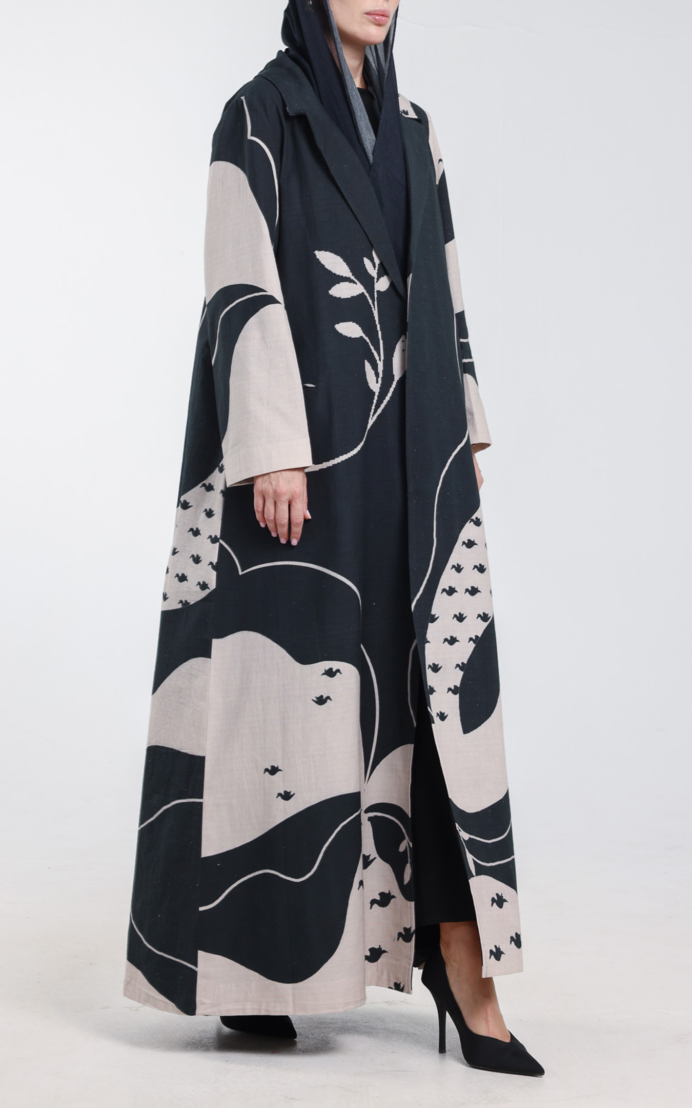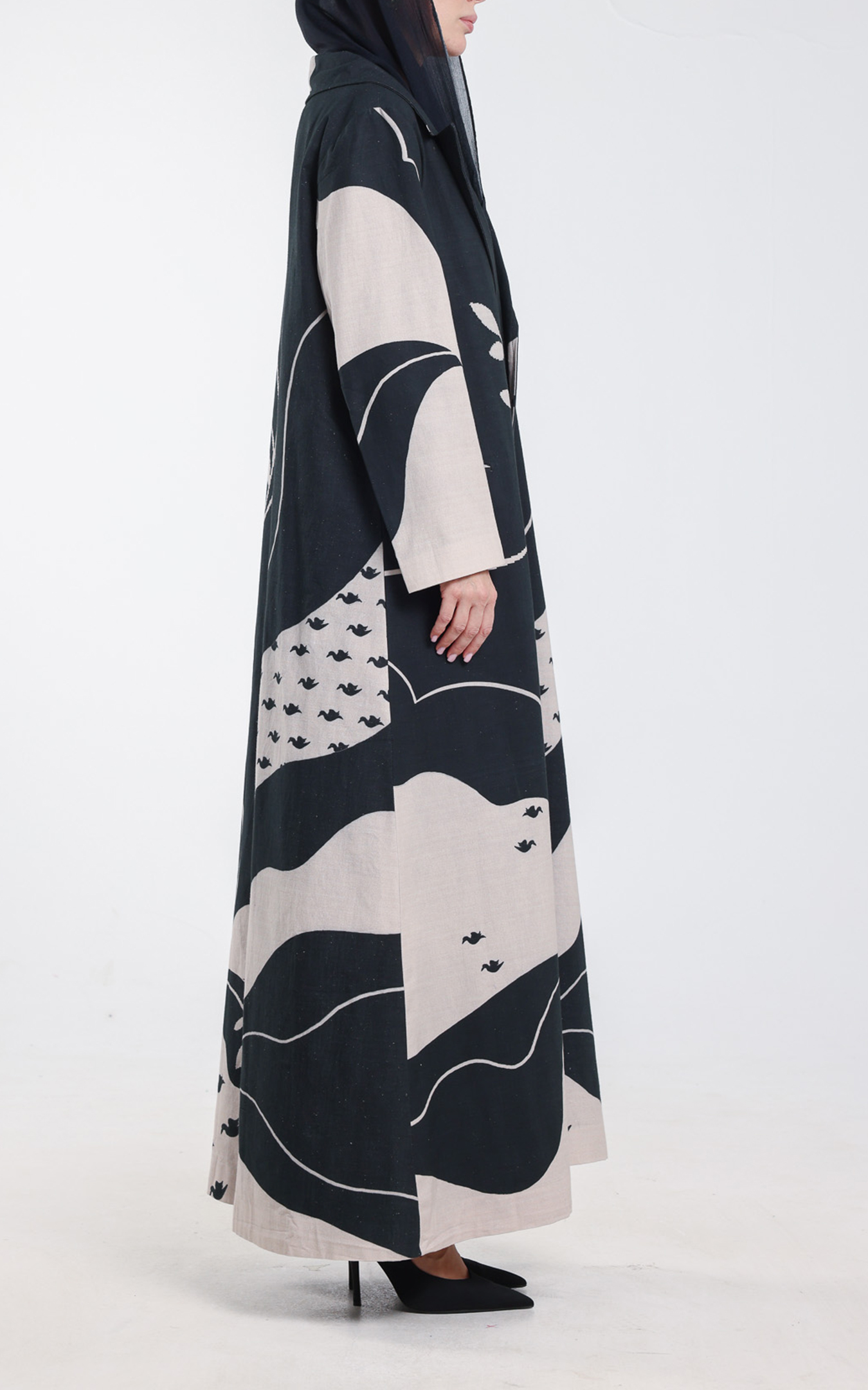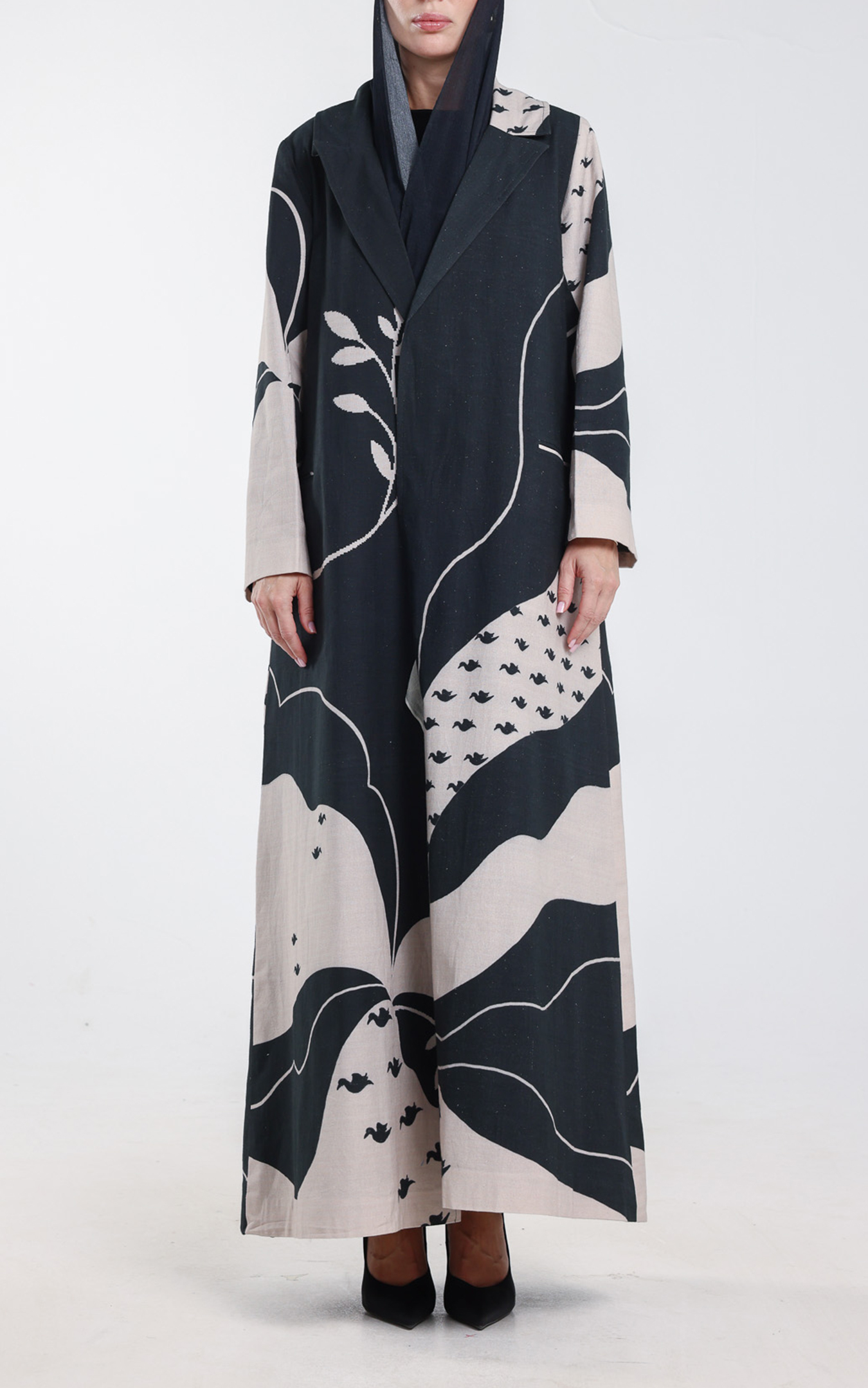 • This abaya, crafted from 100% organic linen, blends natural elegance with artistic expression. The fabric provides effortless comfort, while the striking black-and-beige artistic pattern adds a bold, contemporary touch. Flowing lines, abstract shapes, and delicate bird motifs create a visually captivating design that stands out with sophistication. Featuring a structured lapel-style front and relaxed long sleeves, the abaya drapes gracefully for a refined, modern silhouette. Its organic linen composition ensures a soft, sustainable, and high-quality feel—perfect for everyday wear, special gatherings, and statement looks. Comes with scarf, A unique piece for those who appreciate natural materials and artistic, fashion-forward design.