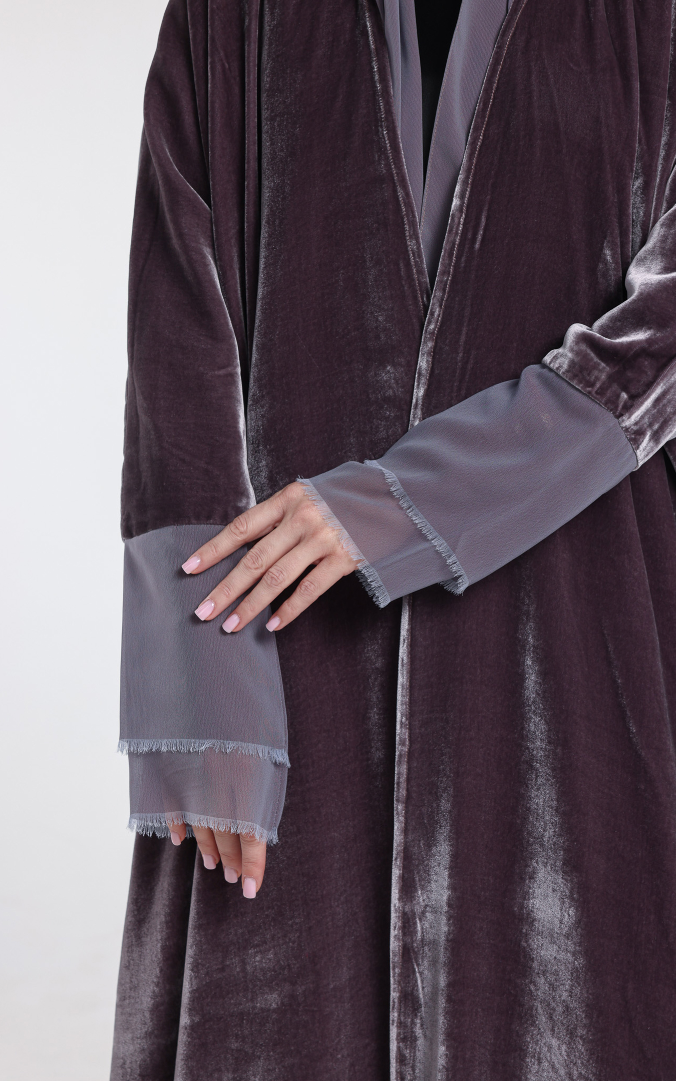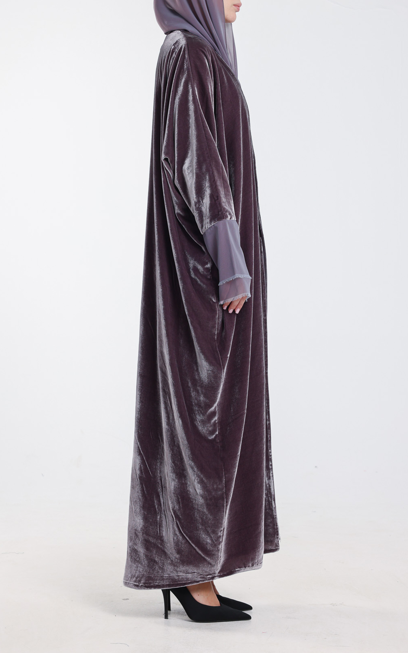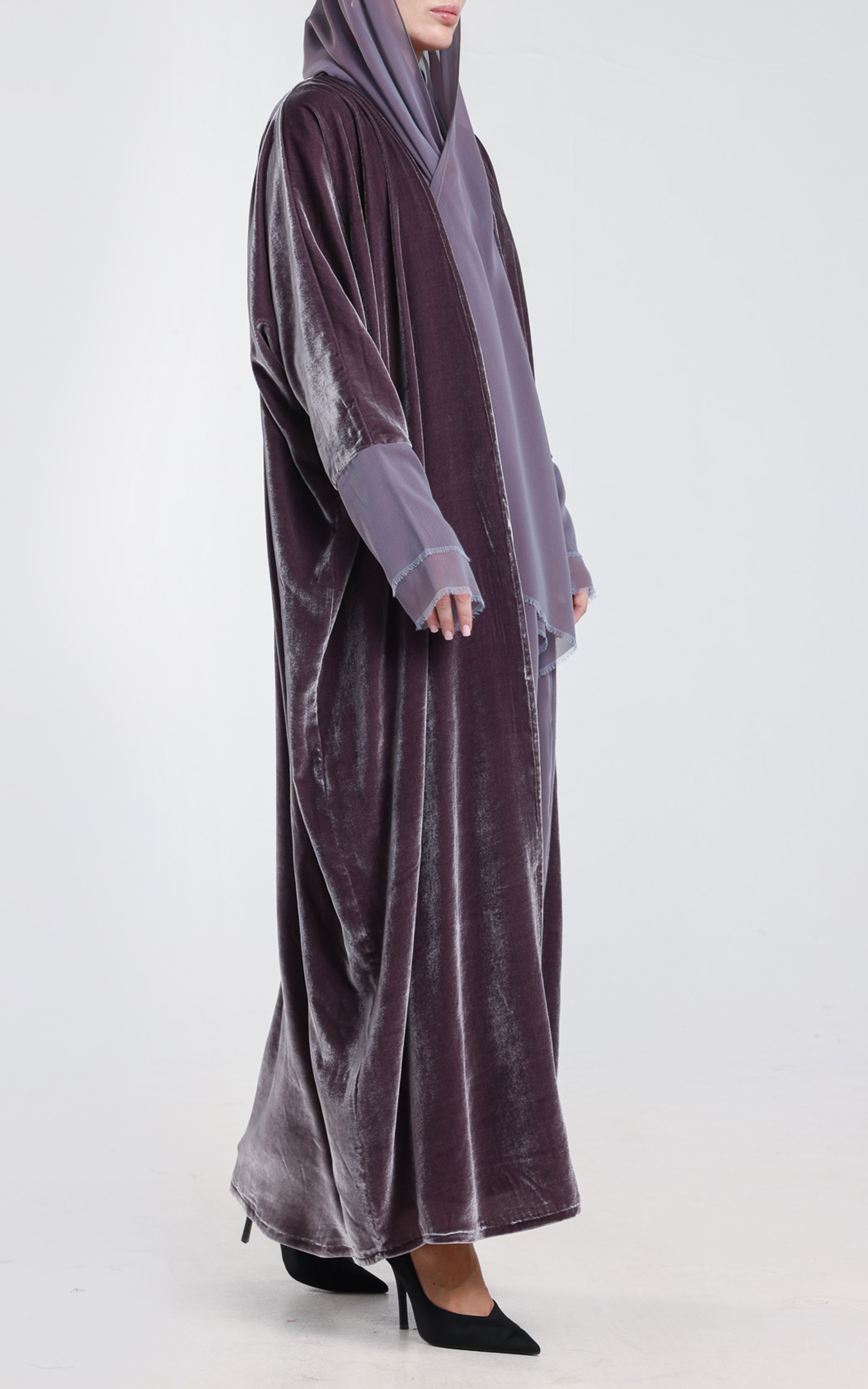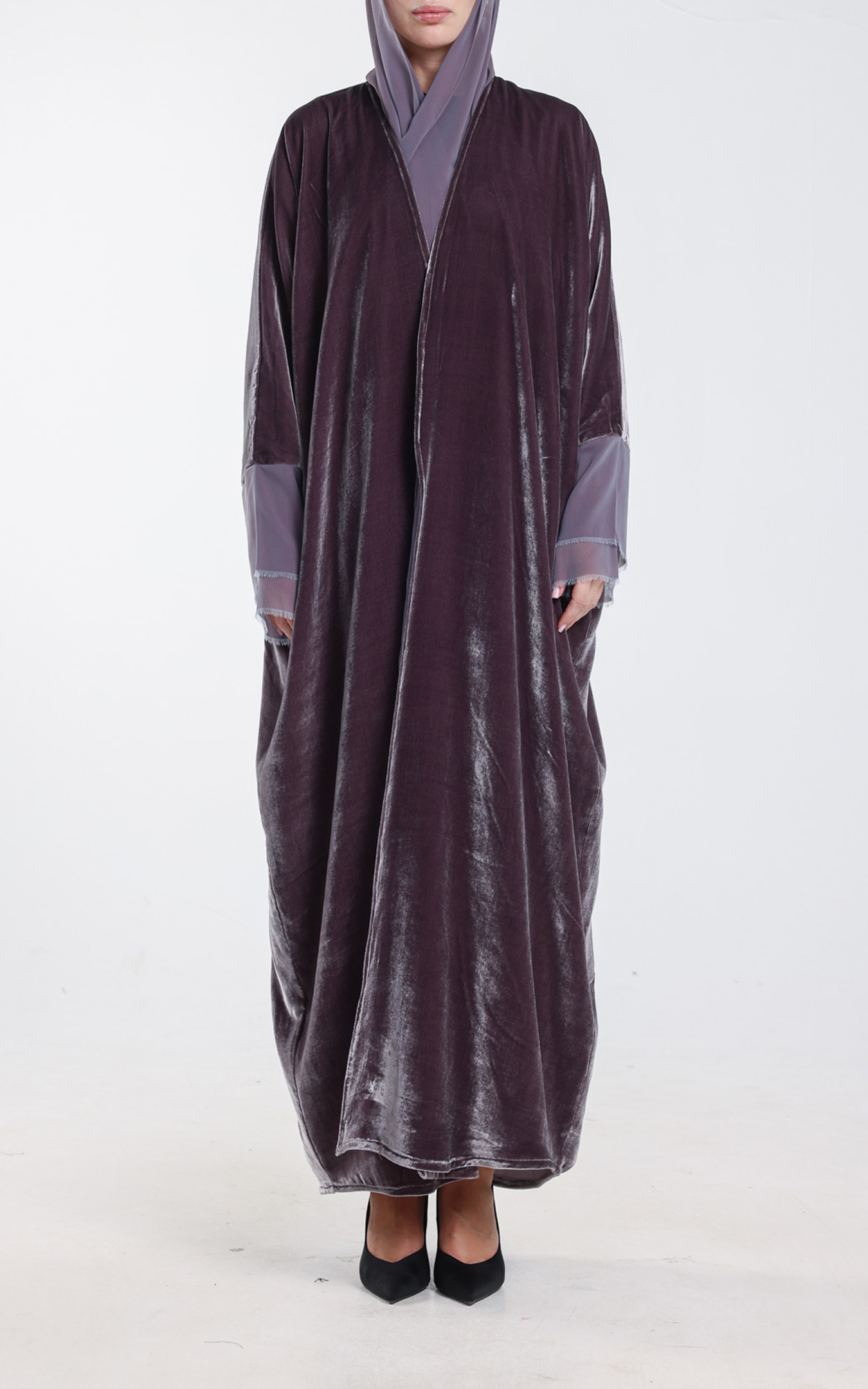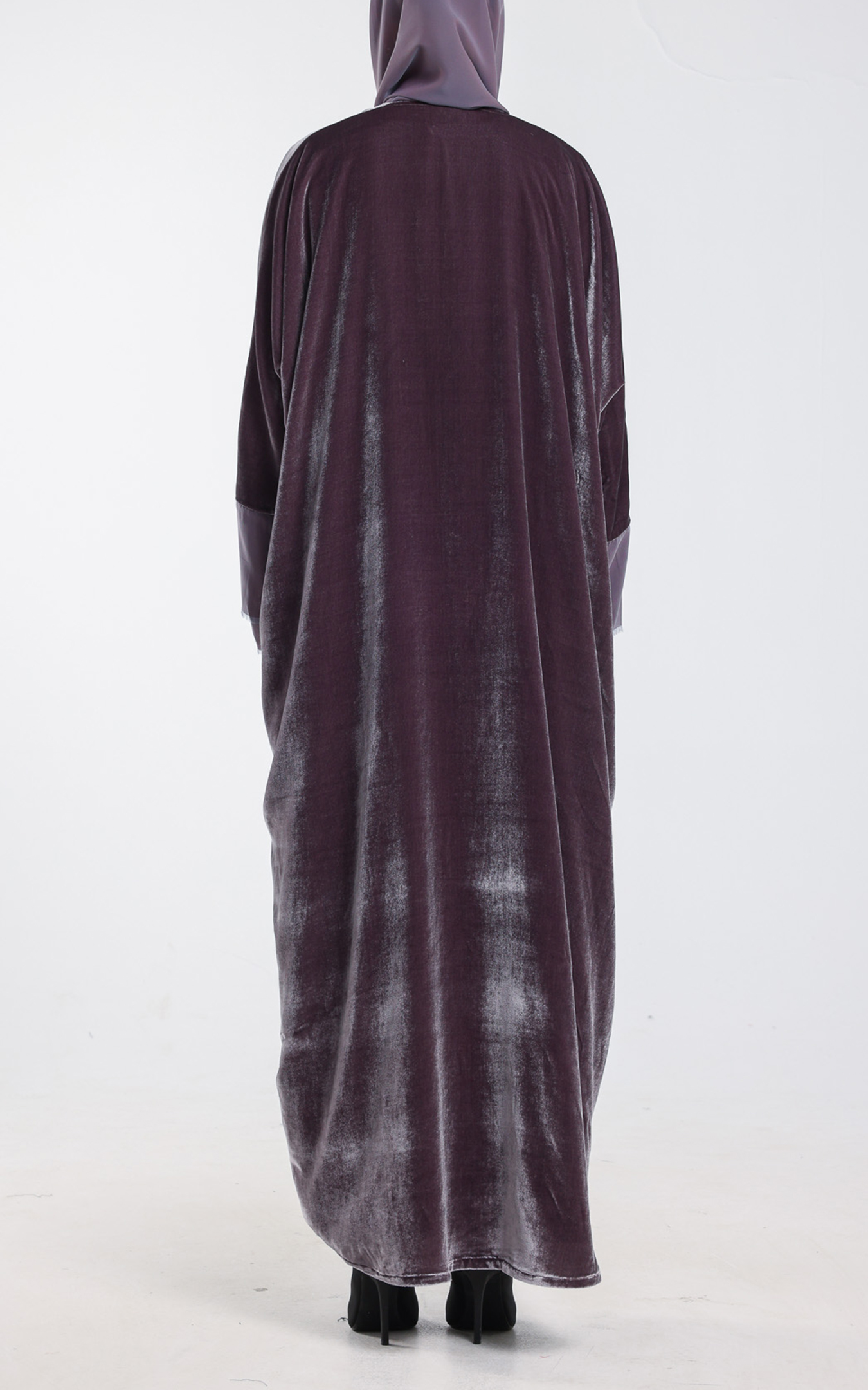 This abaya is made from rich, plush velvet that drapes beautifully, giving it a soft sheen and a refined, sophisticated finish. The deep plum tone of the velvet creates a warm, elegant look, while the contrasting mauve sheer trim on cuffs adds a subtle, graceful highlight. The matching scarf brings harmony to the overall design, offering both comfort and a polished appearance. Cut in a relaxed, flowing silhouette, this abaya moves effortlessly, making it perfect for special occasions, winter gatherings, or refined everyday wear. The long sleeves, enhanced with satin accents, bring a tailored detail that elevates the overall aesthetic. A timeless piece that blends classic luxury with contemporary charm.