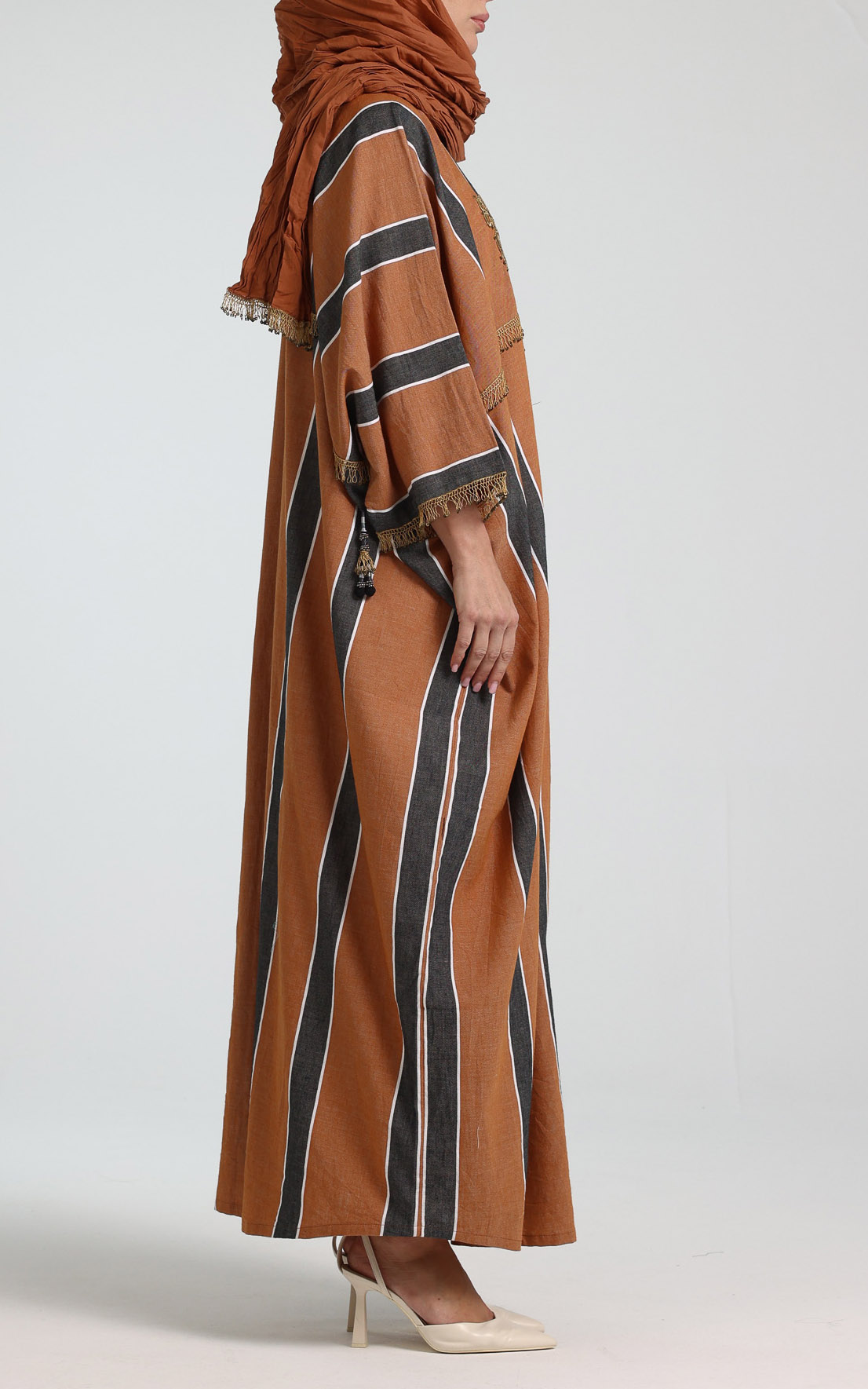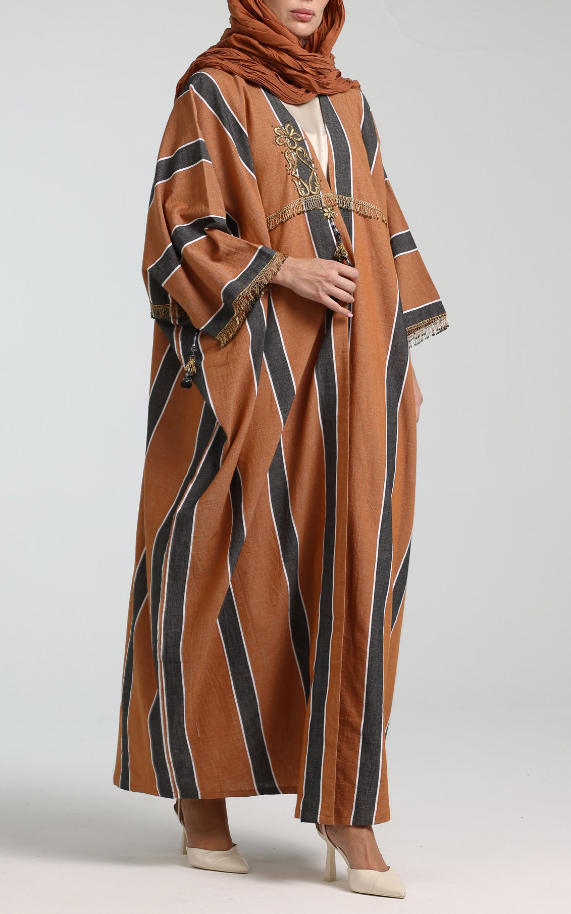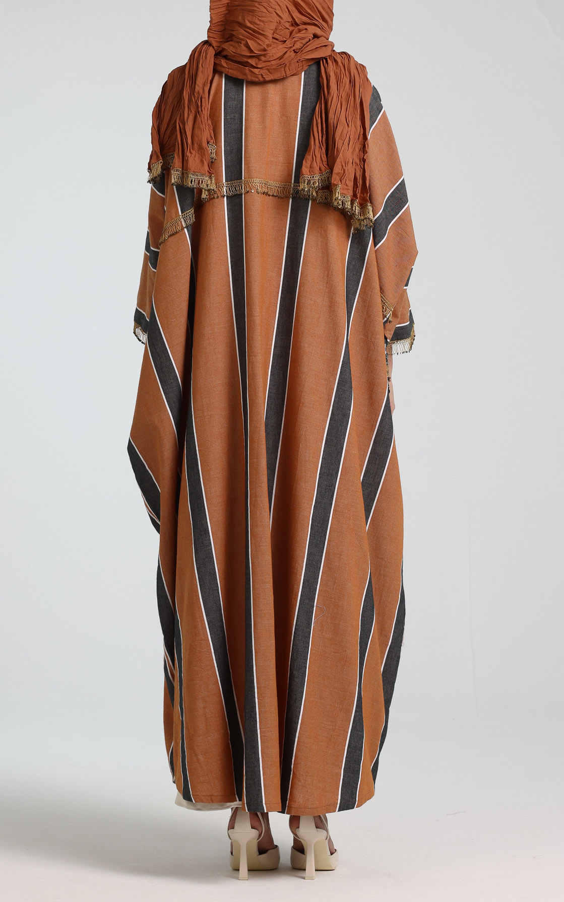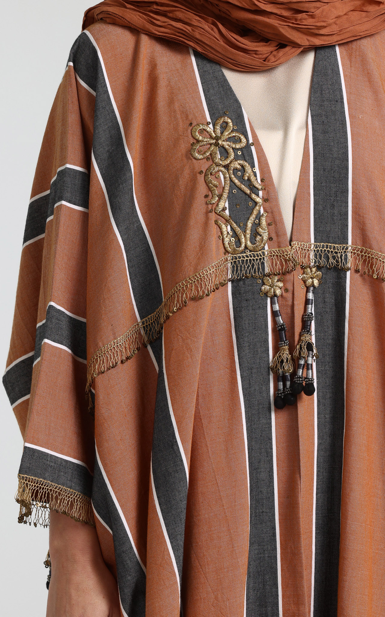 • Modern details bring a distinctive edge to this bisht cut abaya. The traditional flowing silhouette reflects beauty, while a golden embroidery on the front introduce an intriguing contrasting element to the design. Comes with a creased scarf with sequins on two of the edges.