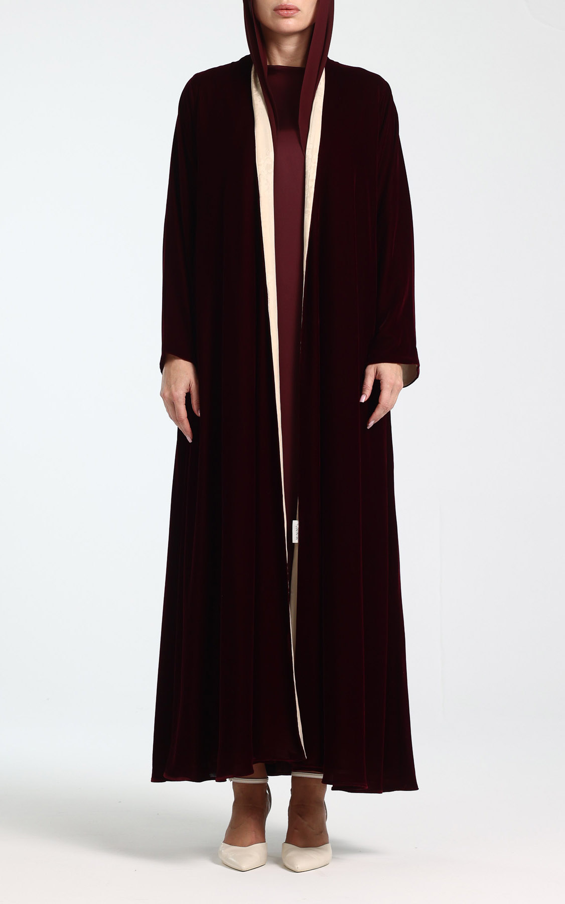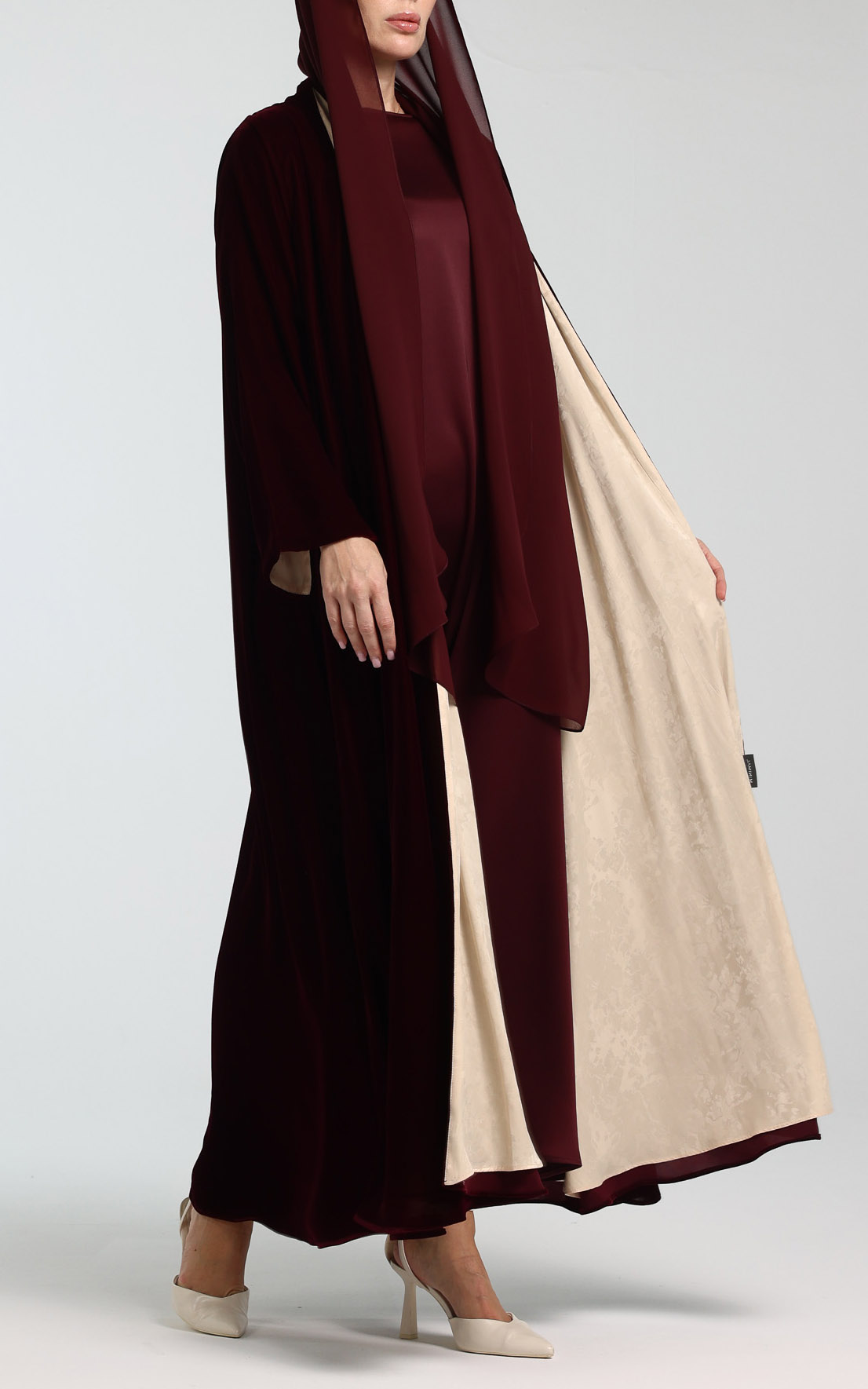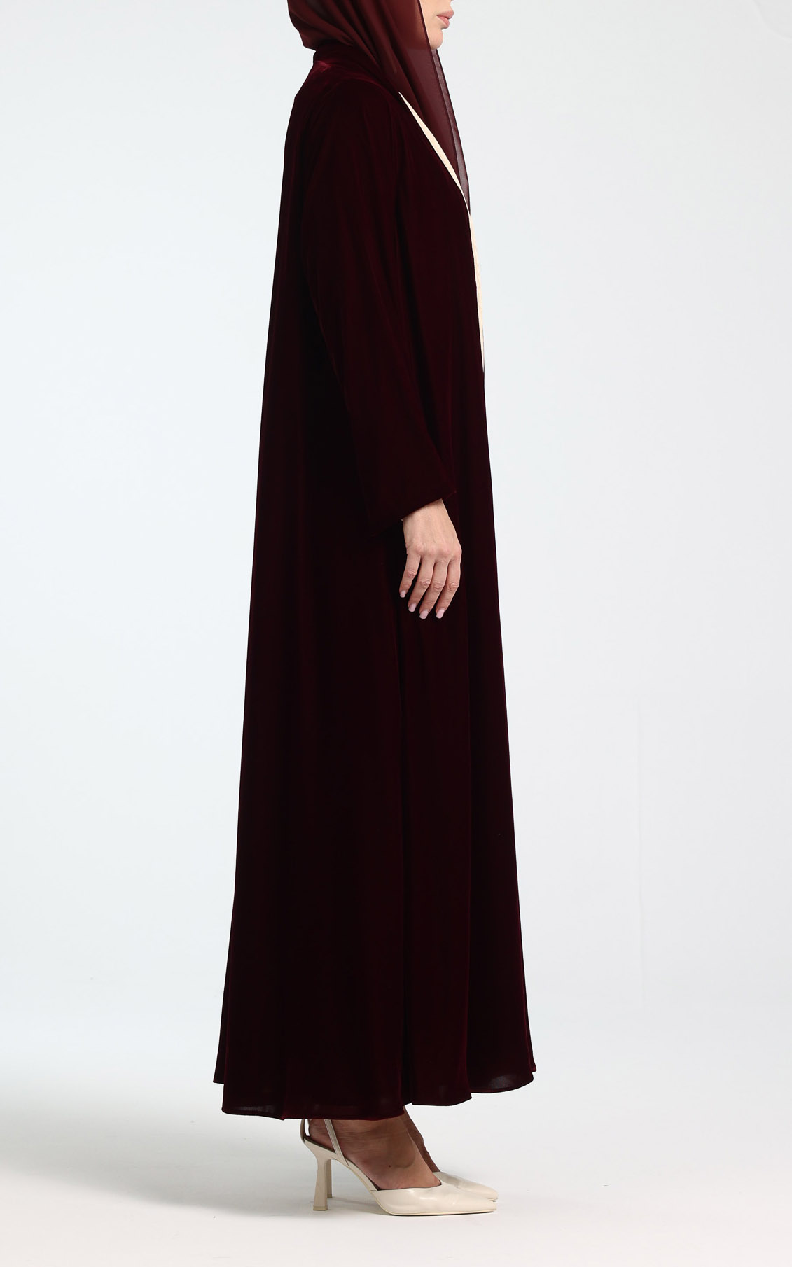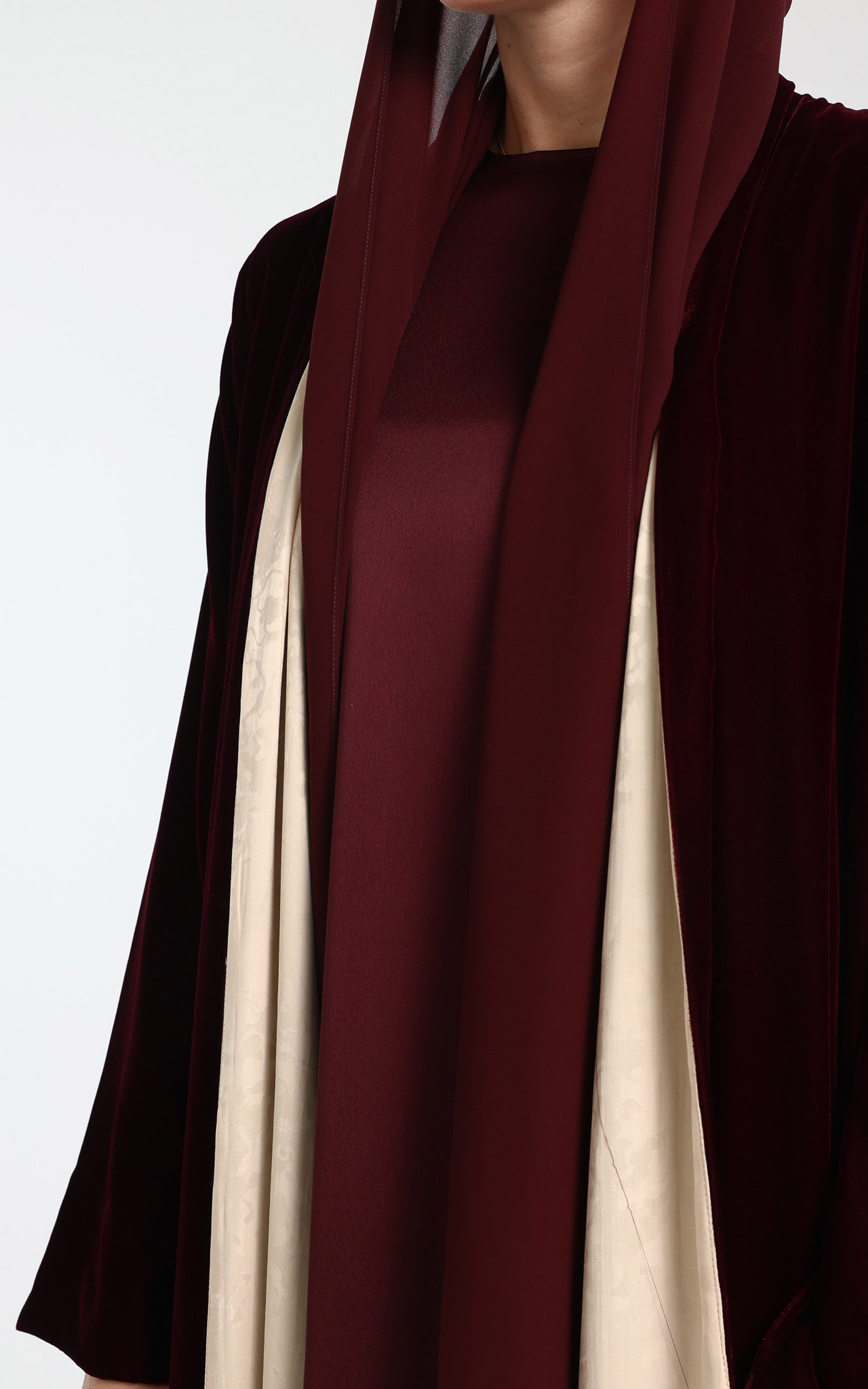 This timeless abaya features a sleek, flowing silhouette in a classic maroon tone, delivering a refined and versatile look. Accented with a contrasting beige lining, it adds a subtle touch of sophistication. The relaxed flare cut drapes gracefully, providing both comfort and modest coverage. Perfect for everyday wear or special occasions, this abaya creates a polished, layered appearance. Effortlessly elegant, it is a wardrobe essential for the modern, modest woman. The set comes complete with a matching scarf.