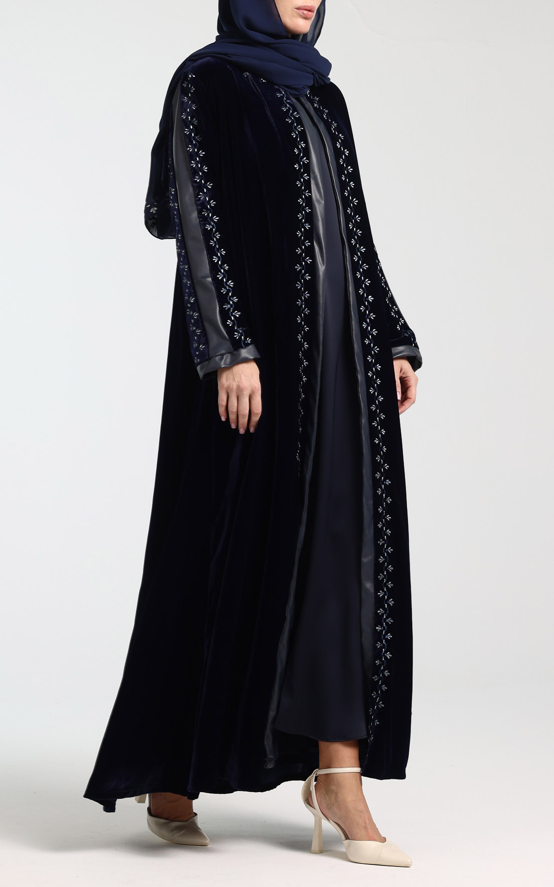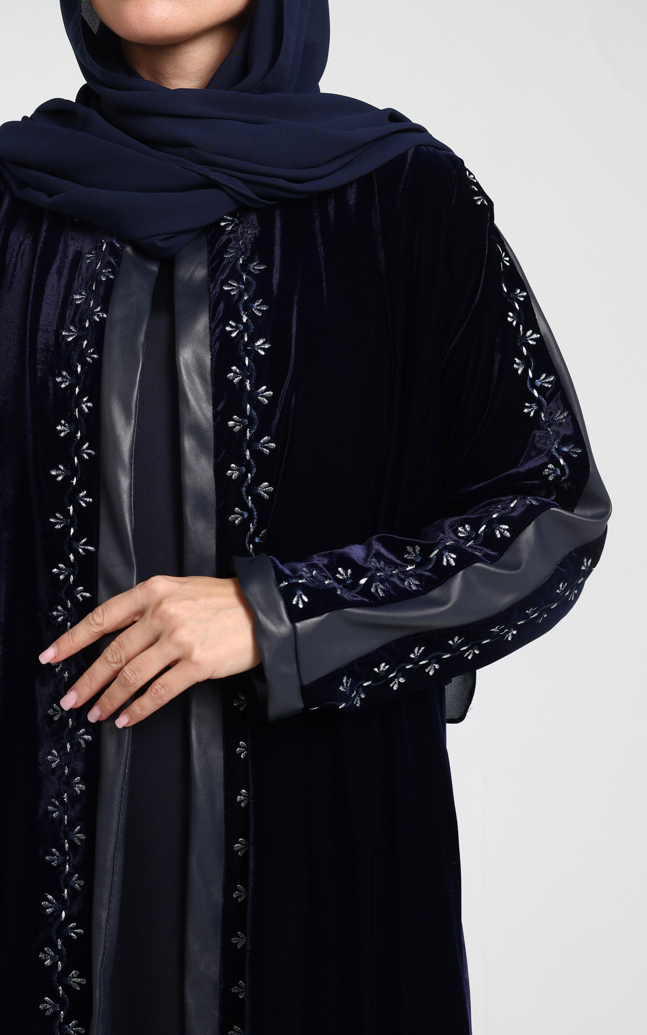 This Abaya is a timeless expression of elegance and modesty. Crafted in a rich deep navy tone, this full-length abaya features delicate vine-inspired embroidery running vertically along the front and sleeves, beautifully complemented by a sleek leather strip that enhances its refined, elongating silhouette. Designed with a smooth, structured front panel and softly tailored sleeves, it offers both comfort and effortless sophistication. The subtle embroidery adds a graceful finishing touch, making this abaya ideal for formal occasions, evening gatherings, or elevated everyday wear. Comes with a matching scarf for a coordinated and polished look.