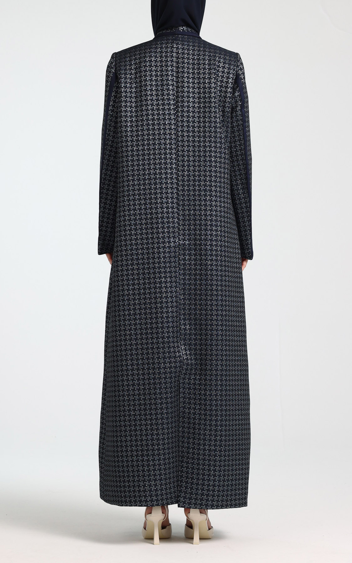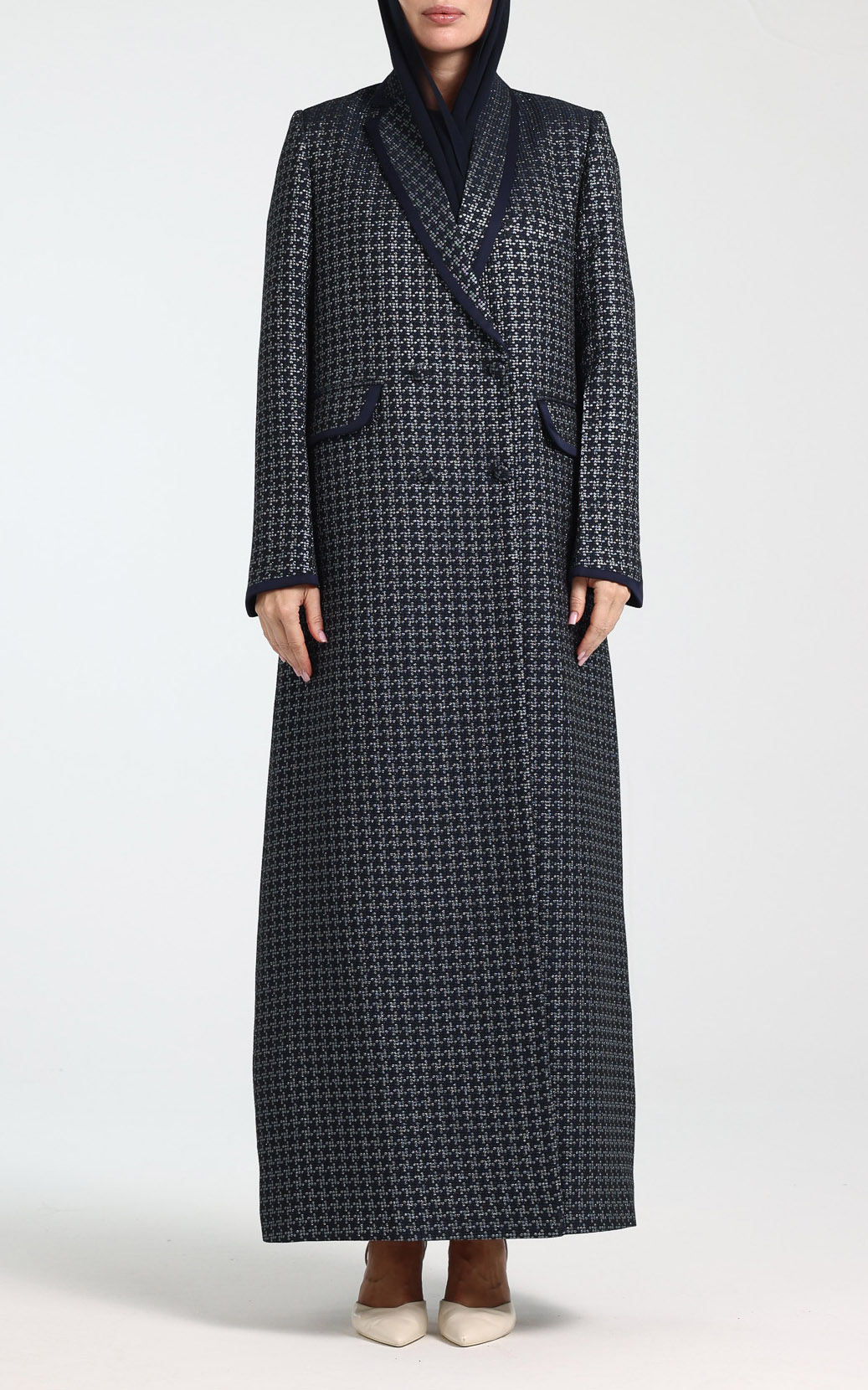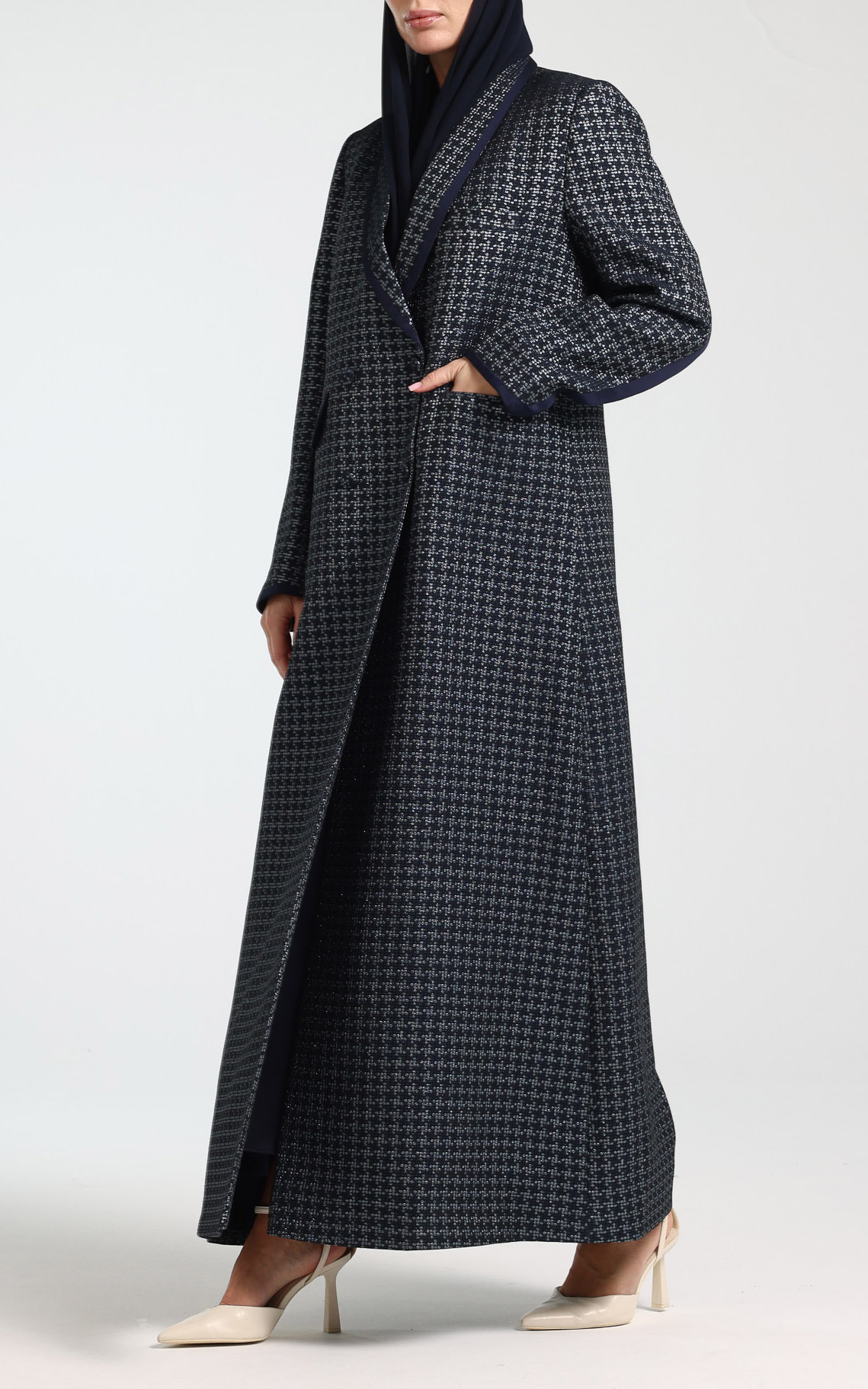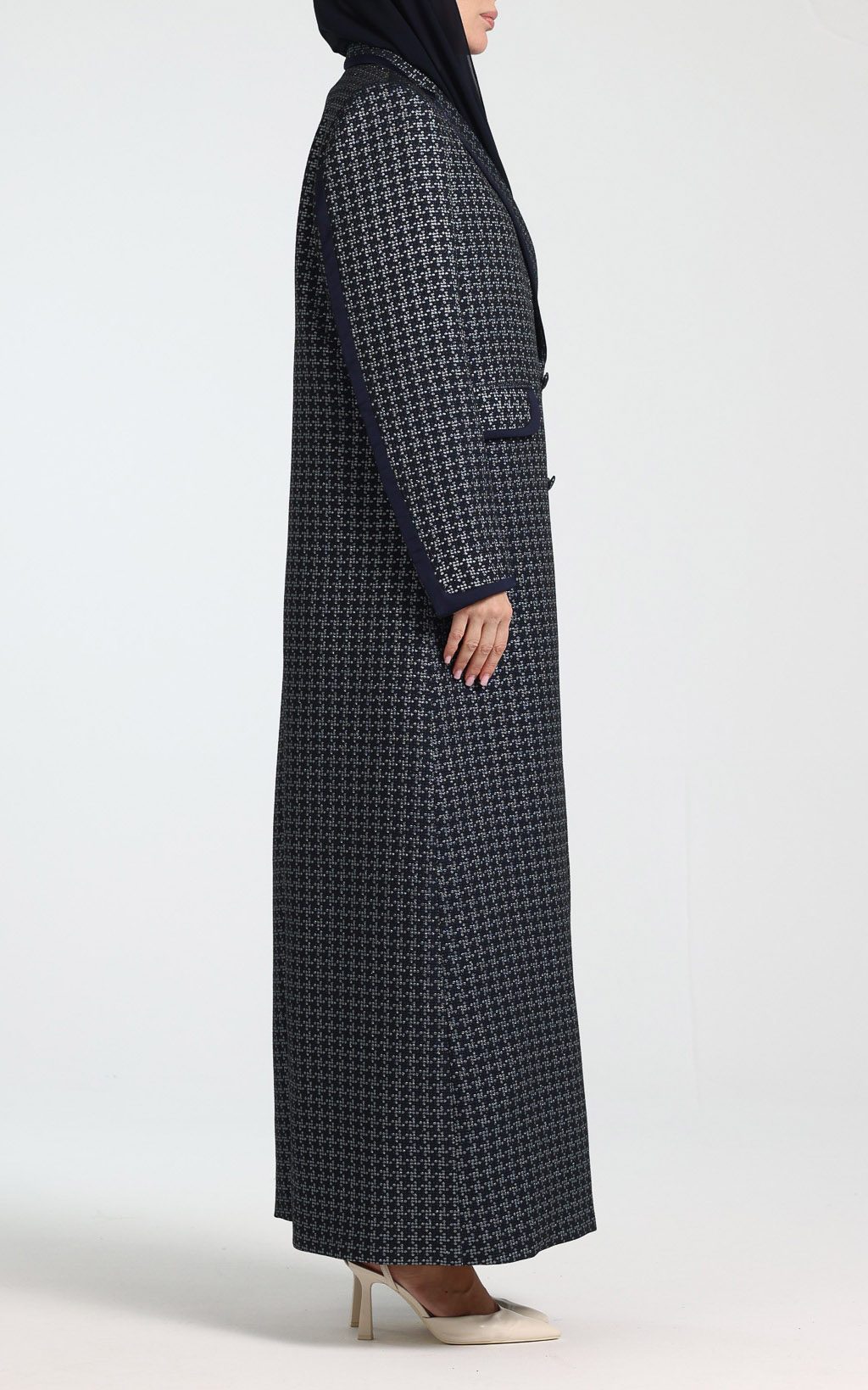 Elevate your modest wardrobe with this elegant blazer-style abaya, designed for a refined and contemporary look. Featuring a tailored, double-breasted silhouette, this abaya is crafted with a structured blazer-inspired front and a sleek lapel that adds a touch of sophistication. The Jacquard fabric showcases a timeless pattern, giving depth, texture, and a luxurious finish. Functional front pockets enhance practicality without compromising style, while the full-length design creates a flattering, elongated fit. The abaya comes complete with a perfectly matching scarf, allowing for a coordinated and effortlessly polished ensemble. Ideal for work, formal gatherings, or elevated everyday wear, this blazer abaya blends classic tailoring with modern modest fashion.