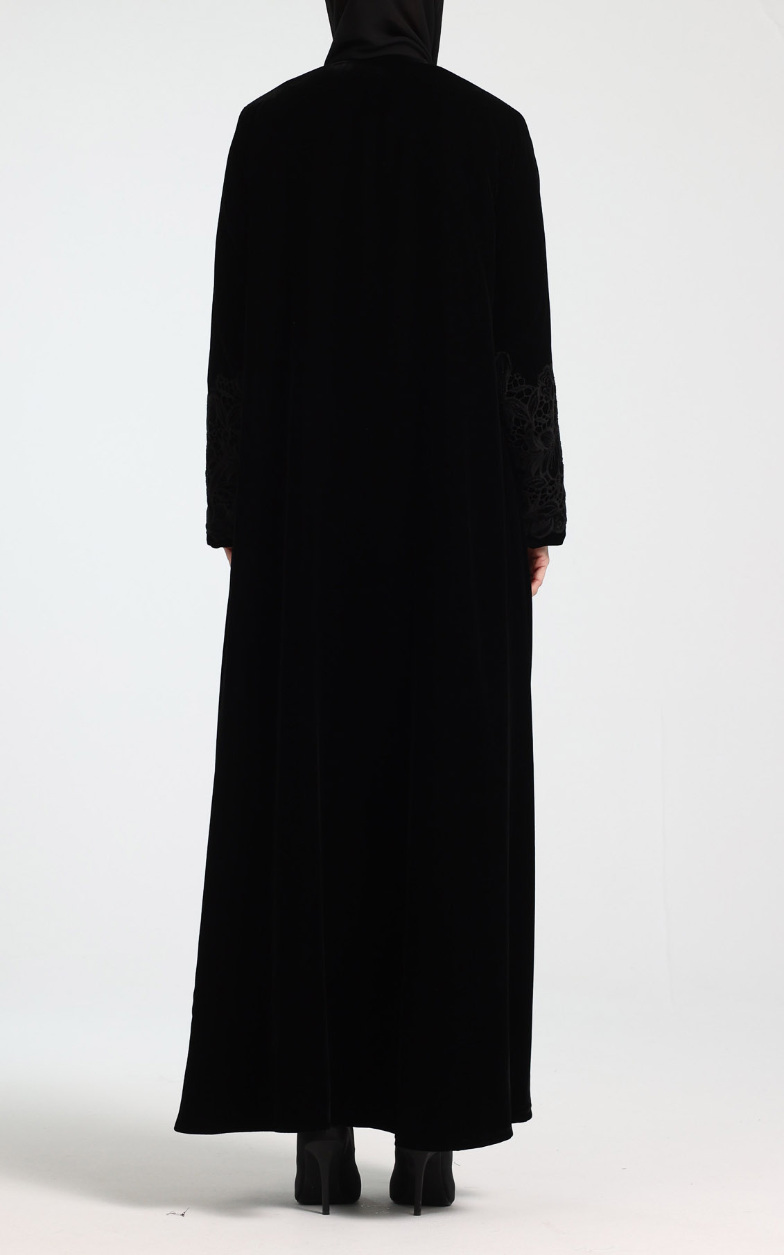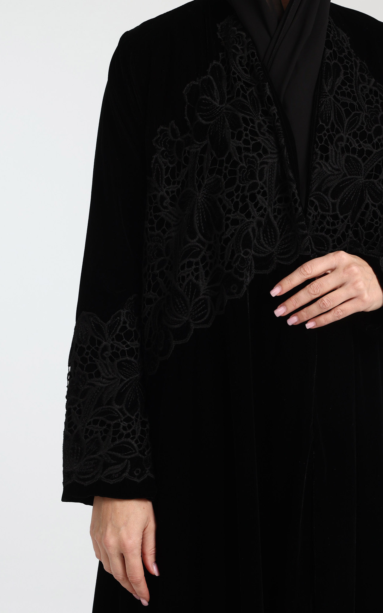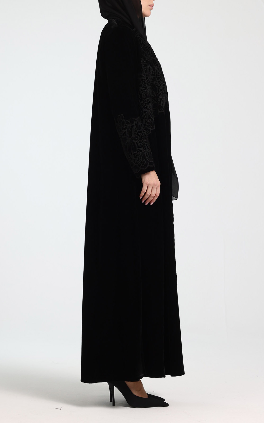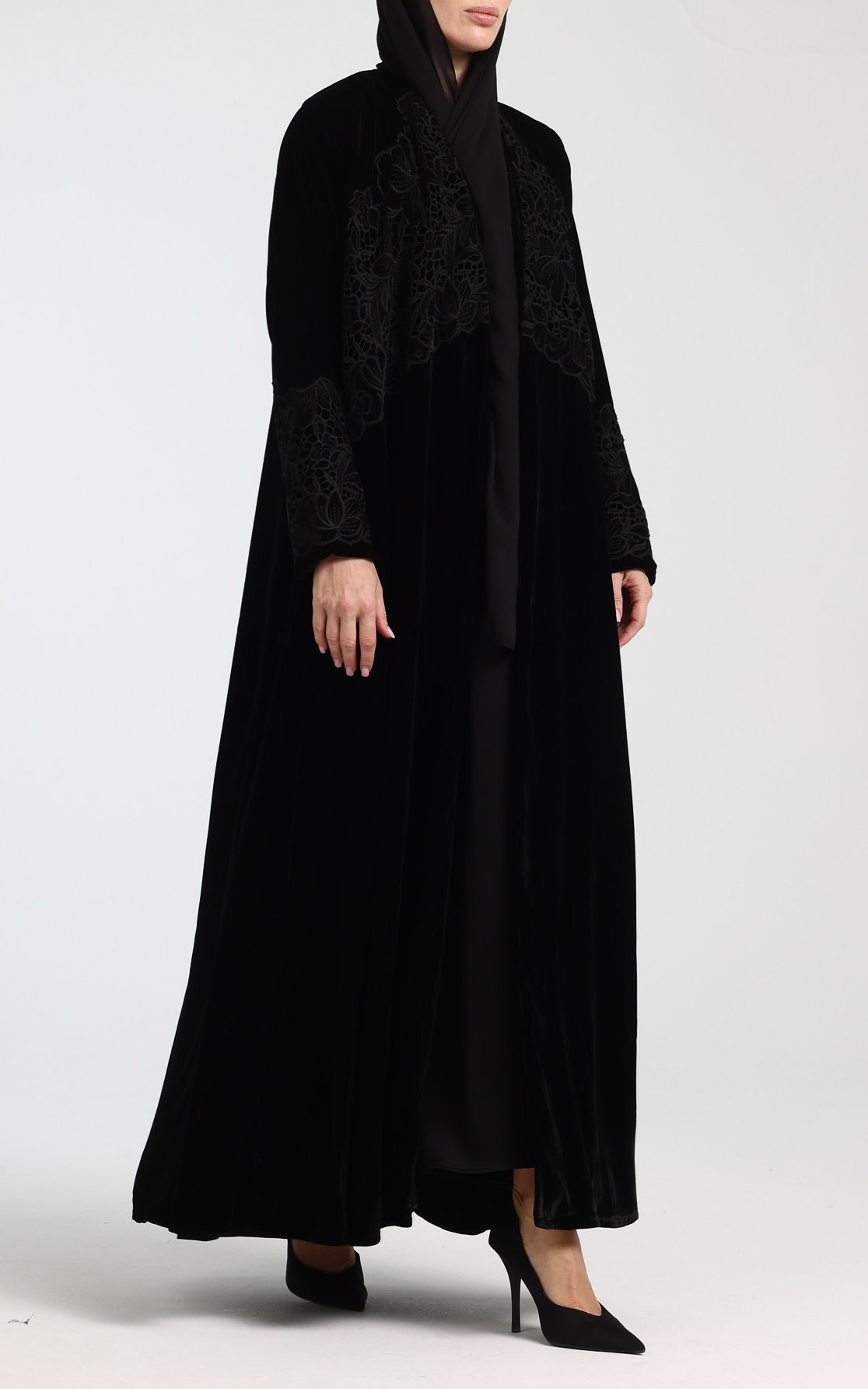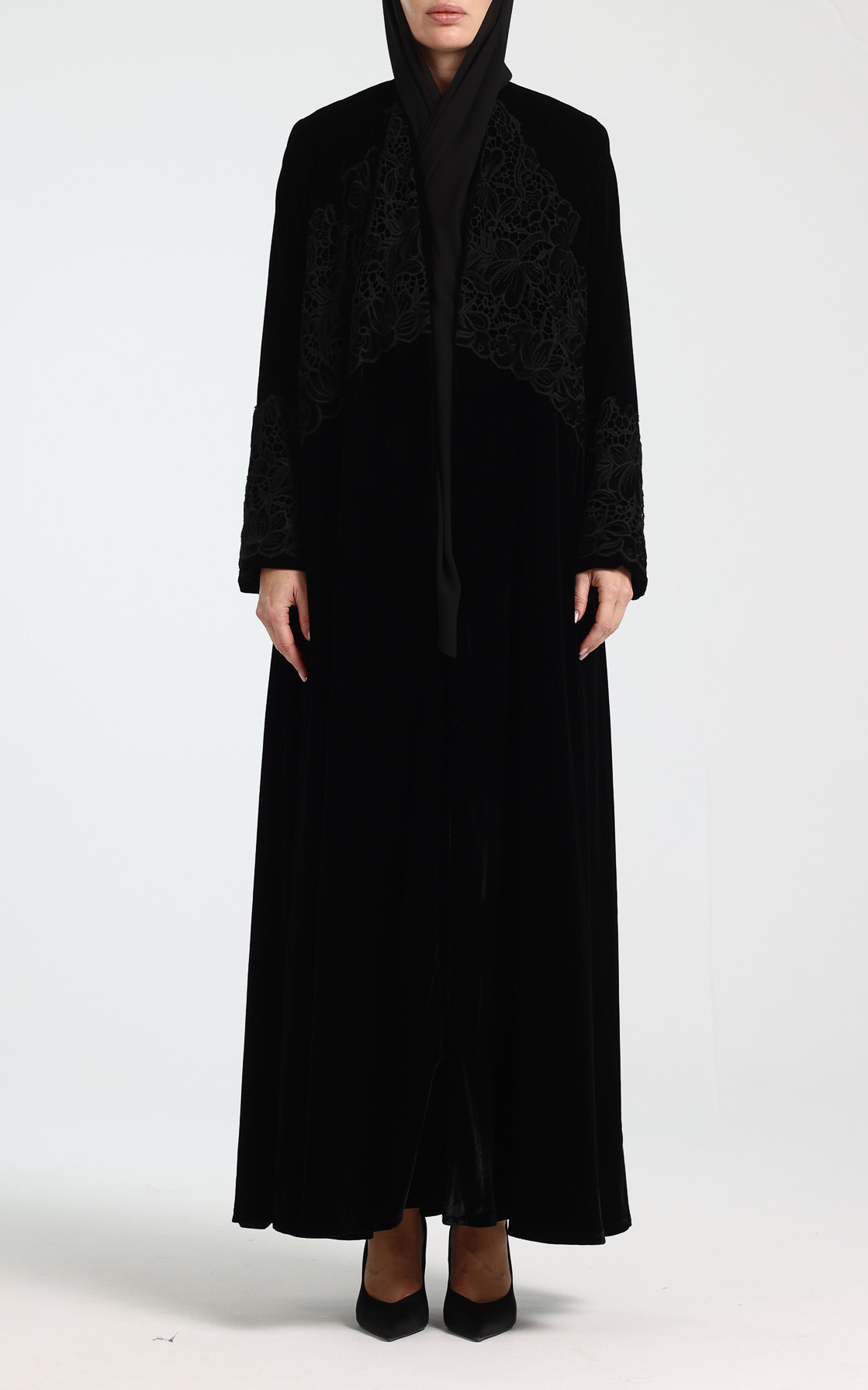 This elegant velvet abaya is designed to make a timeless statement with understated luxury. Crafted from rich, soft velvet, it features delicate guipure lace detailing on the chest and sleeves, adding depth and feminine sophistication. Designed in a graceful klosh (A-line) silhouette, the abaya flows beautifully with every movement while offering a flattering and comfortable fit. The full-length design enhances its refined appeal, making it ideal for evening wear, special occasions, and formal gatherings. The look is completed with a perfectly matching scarf, ensuring a polished and coordinated ensemble. Classic, luxurious, and effortlessly elegant, this abaya is a standout addition to any refined wardrobe.