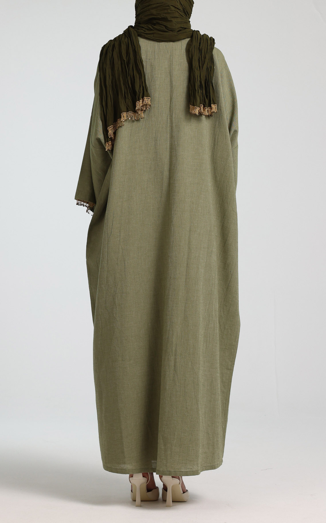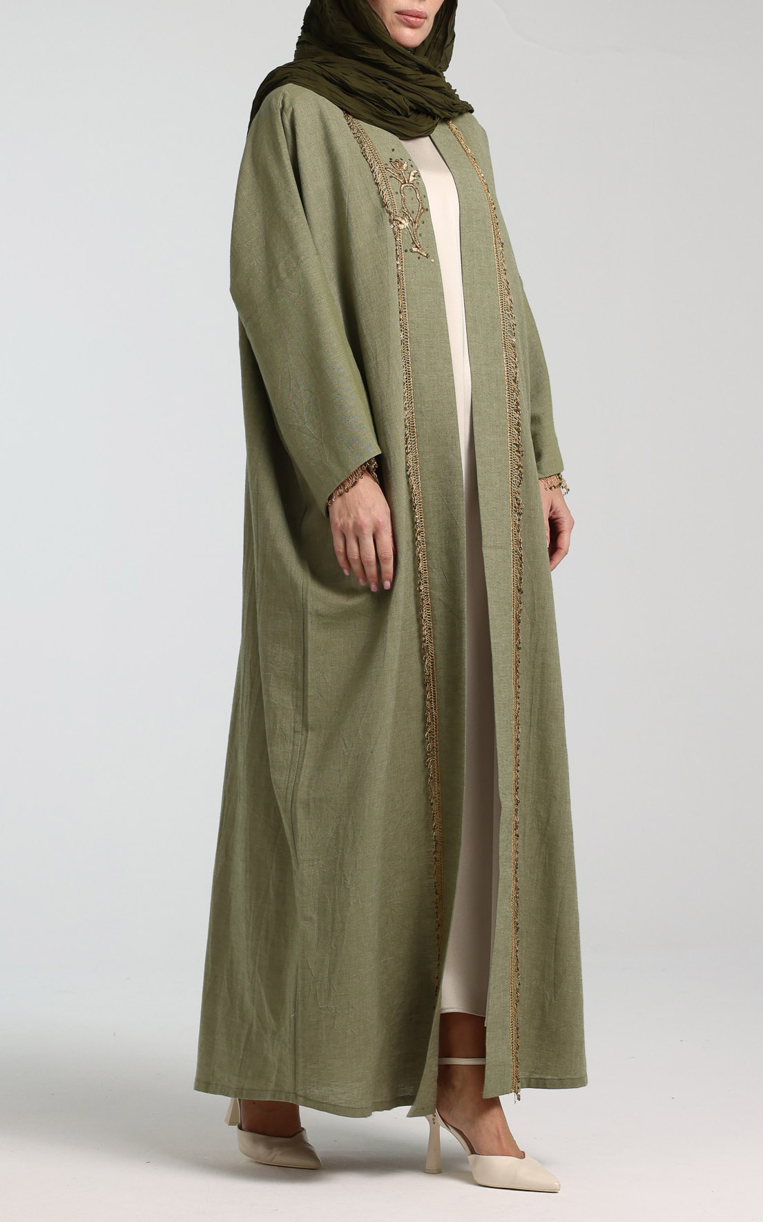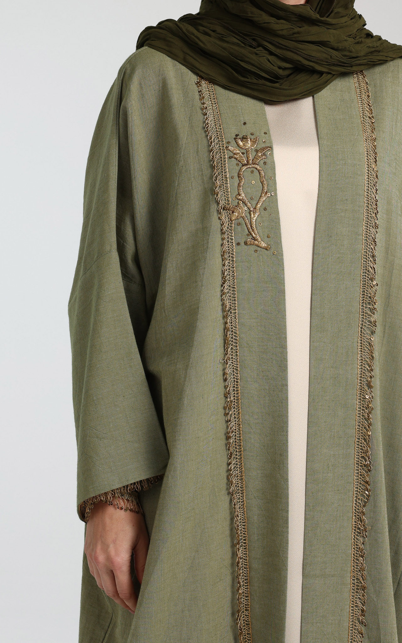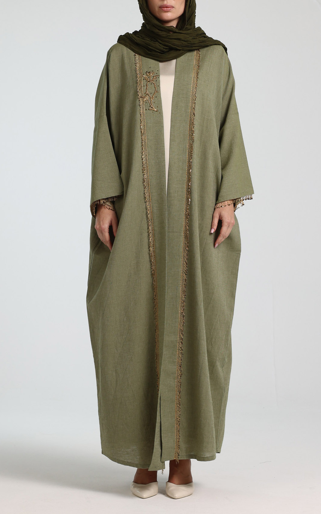 This elegant open-front abaya is crafted from soft sage green linen, offering a refined and timeless look. It features delicate gold embroidery running along the front panels and cuffs, enhanced with subtle gold sequins for a graceful shimmer. The relaxed, flowing silhouette ensures comfort while maintaining a sophisticated drape, making it perfect for both everyday wear and special occasions. Finished with fine detailing and a clean, minimal design, this piece effortlessly blends modesty with luxury.Comes with a creased scarf with hanging sequins on two of the edges.