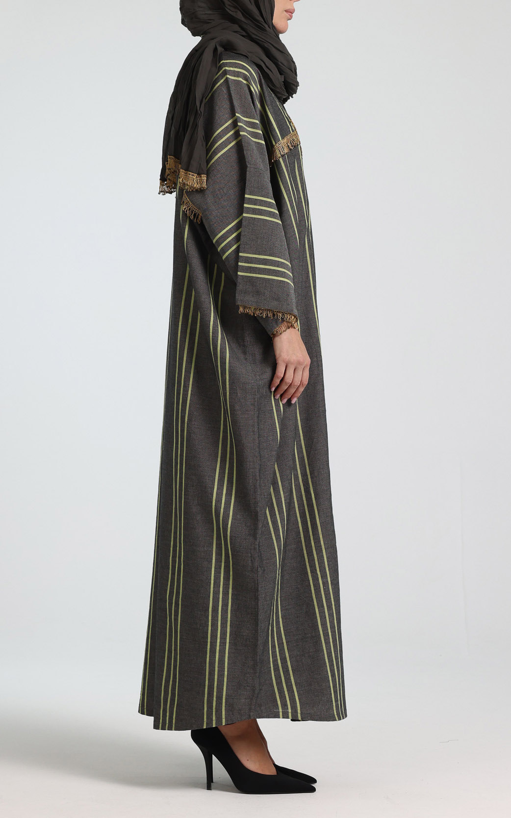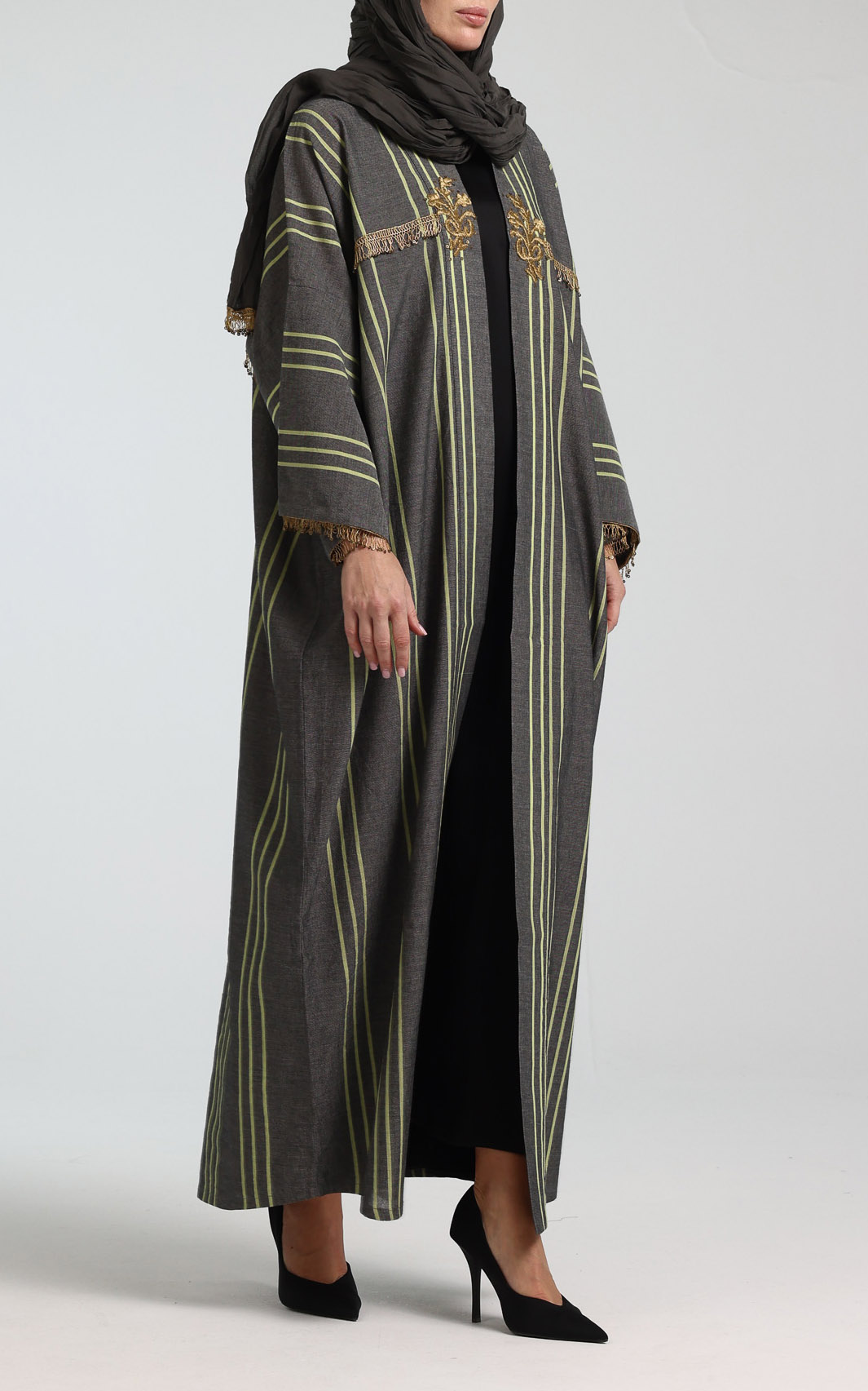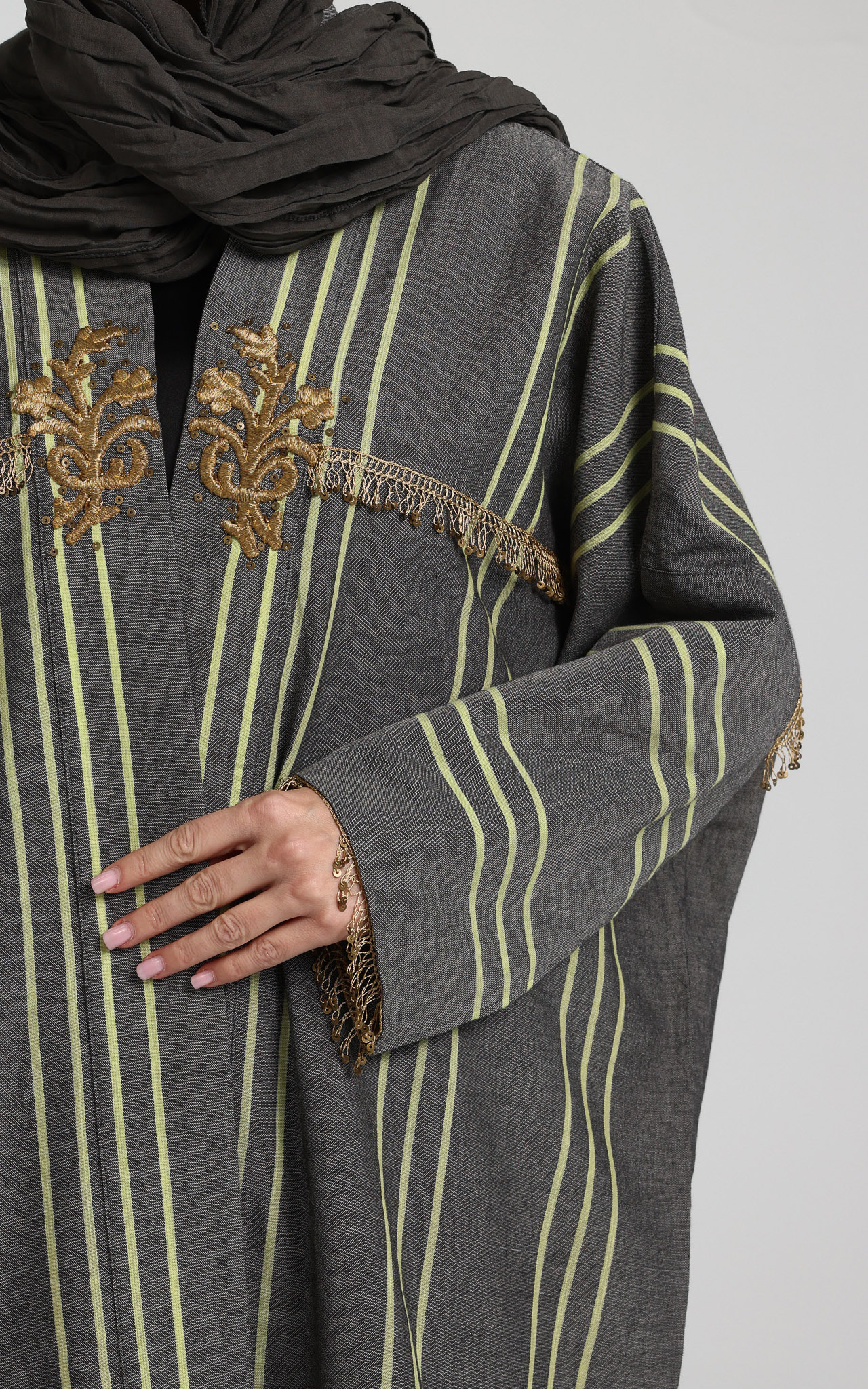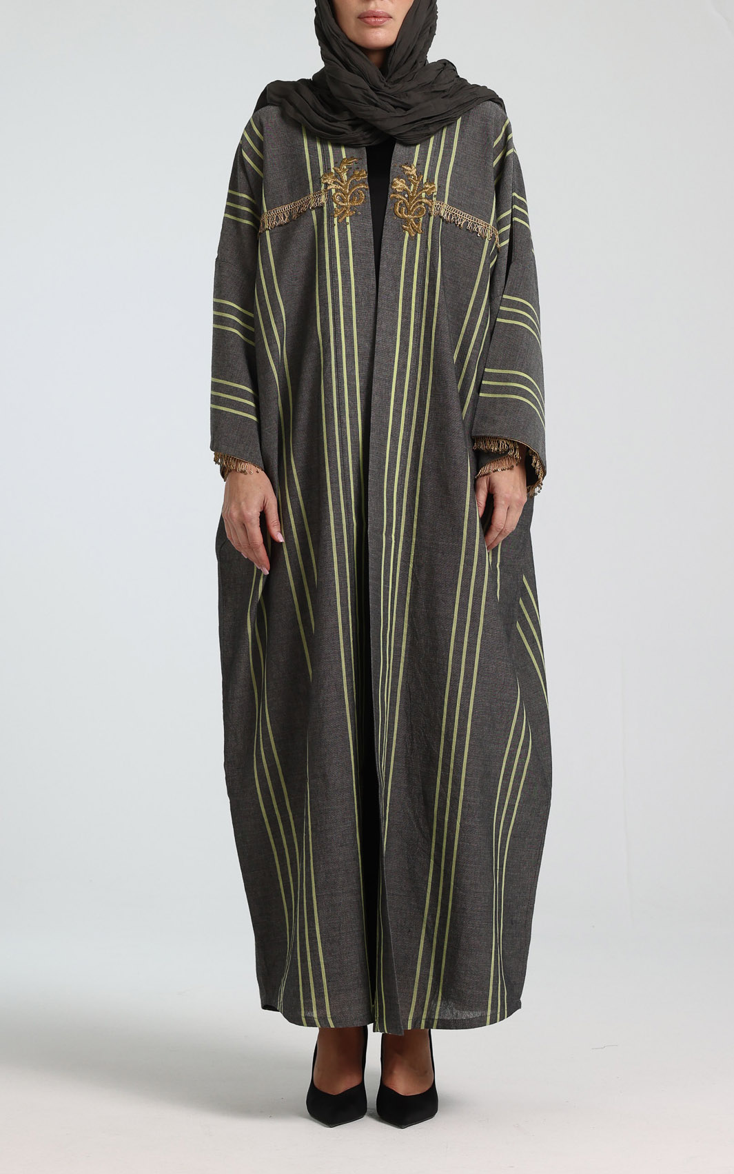 This elegant abaya showcases a timeless charcoal-grey base, beautifully accented with refined vertical striping in soft lime-green tones that create a flattering, elongating silhouette. The open-front design is elevated by intricate gold embroidery at the upper bodice, adding a luxurious, artisanal touch. Delicate sequin fringe trim across the chest and cuffs introduces subtle texture and a hint of shimmer. Designed with long, relaxed sleeves and a graceful, flowing cut, this abaya offers effortless comfort without compromising on sophistication. Its structured yet fluid drape makes it ideal for formal occasions, special gatherings, or elevated everyday wear, and it layers seamlessly over a simple inner dress for a polished, refined finish. Comes with a creased scarf with hanging sequins on two of the edges.