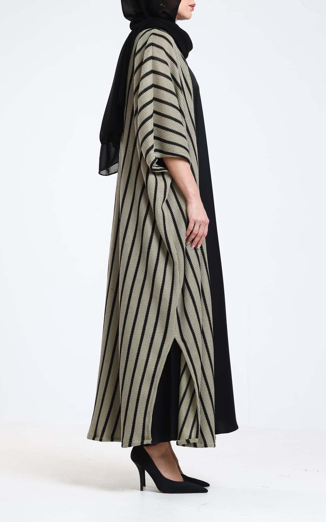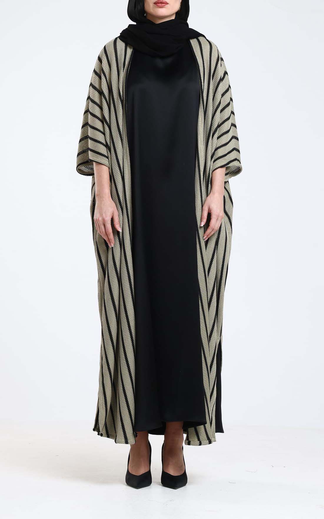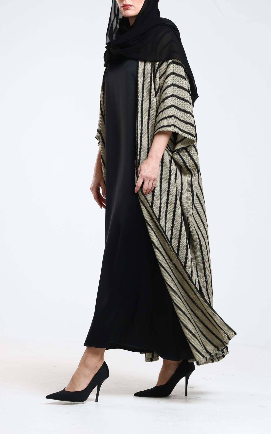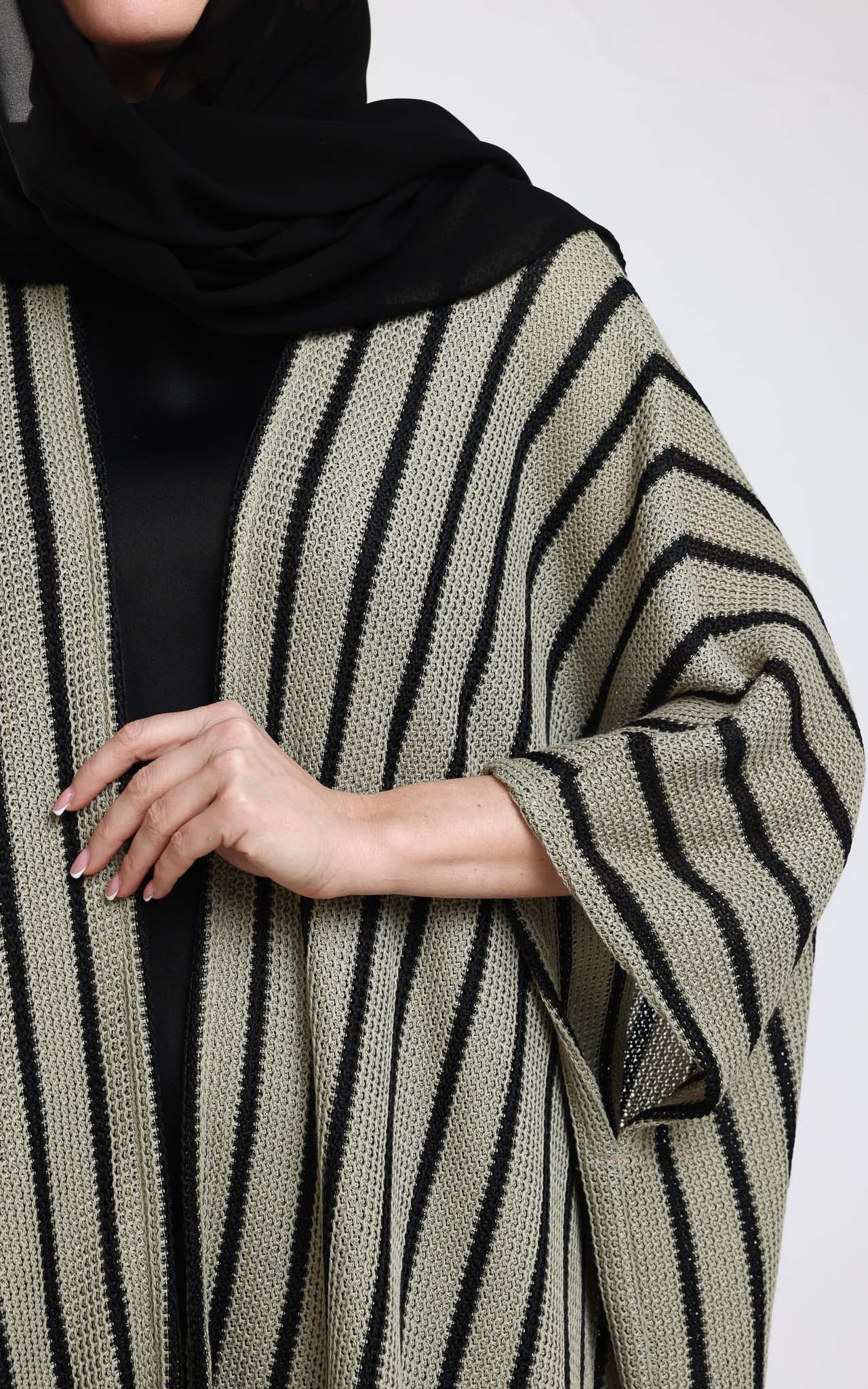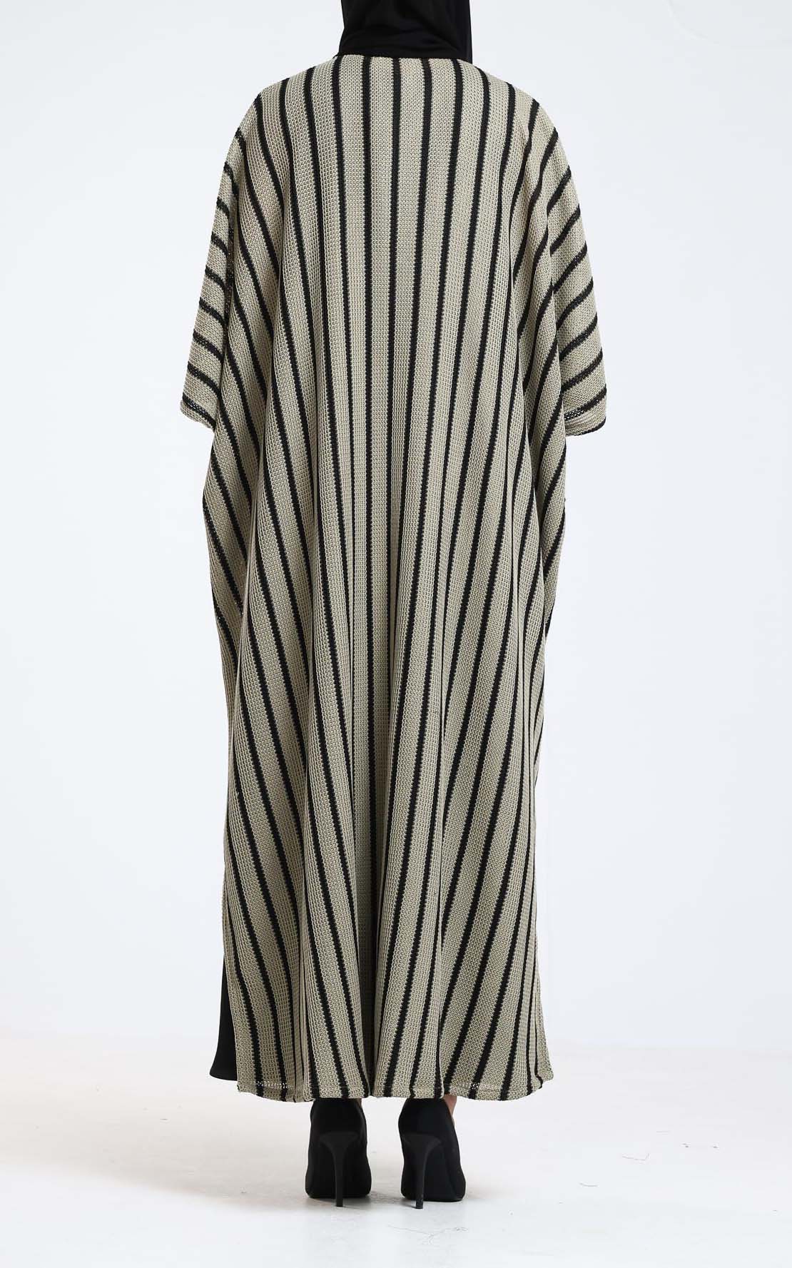 Experience modern elegance with this beautifully crafted knitted abaya, featuring a dynamic black-and-beige striped design that naturally elongates the figure. The soft knit fabric offers a comfortable, lightweight feel while adding subtle texture for a refined finish. Designed with wide, relaxed sleeves and an open-front silhouette, it drapes smoothly over any outfit, making it a versatile piece for both casual and elevated looks. Comes with scarf. Its flowing structure and striking pattern make it a standout layering essential—perfect for effortless style from day to night.