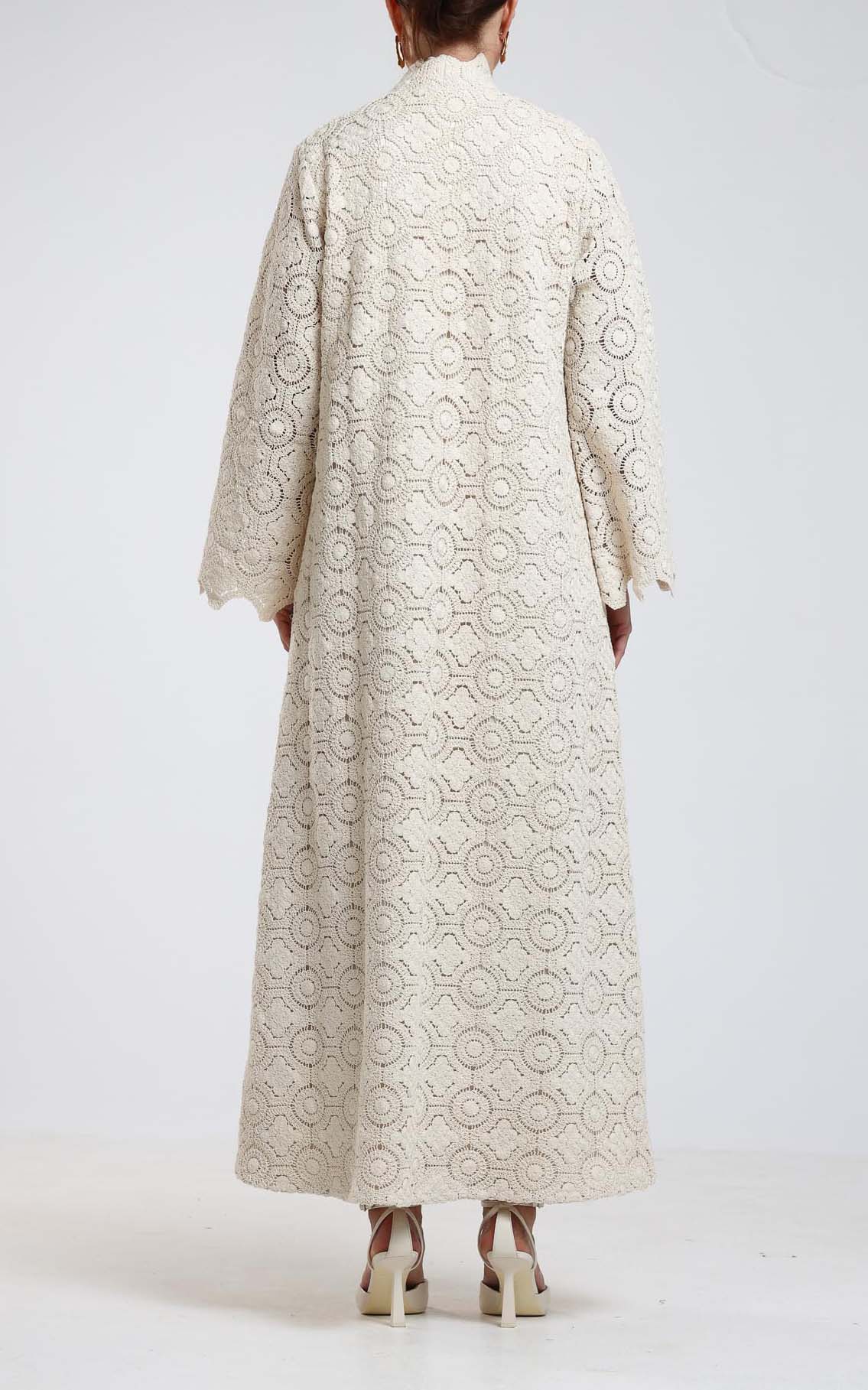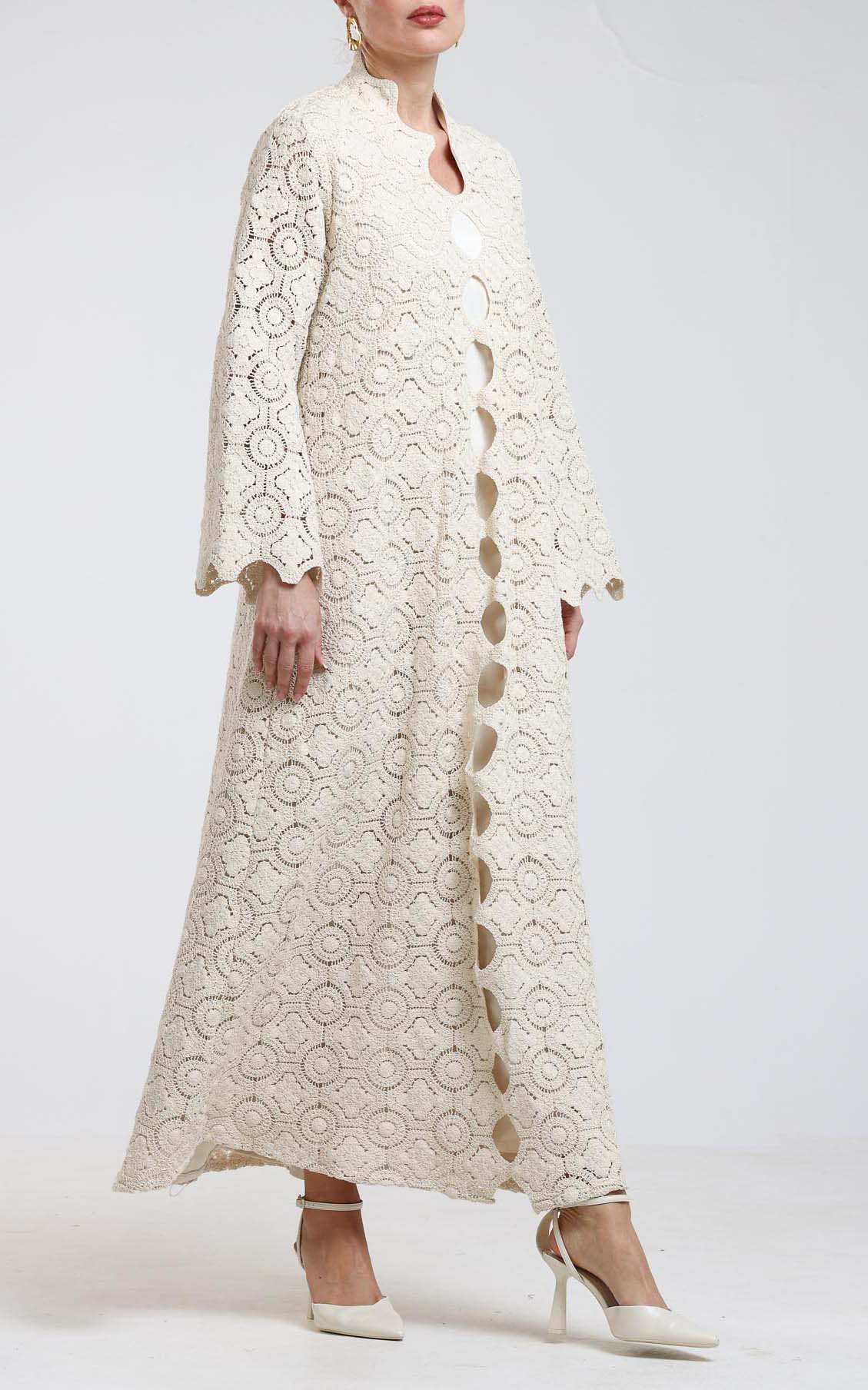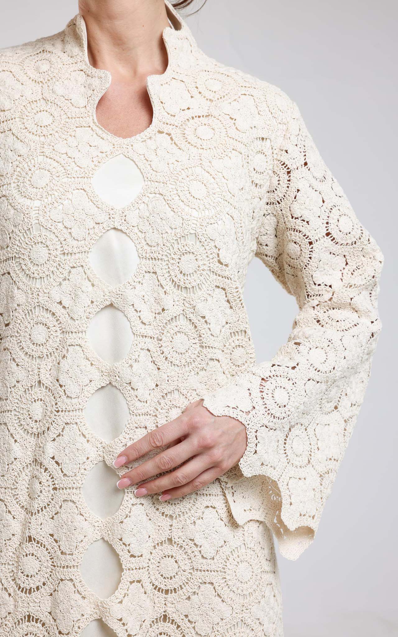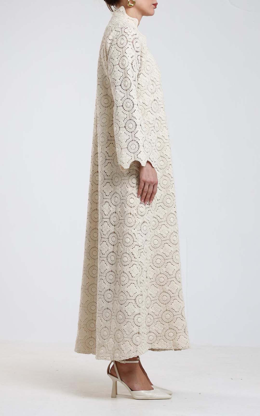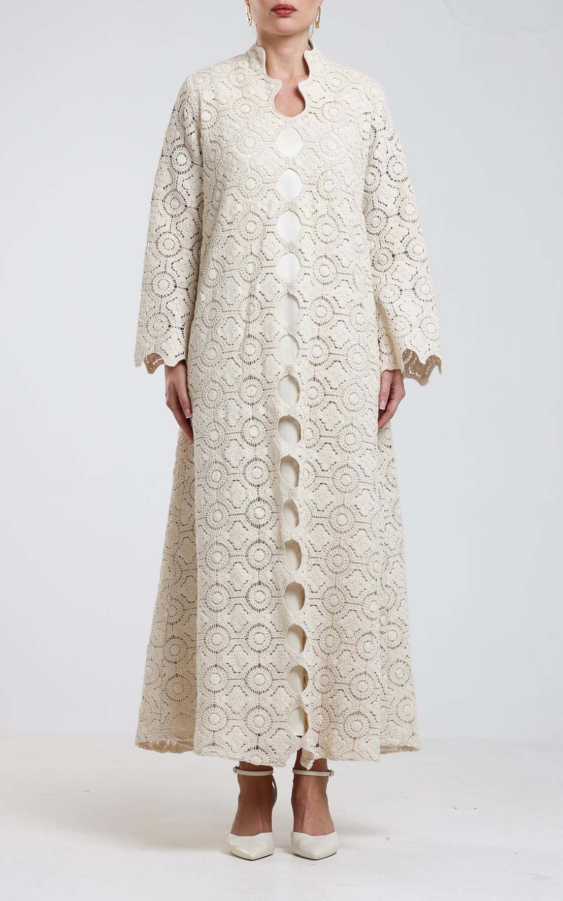 • This dress is a refined statement of elegance, crafted from luxurious guipure lace that showcases intricate patterns and a beautifully textured finish. Designed in a soft, timeless tone, it features a flowing silhouette that drapes gracefully for a sophisticated and elongated look. The design is elevated by a distinctive front detail of circular cutouts that run vertically, adding a modern artistic touch while enhancing the delicate beauty of the lace. The structured neckline brings a polished feel, while the long sleeves with subtly detailed edges complete the look with understated refinement. Richly textured, this piece is perfect for special occasions, elegant gatherings, and refined evening wear. A timeless design for women who appreciate fine craftsmanship, distinctive details, and effortless sophistication.