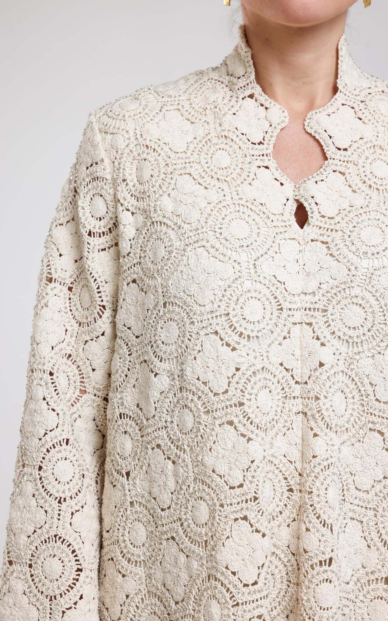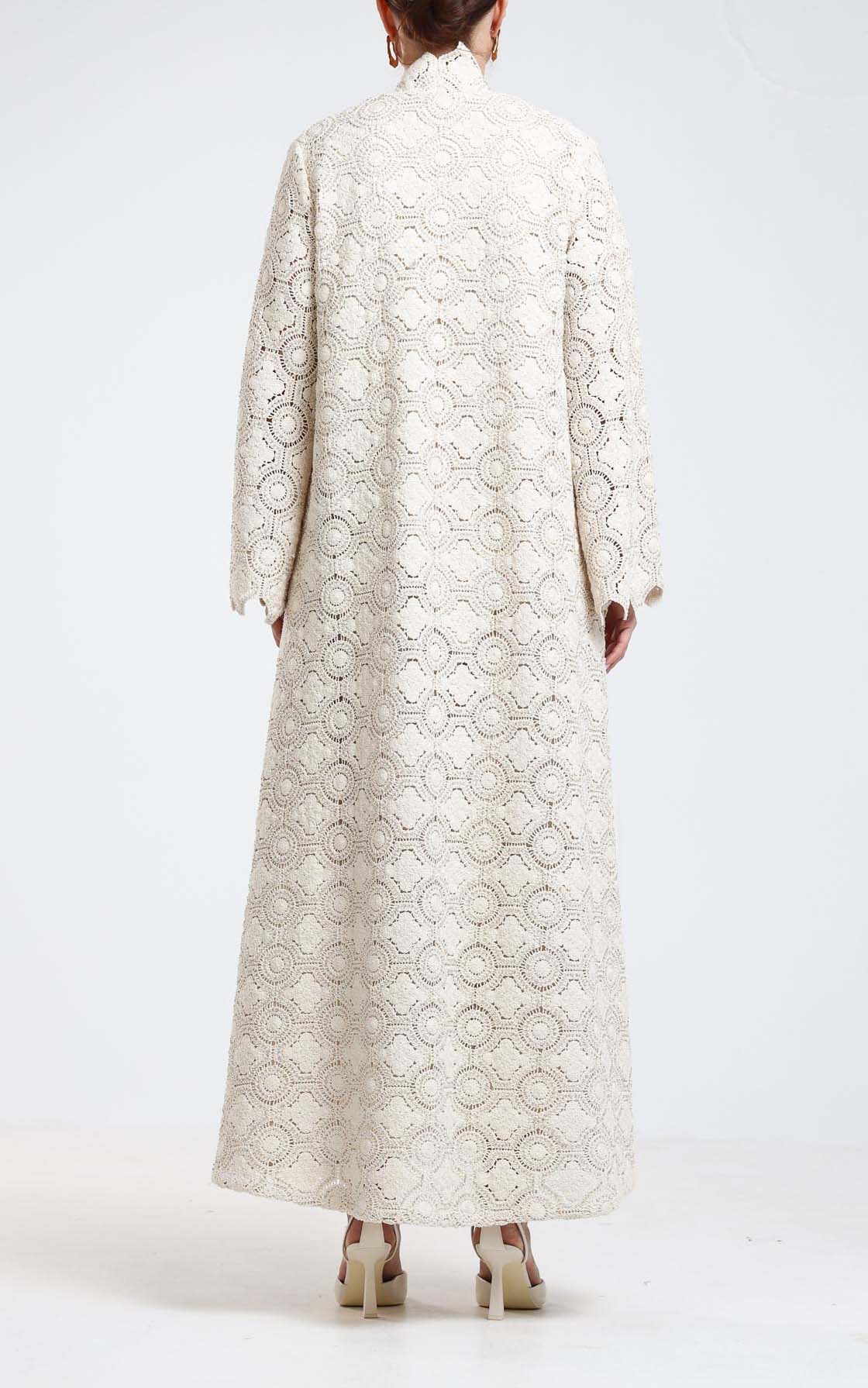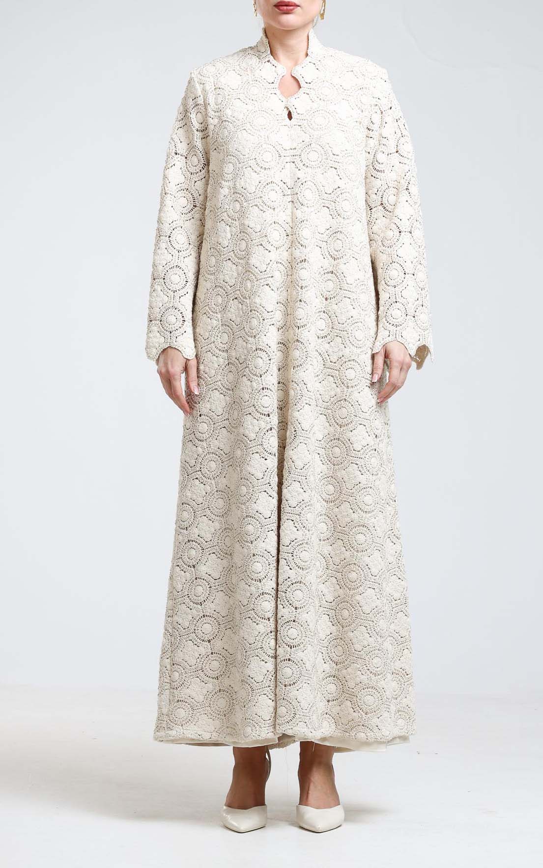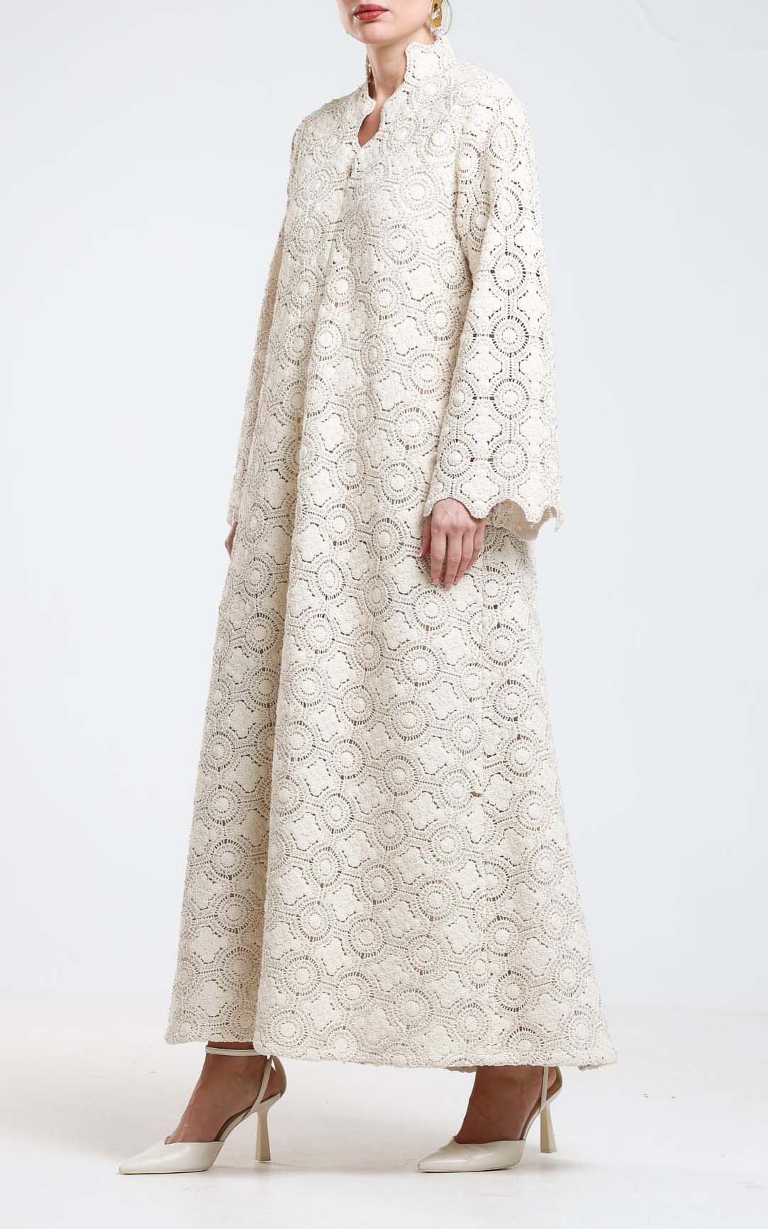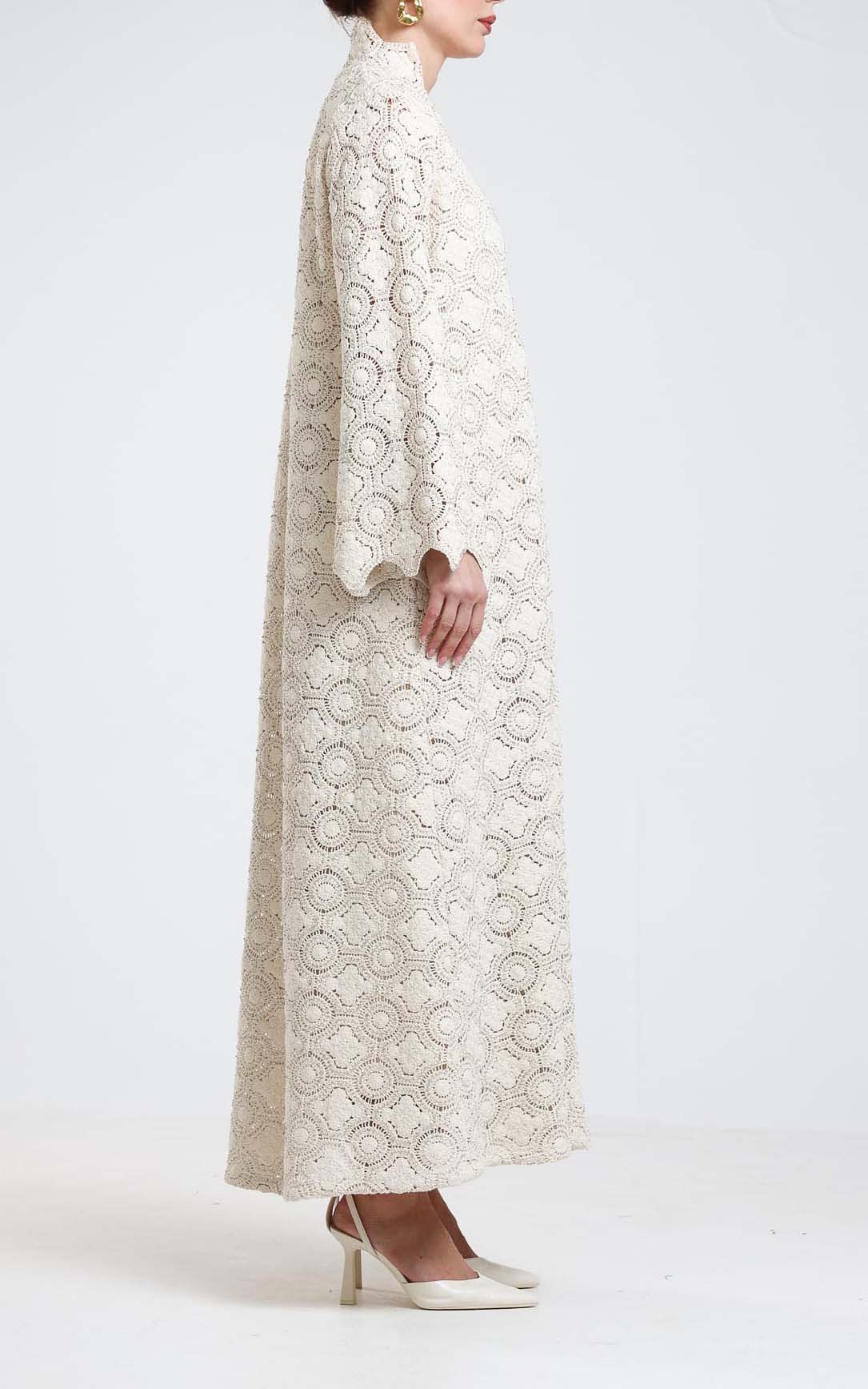 This dress is a delicate expression of timeless elegance, crafted from luxurious guipure lace fabric adorned with subtle bead embellishments. Designed in a soft, refined tone, it features an intricate circular lace pattern that creates depth and texture while maintaining a light, graceful appearance. The silhouette is relaxed and flowing, offering both comfort and sophistication. The structured neckline adds a polished touch, while the long sleeves enhance its modest and refined character. The delicate beading woven throughout the guipure lace catches the light gently, adding a soft shimmer without overwhelming the design. Perfect for special occasions, daytime celebrations, and elegant gatherings, this dress embodies feminine grace and artisanal craftsmanship. A refined choice for women who appreciate intricate detailing, classic silhouettes, and understated luxury.