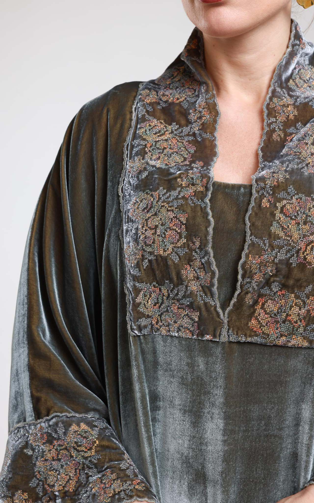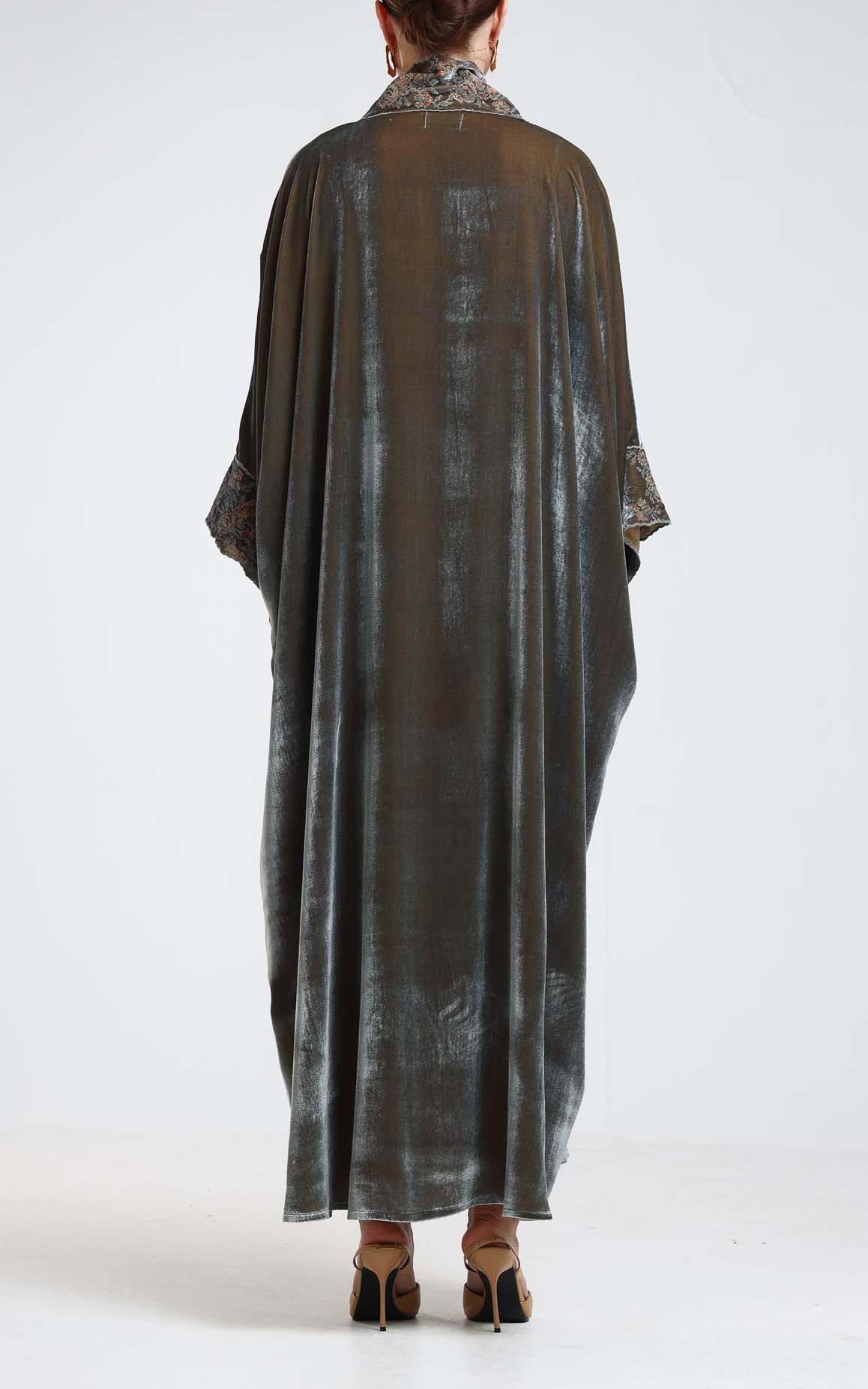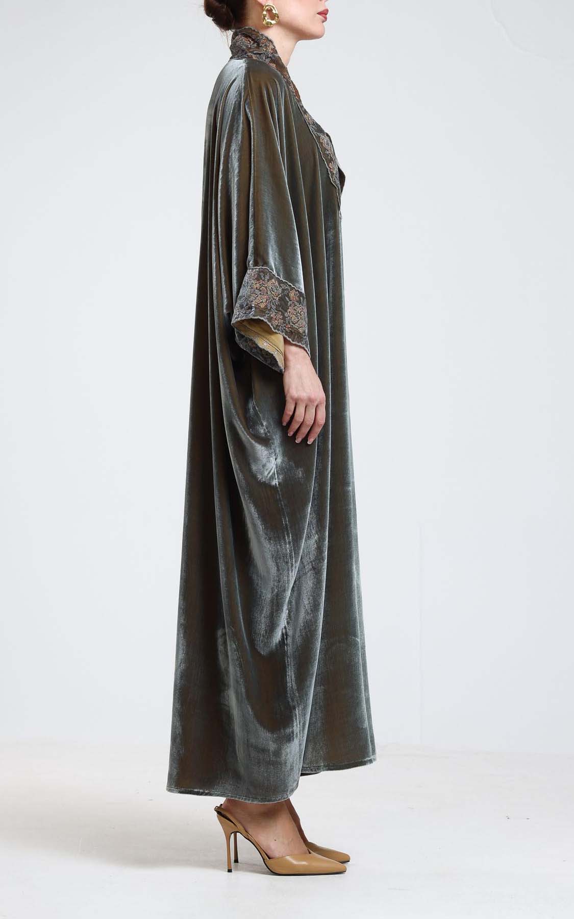 This kaftan is a timeless expression of elegance, crafted from luxurious French velvet that offers a rich texture and a soft, luminous sheen. Designed in a deep, refined tone, it features a flowing silhouette that drapes gracefully, creating a sophisticated and elongated look. The design is beautifully enhanced with intricate embroidered detailing along the front panel and sleeve cuffs, adding depth, artistry, and a touch of heritage-inspired charm. The embroidery introduces subtle color and texture contrast, elevating the richness of the velvet while maintaining an overall sense of understated luxury. With its wide sleeves, fluid structure, and refined craftsmanship, this kaftan is perfect for special occasions, evening gatherings, and elegant daytime wear. A distinguished piece for women who appreciate classic sophistication, luxurious fabrics, and finely crafted details.