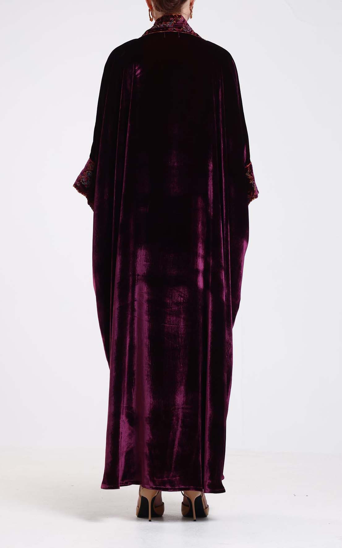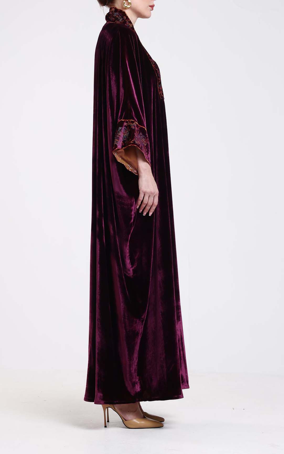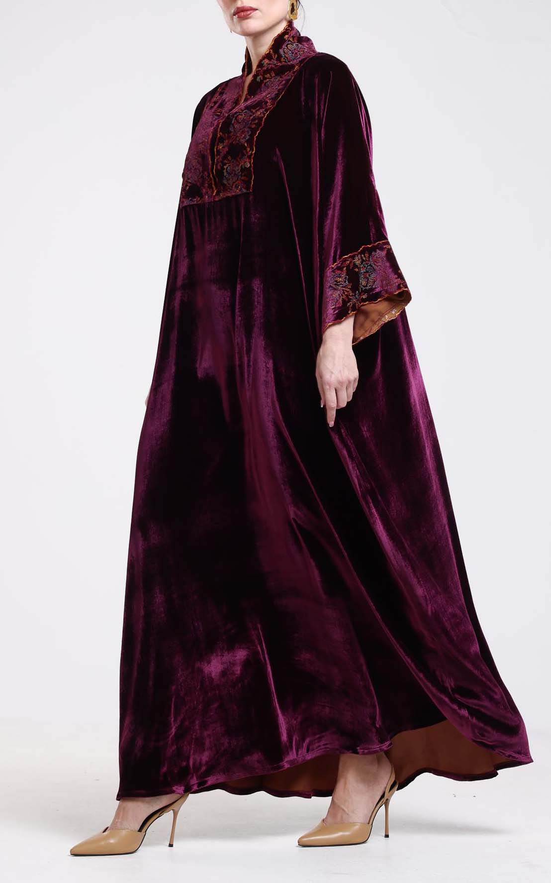 This kaftan is a timeless expression of elegance, crafted from luxurious French velvet that offers a rich texture and a soft, luminous sheen. Designed in a deep, refined tone, it features a flowing silhouette that drapes gracefully, creating a sophisticated and elongated look. The design is beautifully enhanced with intricate embroidered detailing along the front panel and sleeve cuffs, adding depth, artistry, and a touch of heritage-inspired charm. The embroidery introduces subtle color and texture contrast, elevating the richness of the velvet while maintaining an overall sense of understated luxury. With its wide sleeves, fluid structure, and refined craftsmanship, this kaftan is perfect for special occasions, evening gatherings, and elegant daytime wear. A distinguished piece for women who appreciate classic sophistication, luxurious fabrics, and finely crafted details.